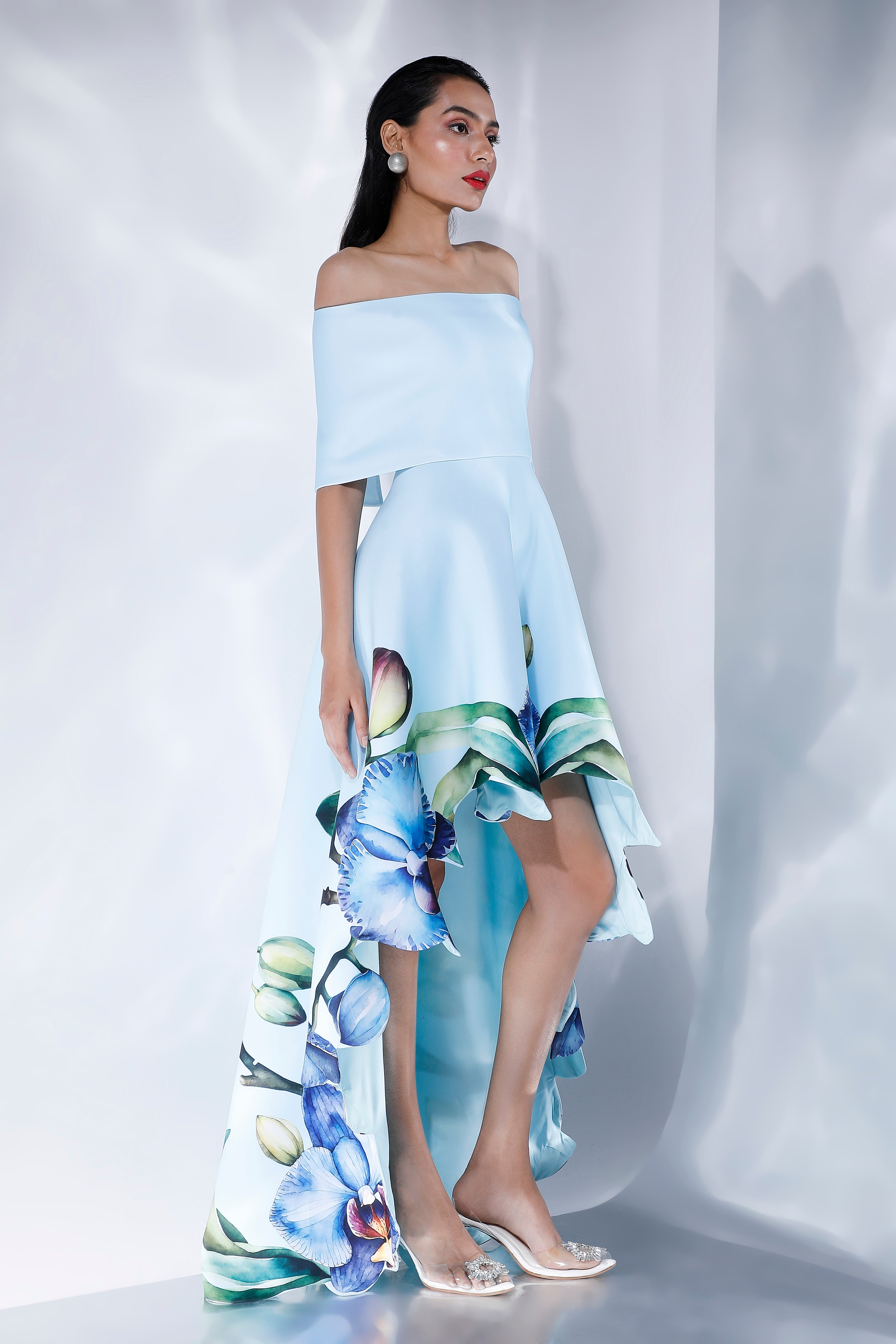 The Oriana dress embodies elegance with its intricate floral design, emphasised with cutwork around the hem and a flowing high-low silhouette.