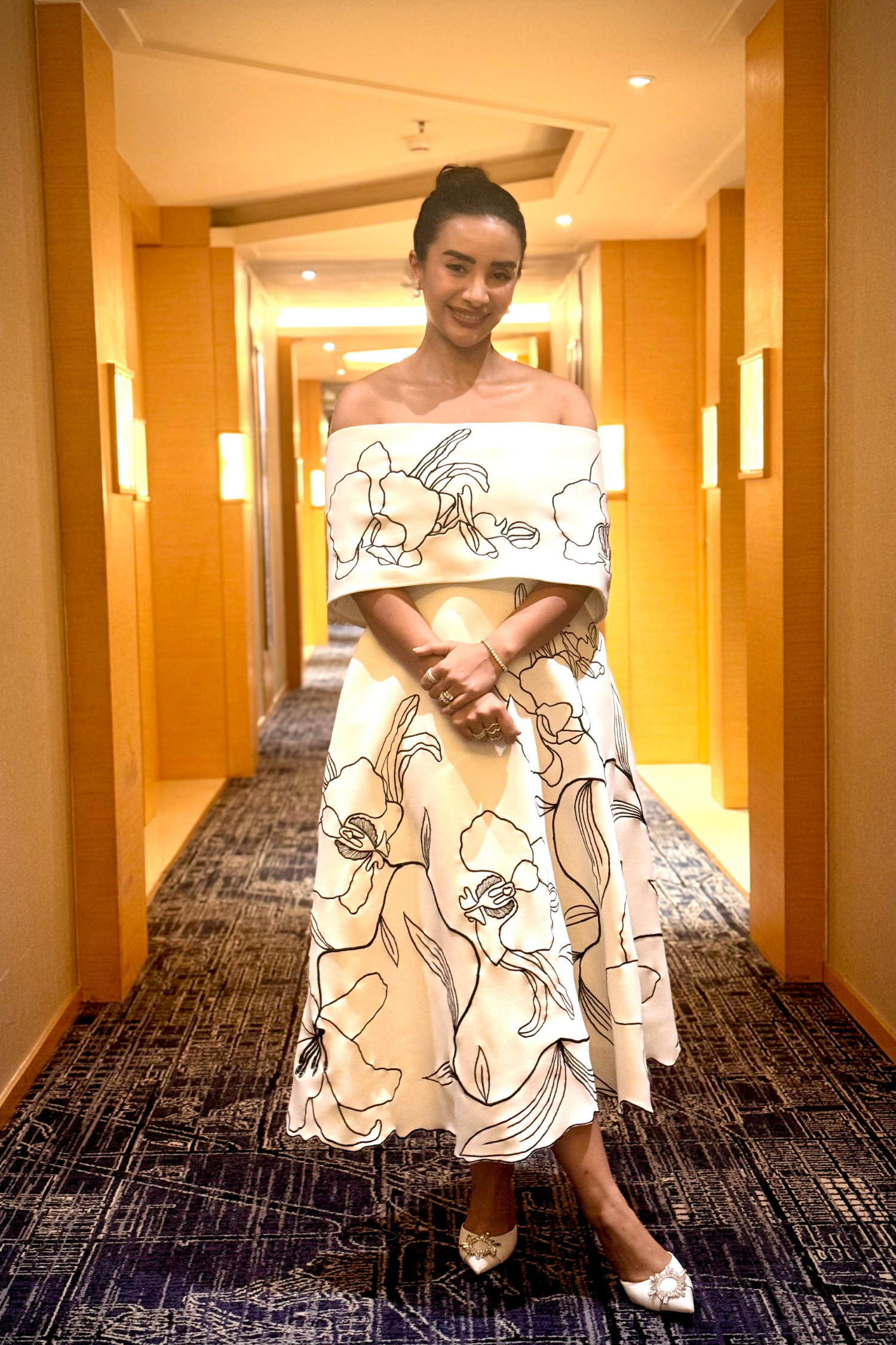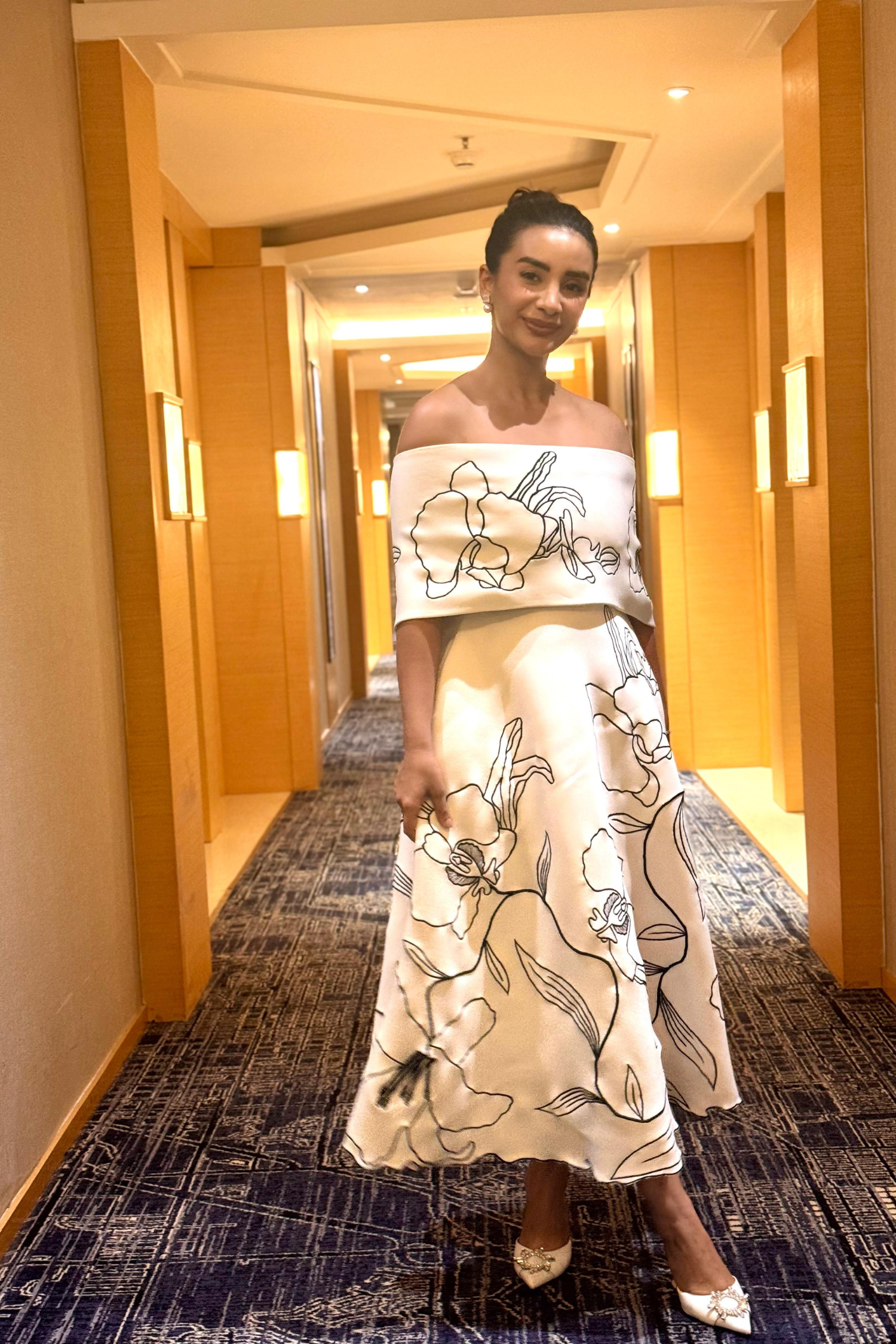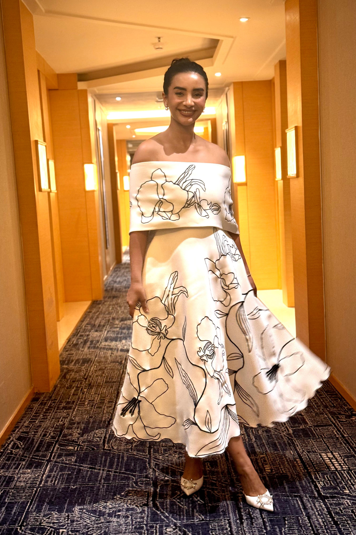 As spotted on Patralekha, featuring a strapless dress with floral embroidery, pockets and a structured flare.
