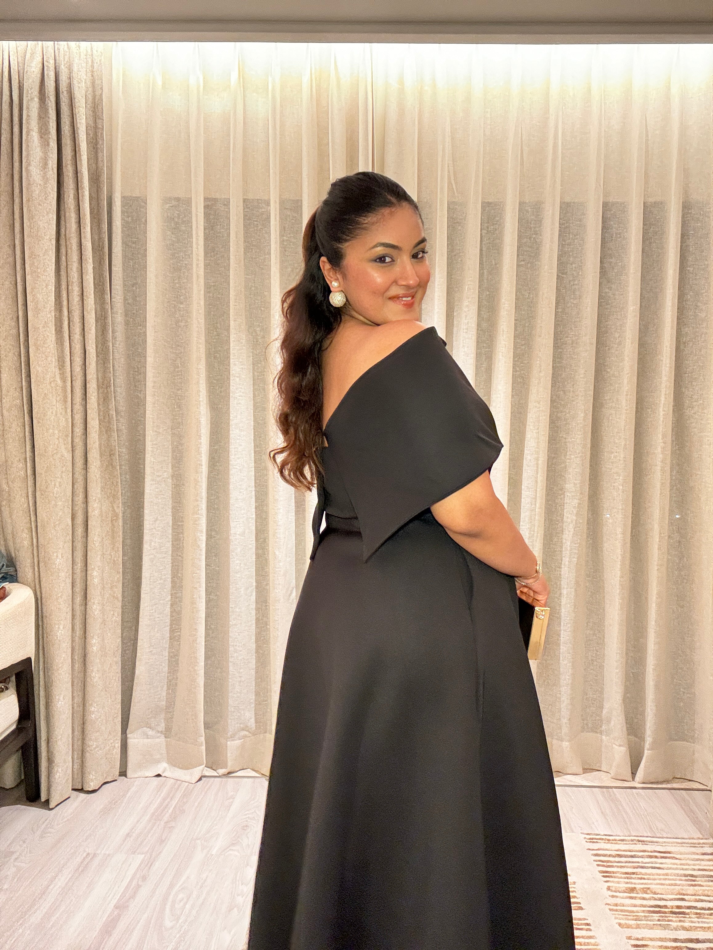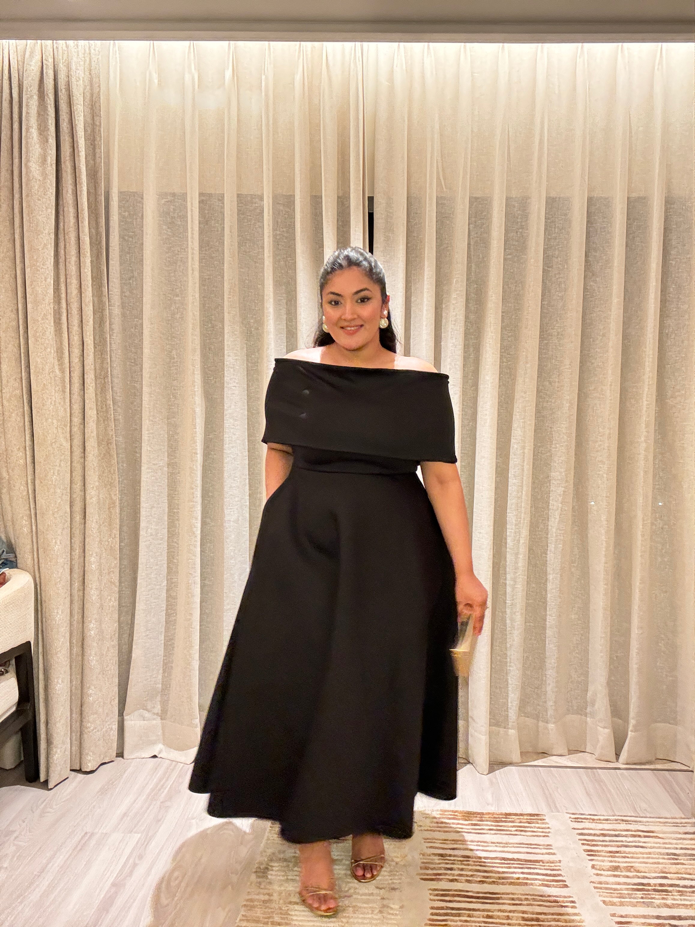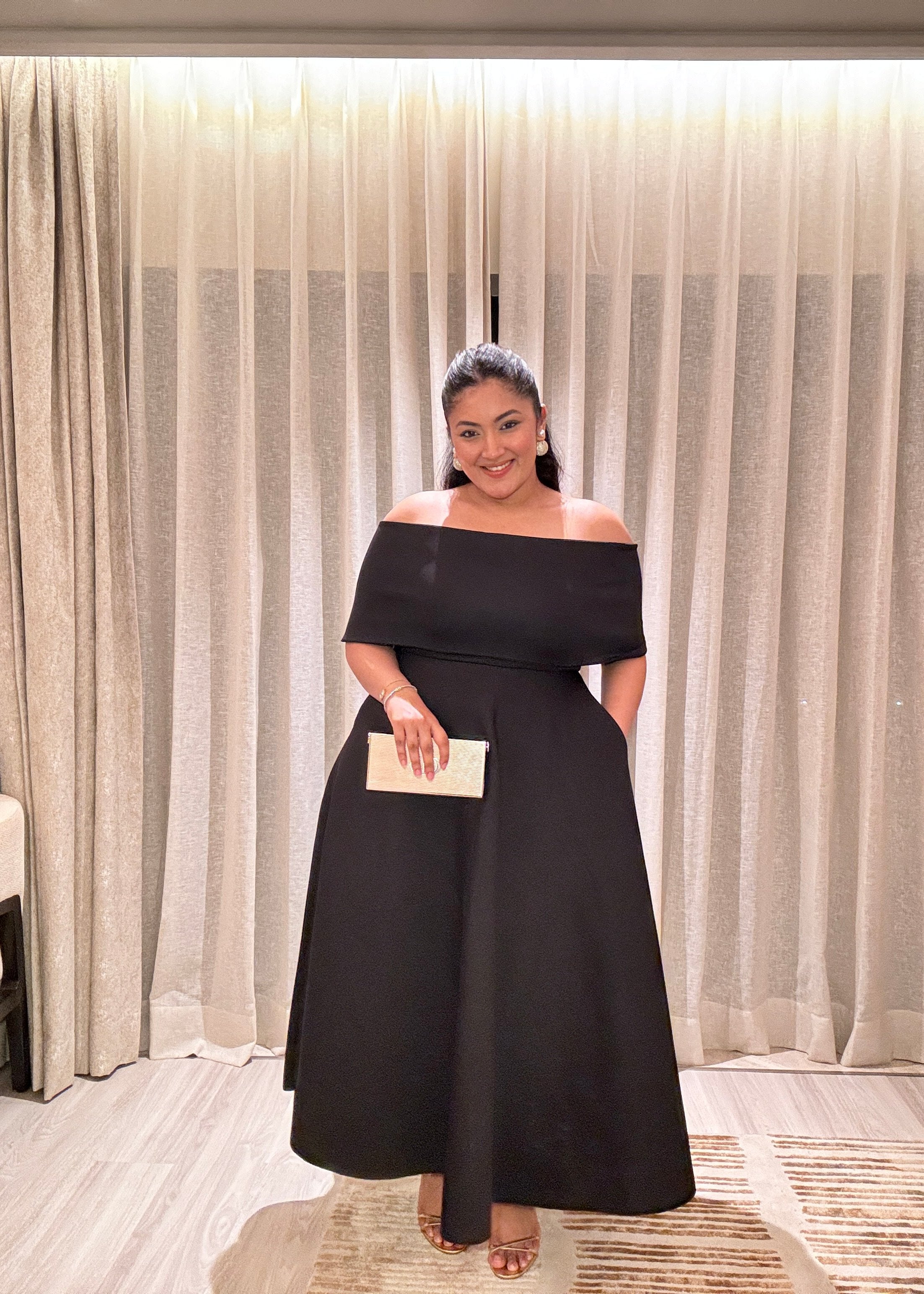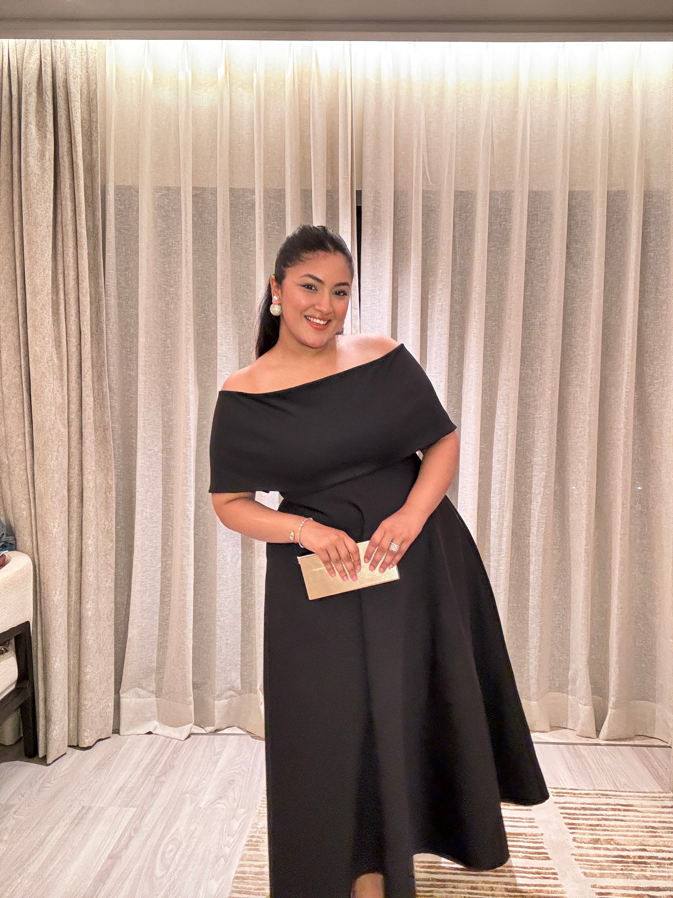 Featuring a strapless dress, Gaia with pockets and a structured flare. This set comes with the detachable wrap which can be worn over one shoulder or as off-shoulder.