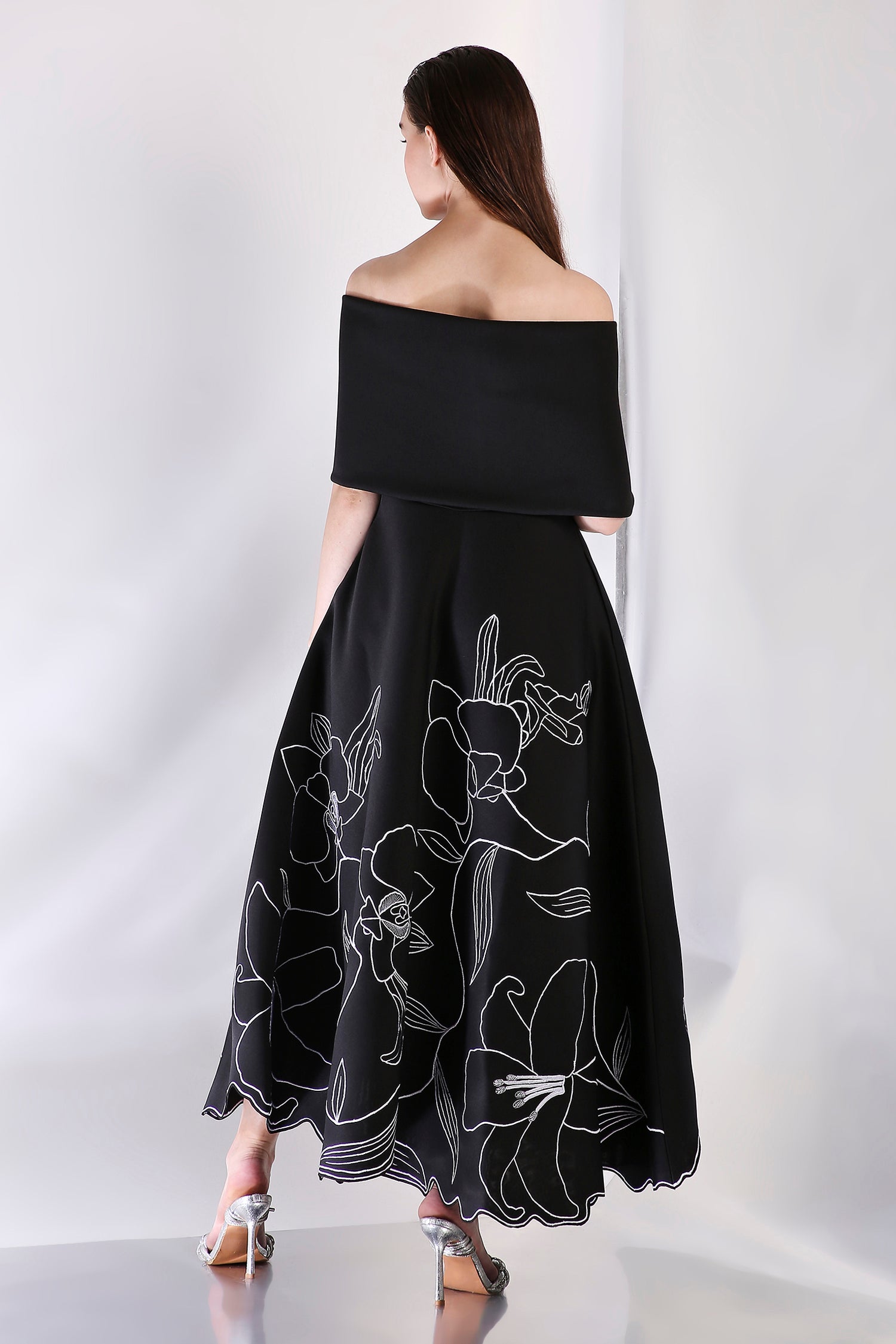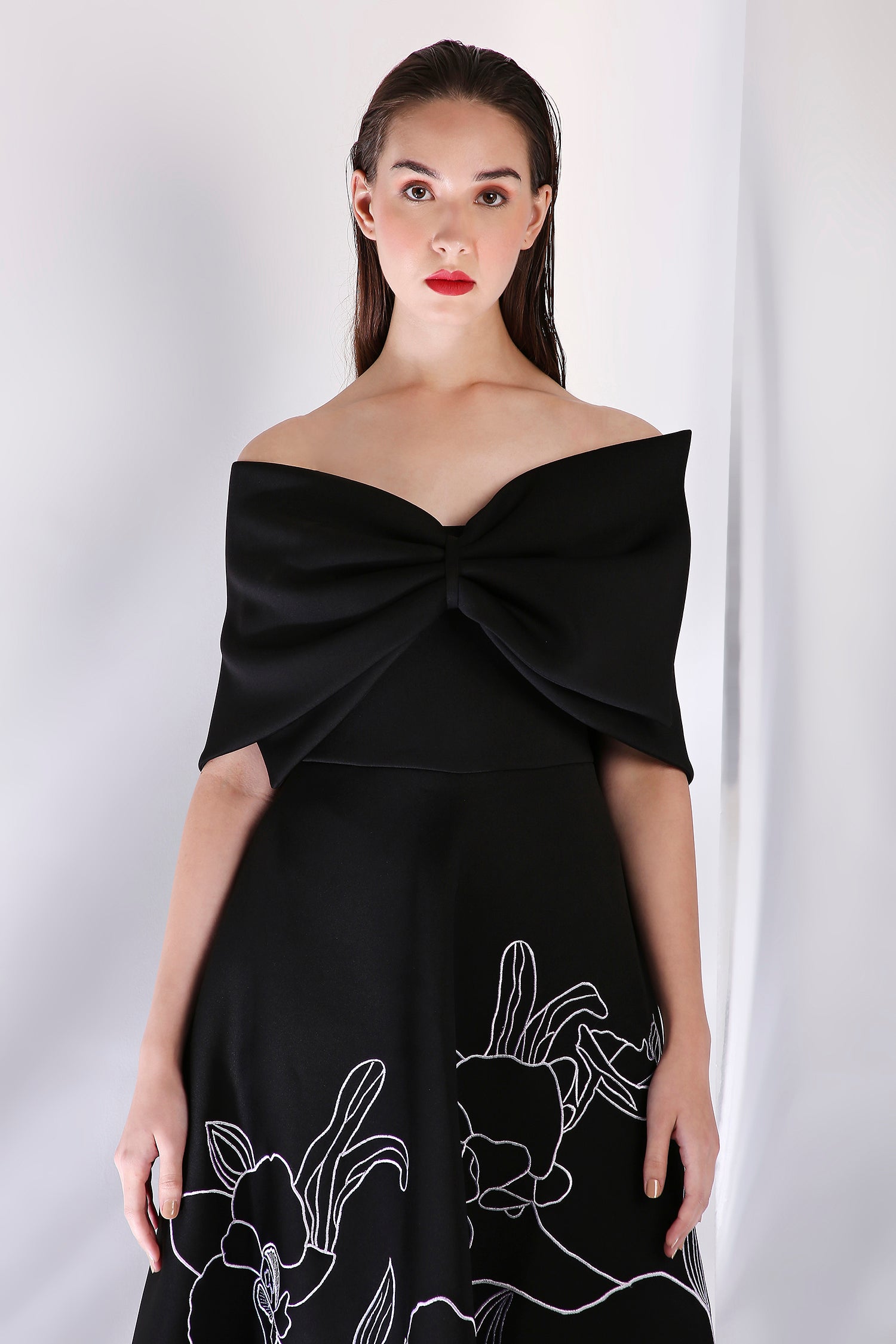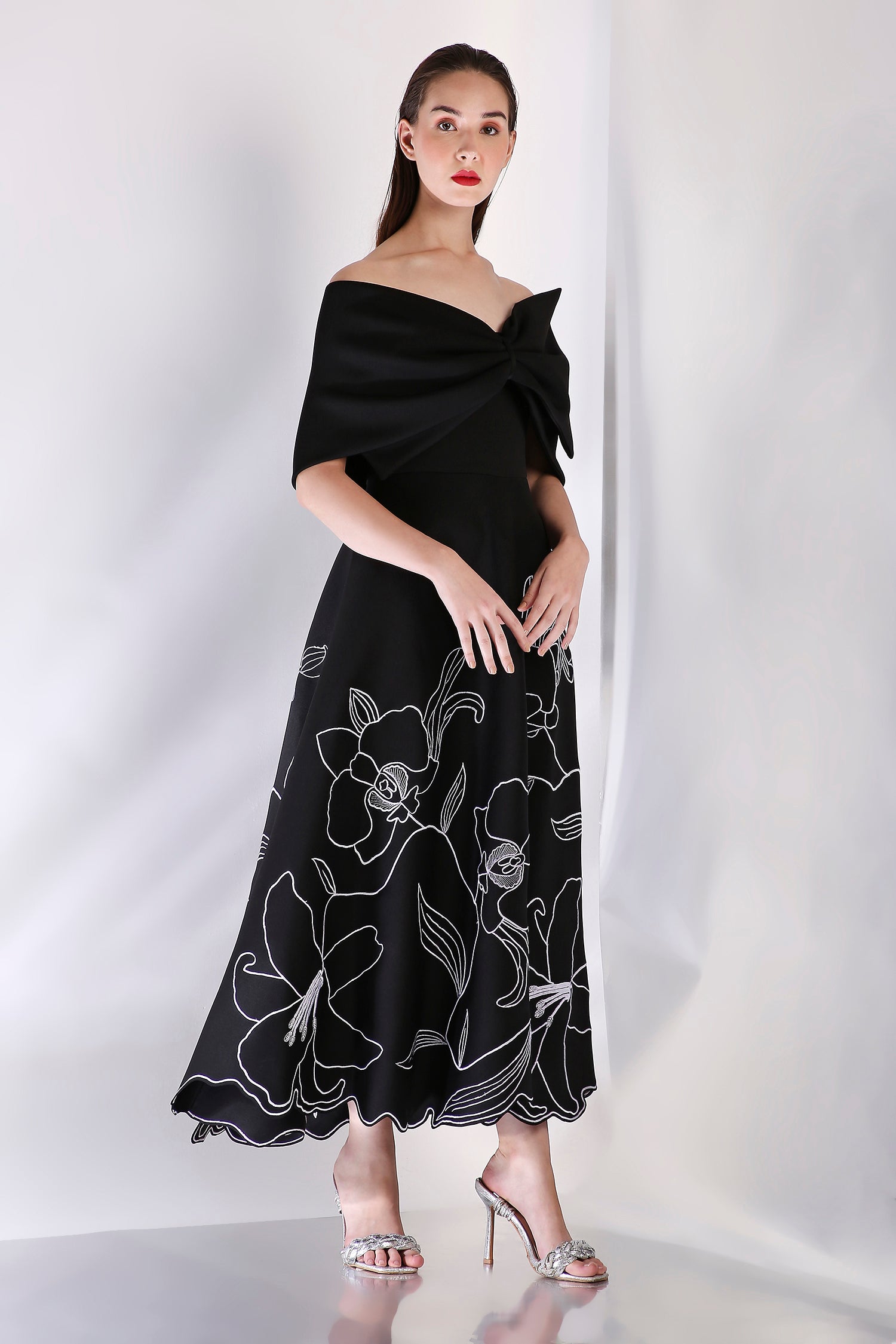 This strapless fit-and-flare mid-calf length dress, crafted from premium neoprene fabric, features intricate floral embroidery motifs that elegantly adorn the entire silhouette. Paired with a versatile bow wrap, which can be styled both one-shoulder or off-shoulder, this ensemble offers a perfect balance of modern sophistication and timeless charm—ideal for any formal occasion.