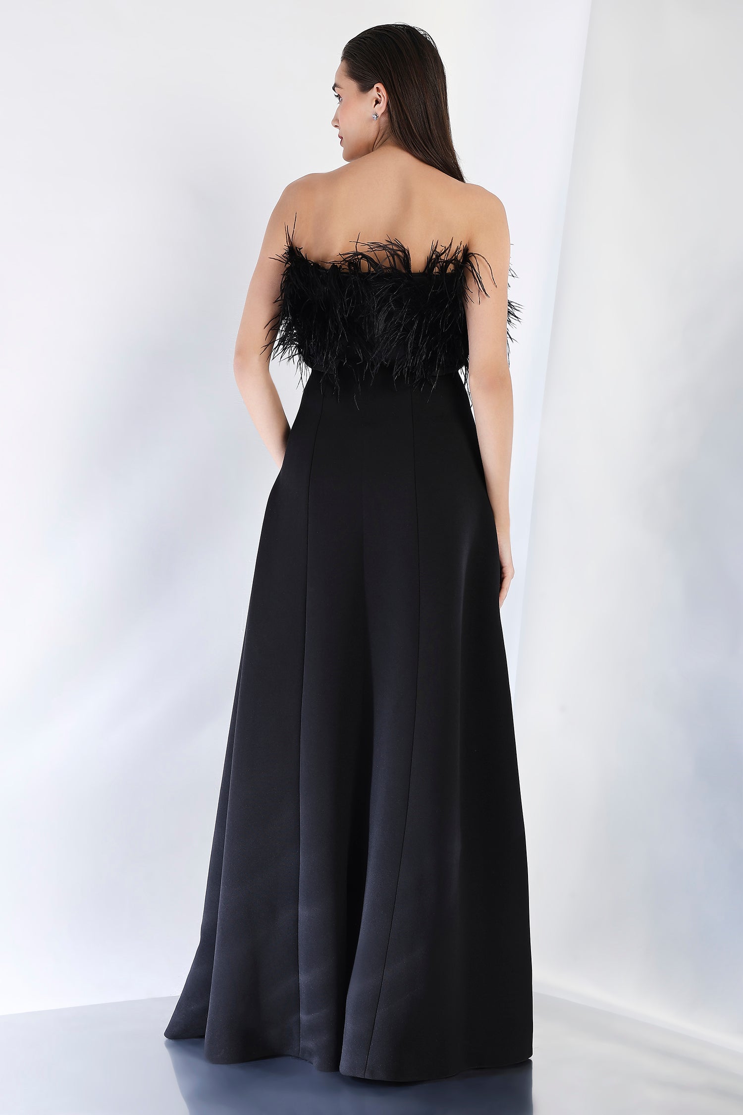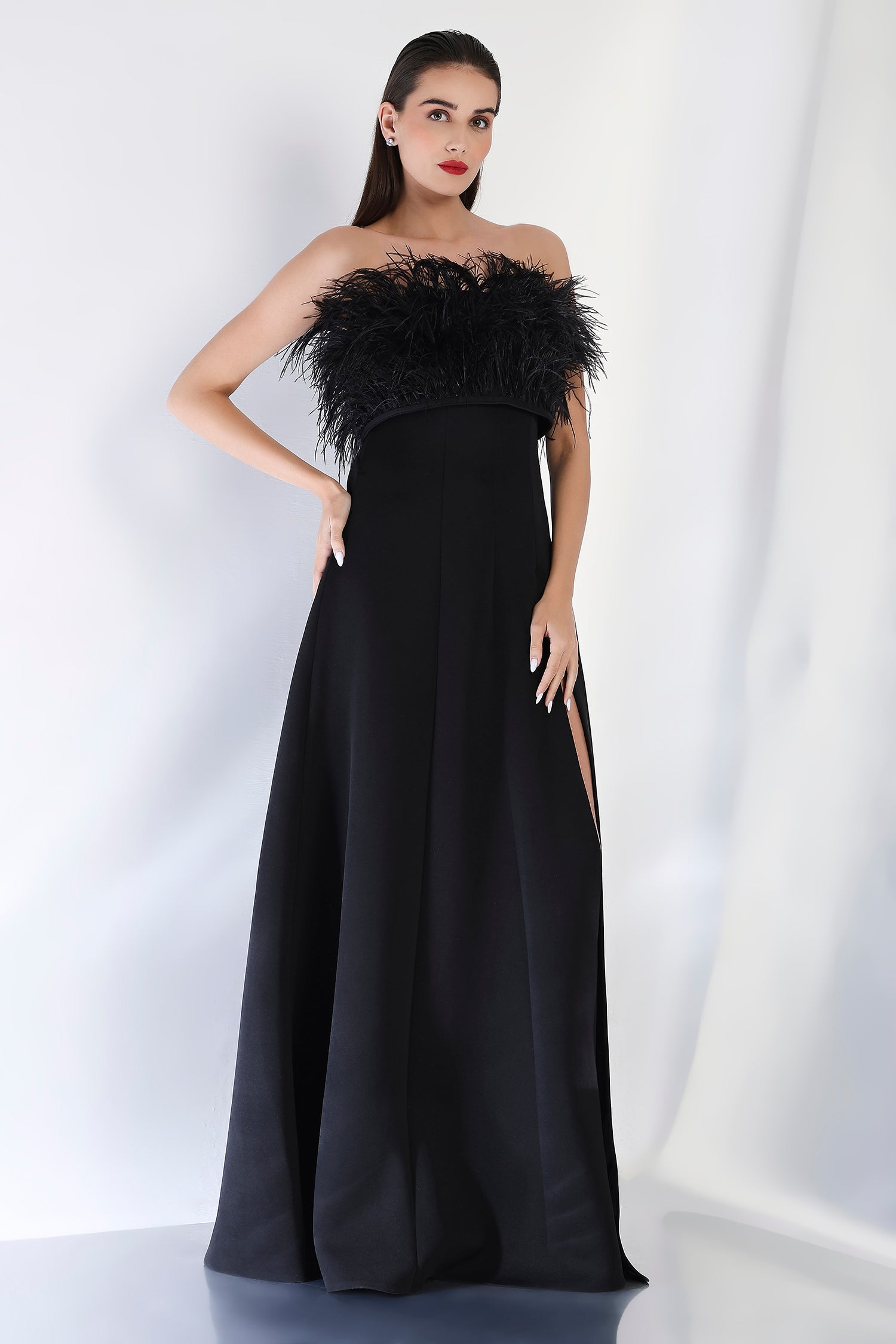 Dramatic and chic, this strapless panel maxi dress with a sultry front slit offers a sophisticated silhouette. Paired with a feather wrap in tube style, the look is elevated with added texture and flair. Ideal for formal events that call for a high-fashion statement, this ensemble is as glamorous as it is stylish.