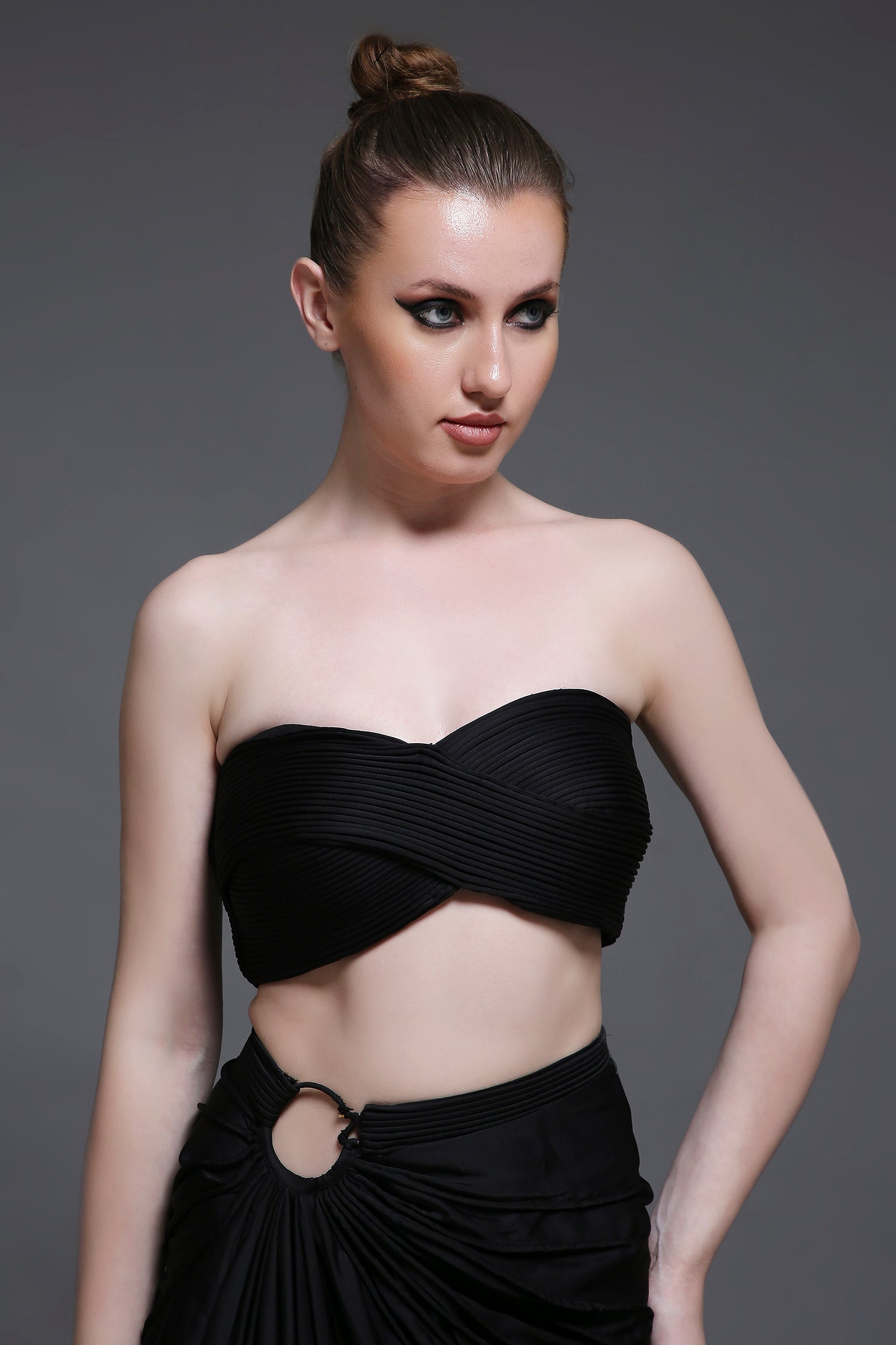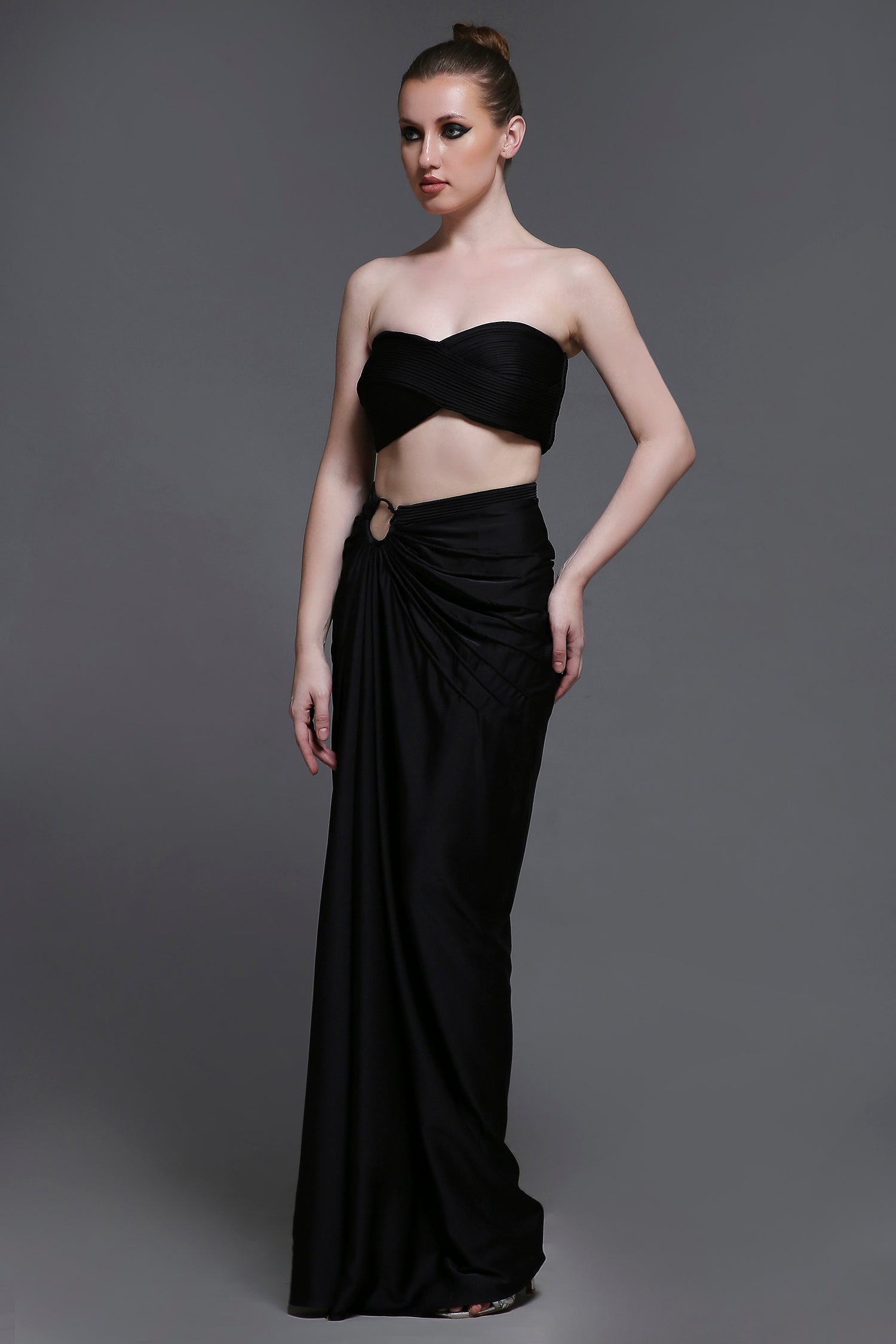 Paired with a draped skirt, the design is enhanced with a subtle trim detail, adding texture and sophistication. A chic and flattering ensemble, perfect for any special occasion.