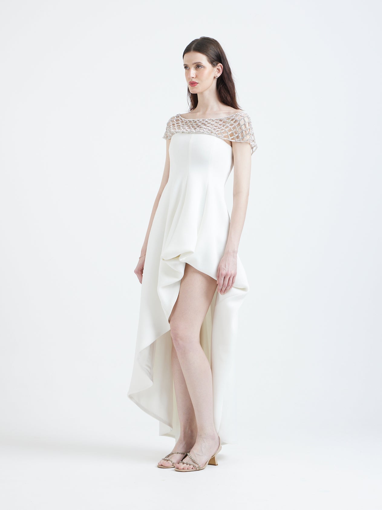 Versatile by design, it can be styled in multiple ways—draped off-shoulder, worn straight across, or layered higher for a sharper silhouette as shown with the off white high low dress giving more elevated look just by adding the overlay—making it an easy addition that elevates the outfit with modern elegance.