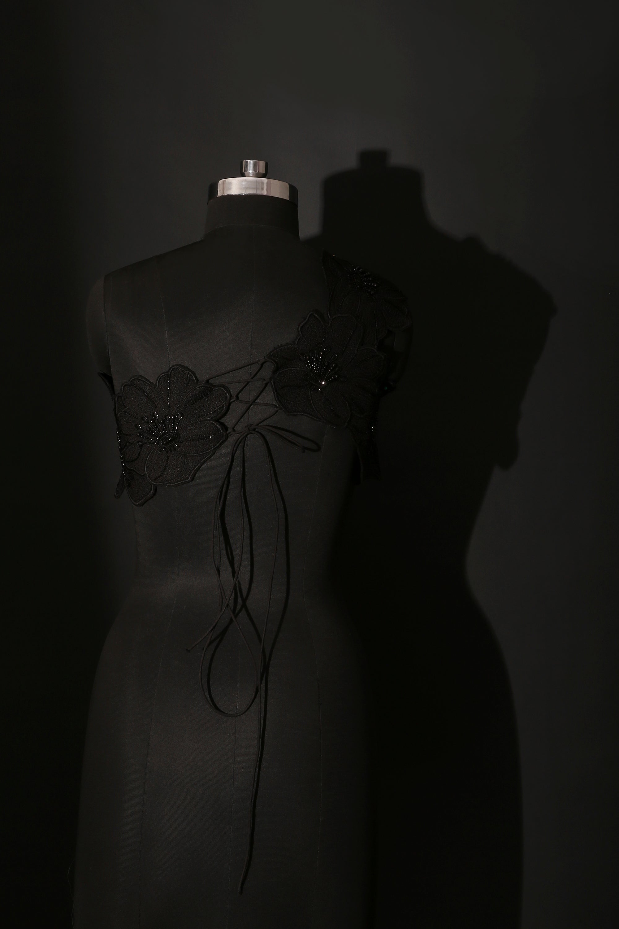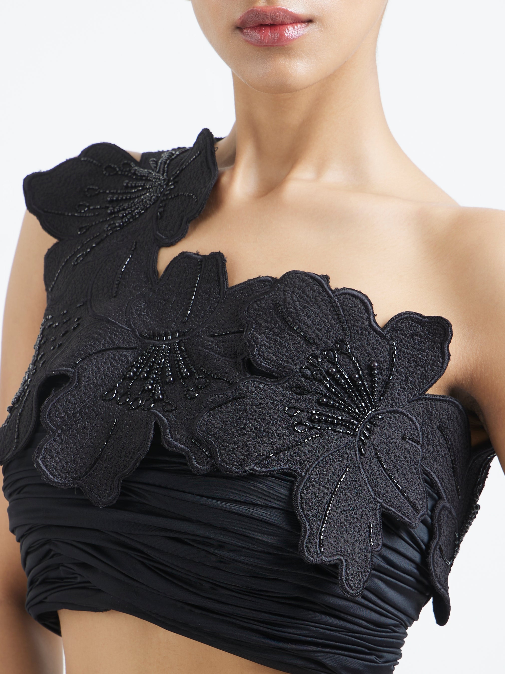 A sculpted floral overlay featuring hand-embroidered floral motifs in rich black tones.