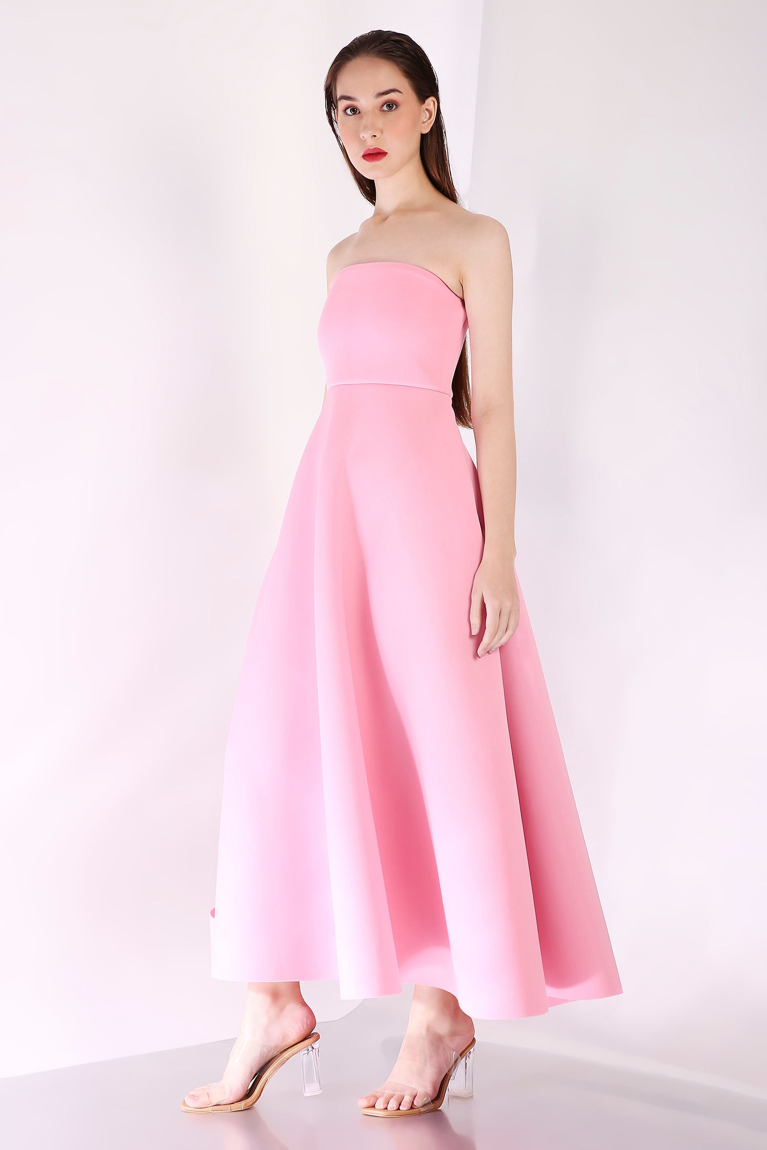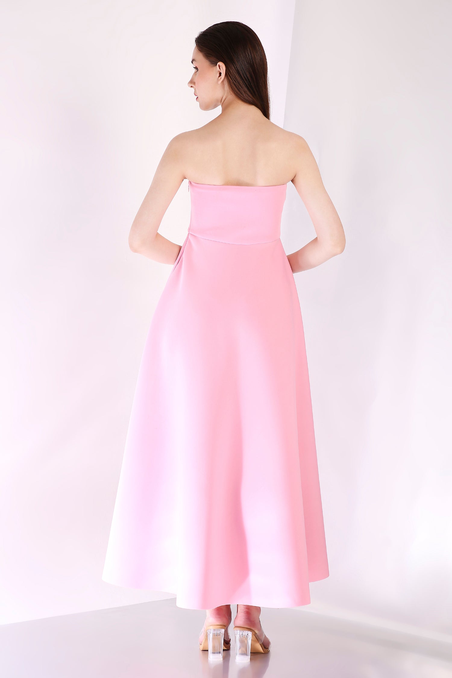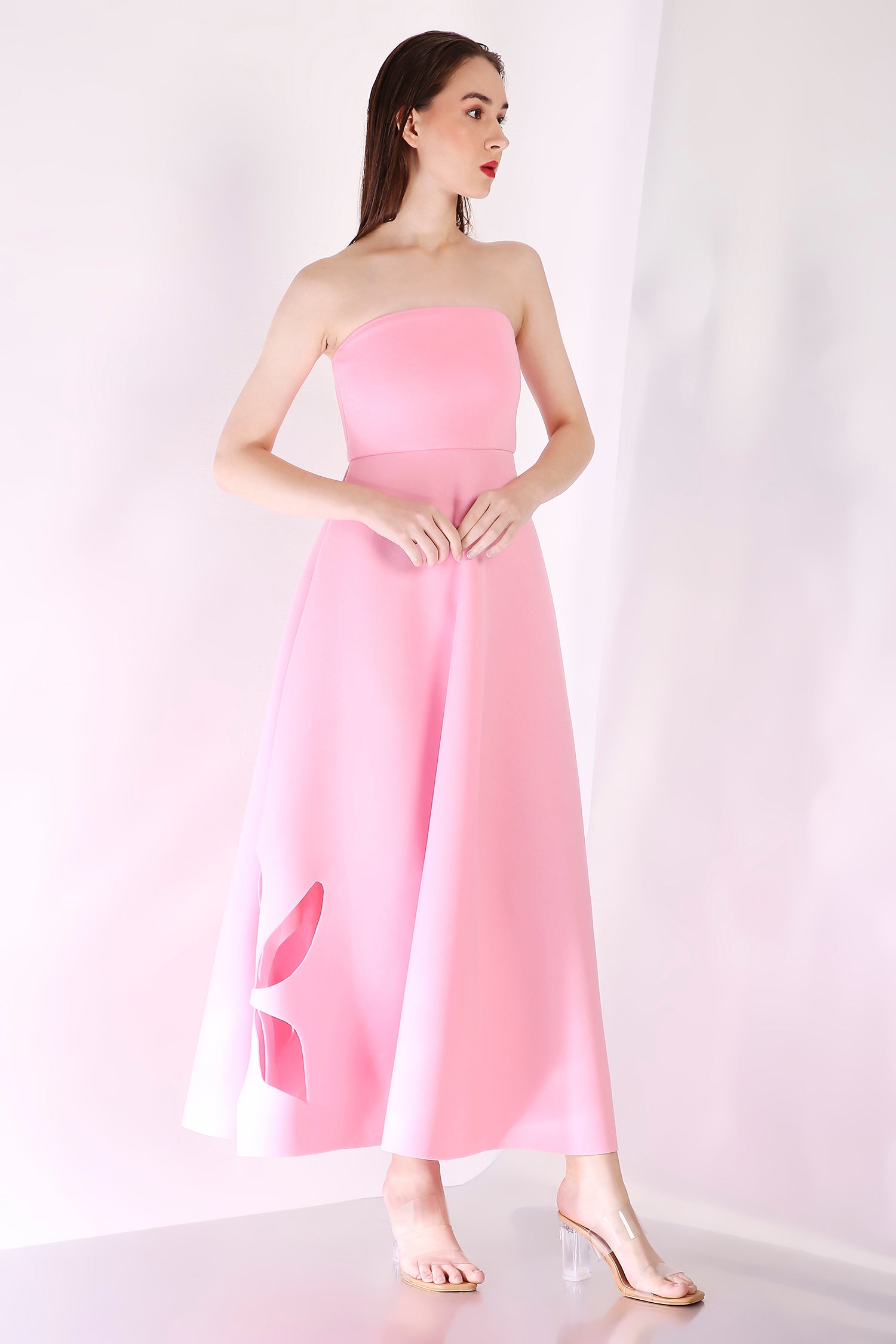 A strapless fit-and-flare dress in premium neoprene, featuring a cutout floral motif along the hem. The design offers a modern, feminine touch, perfect for formal events.