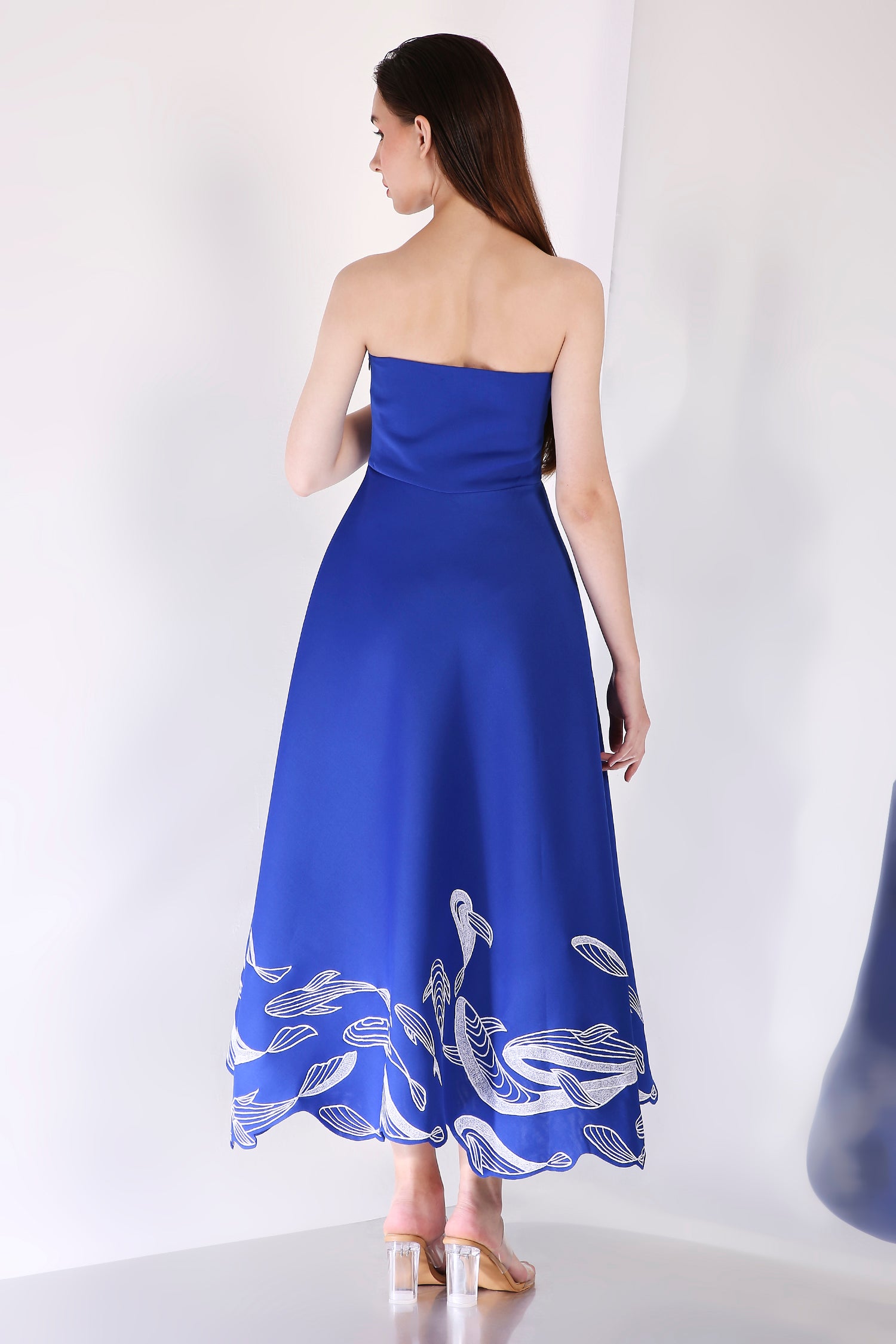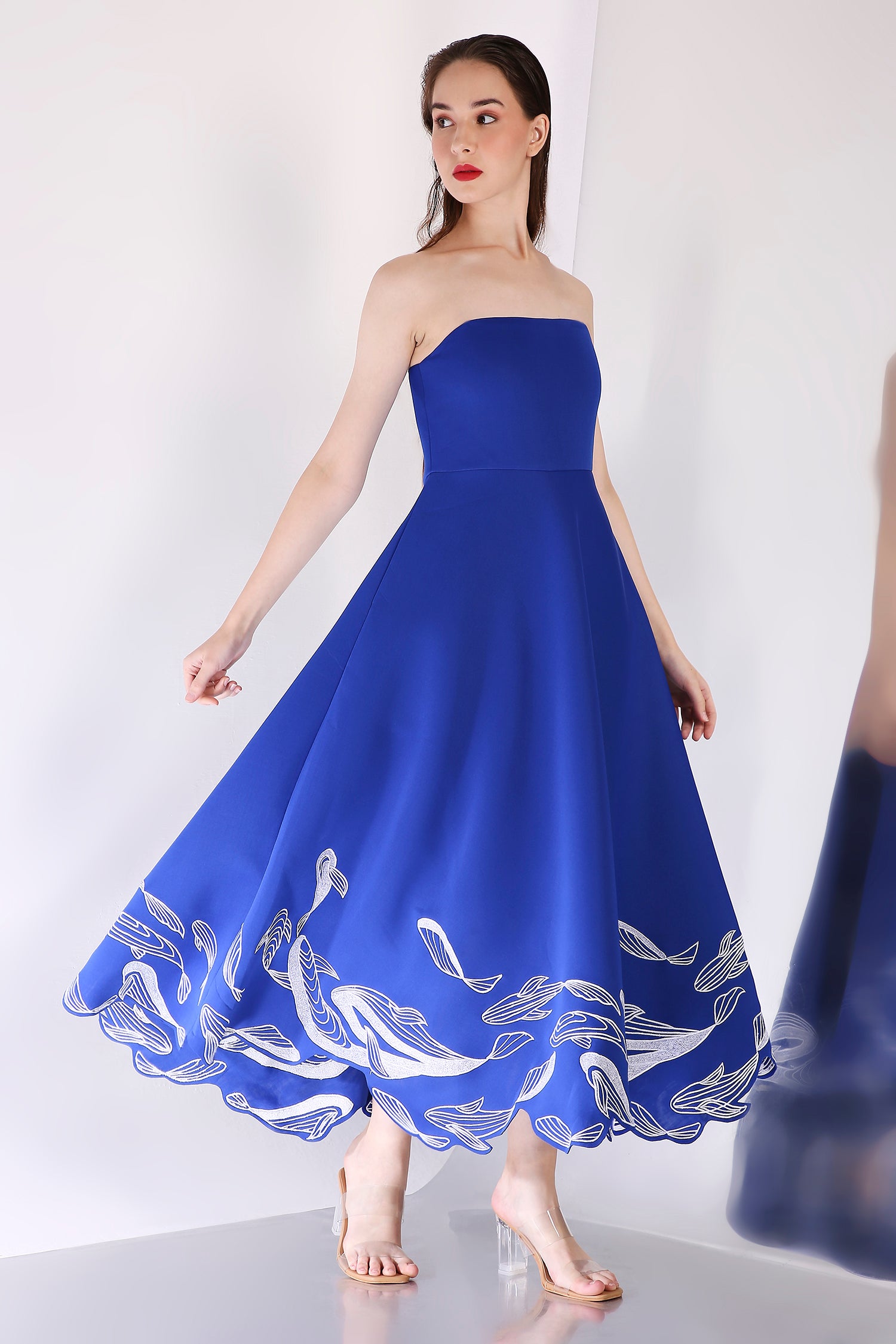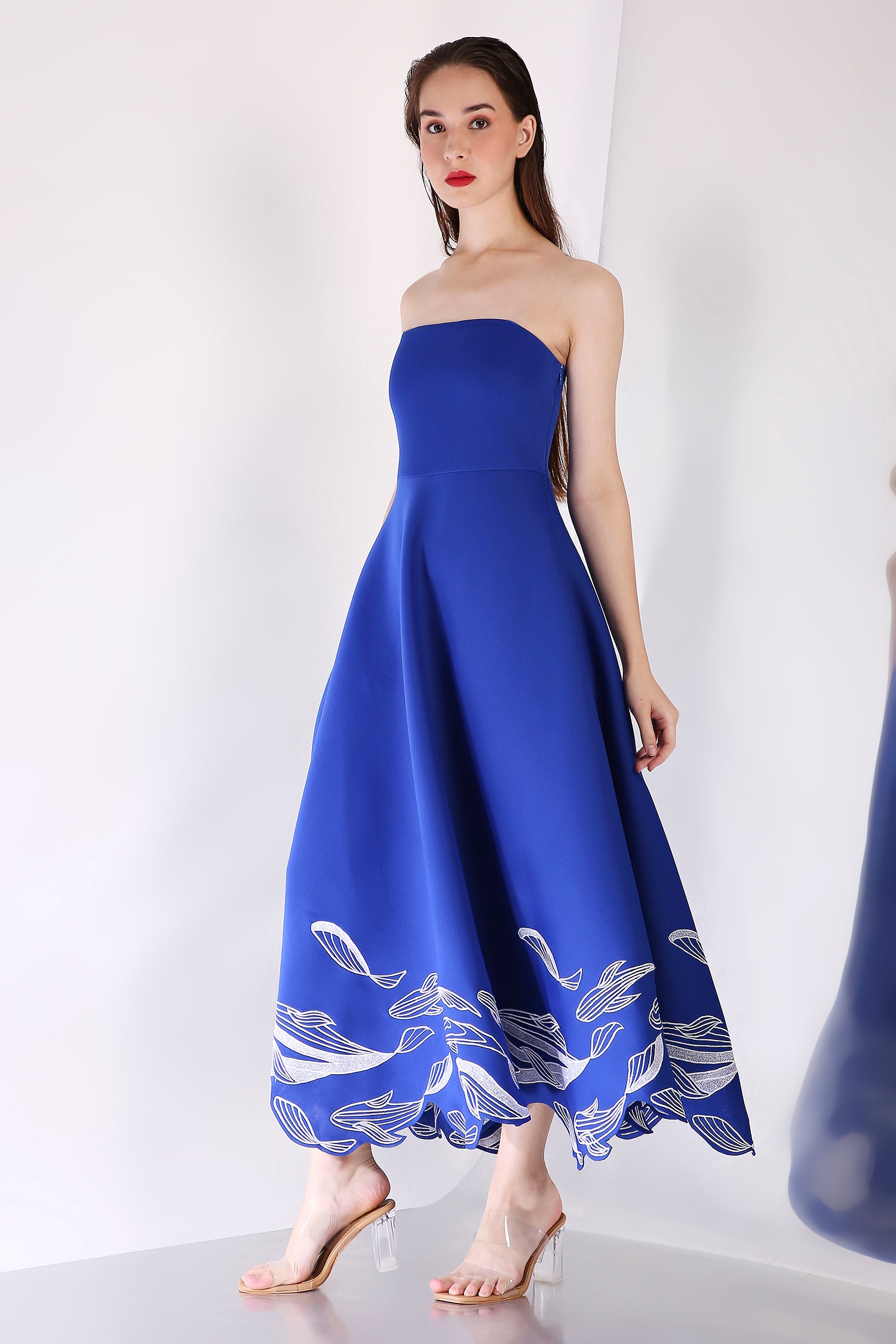 A mid-calf length fit-and-flare dress in premium neoprene, featuring intricate embroidery along the hem.