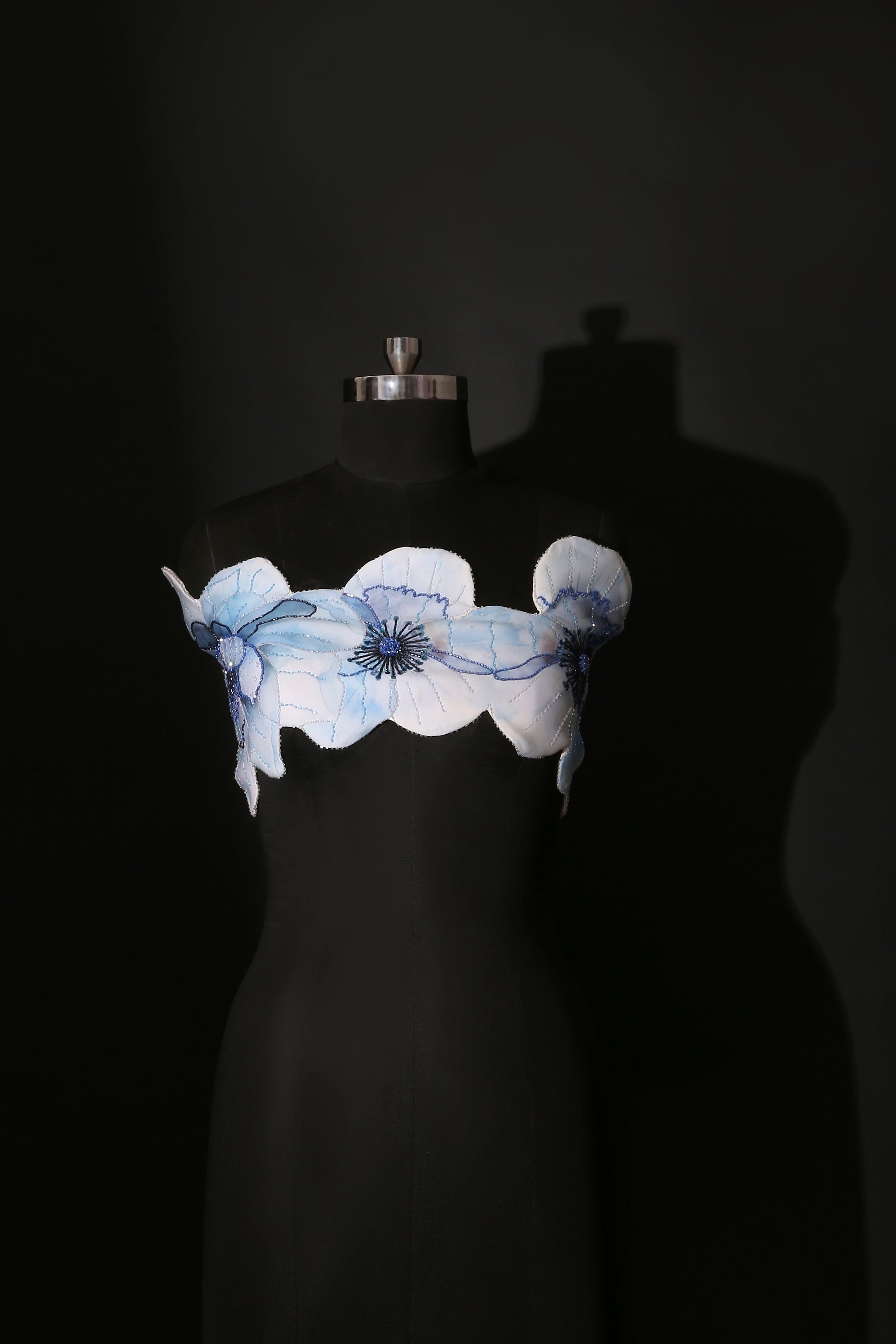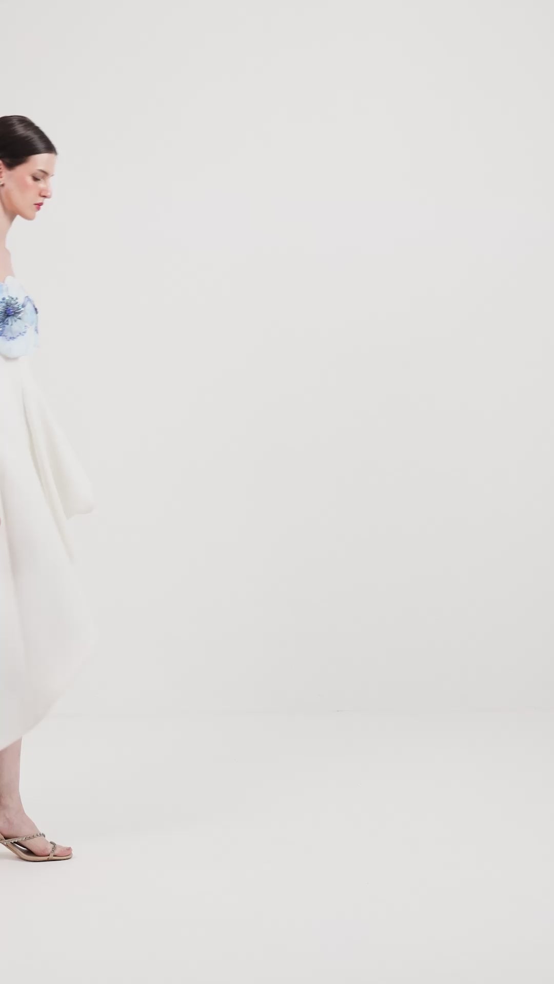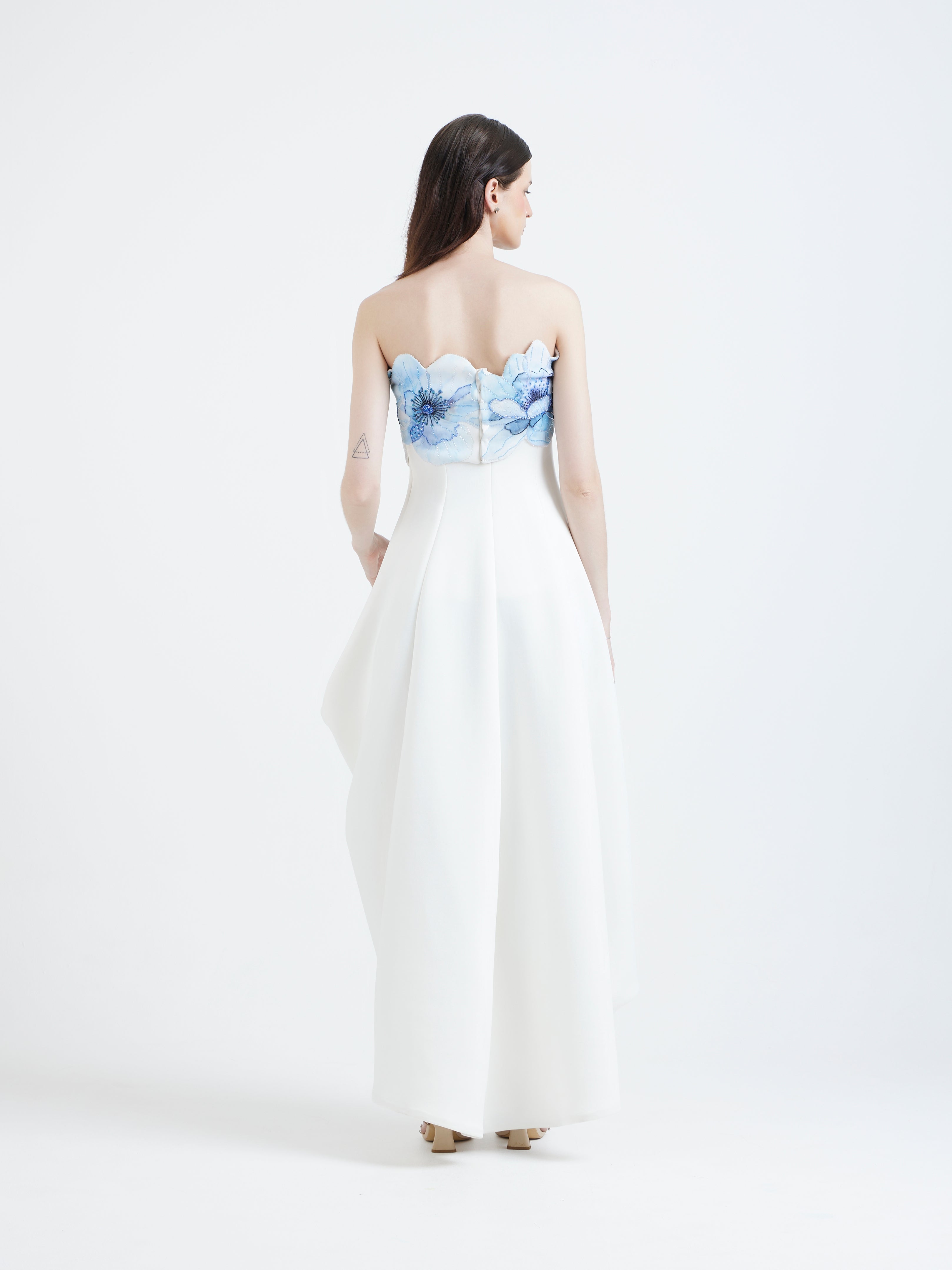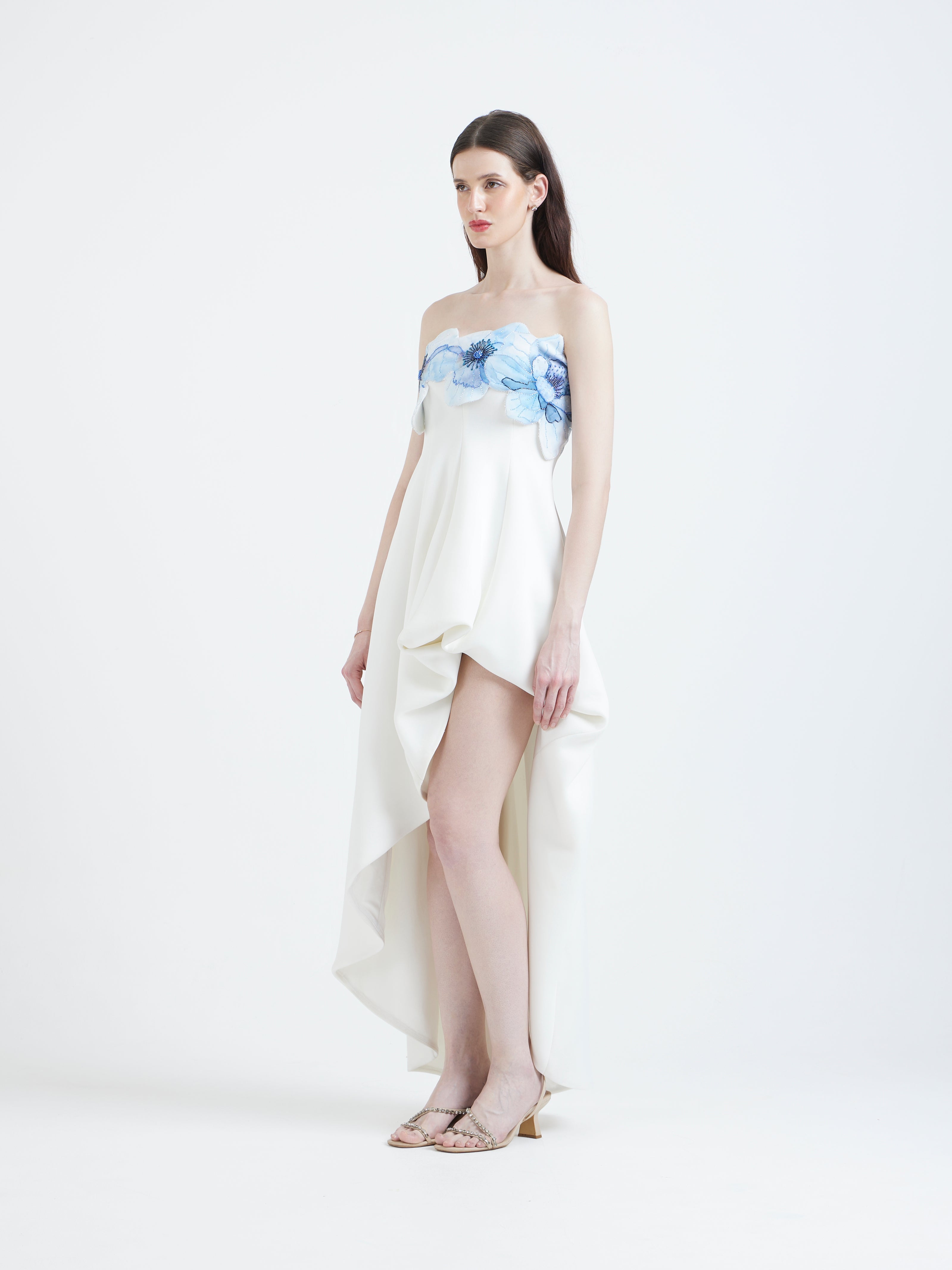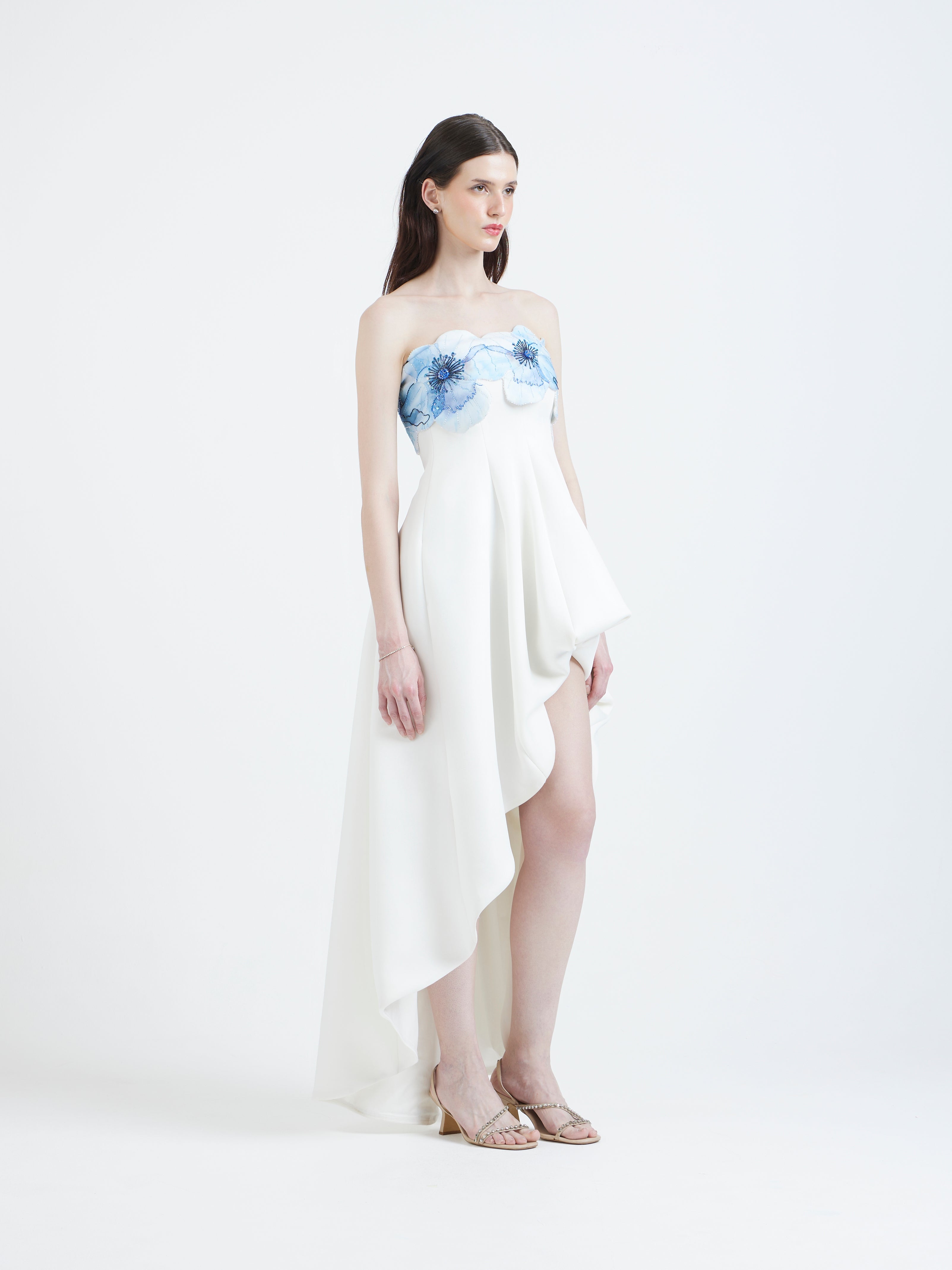This high–low dress brings a gentle sense of movement with structure in every step. The bodice is highlighted by a detachable floral wrap, hand-embellished to add dimension and a touch of couture sparkle. Soft blue petals cascade across the neckline, creating a dreamy contrast against the ivory base.