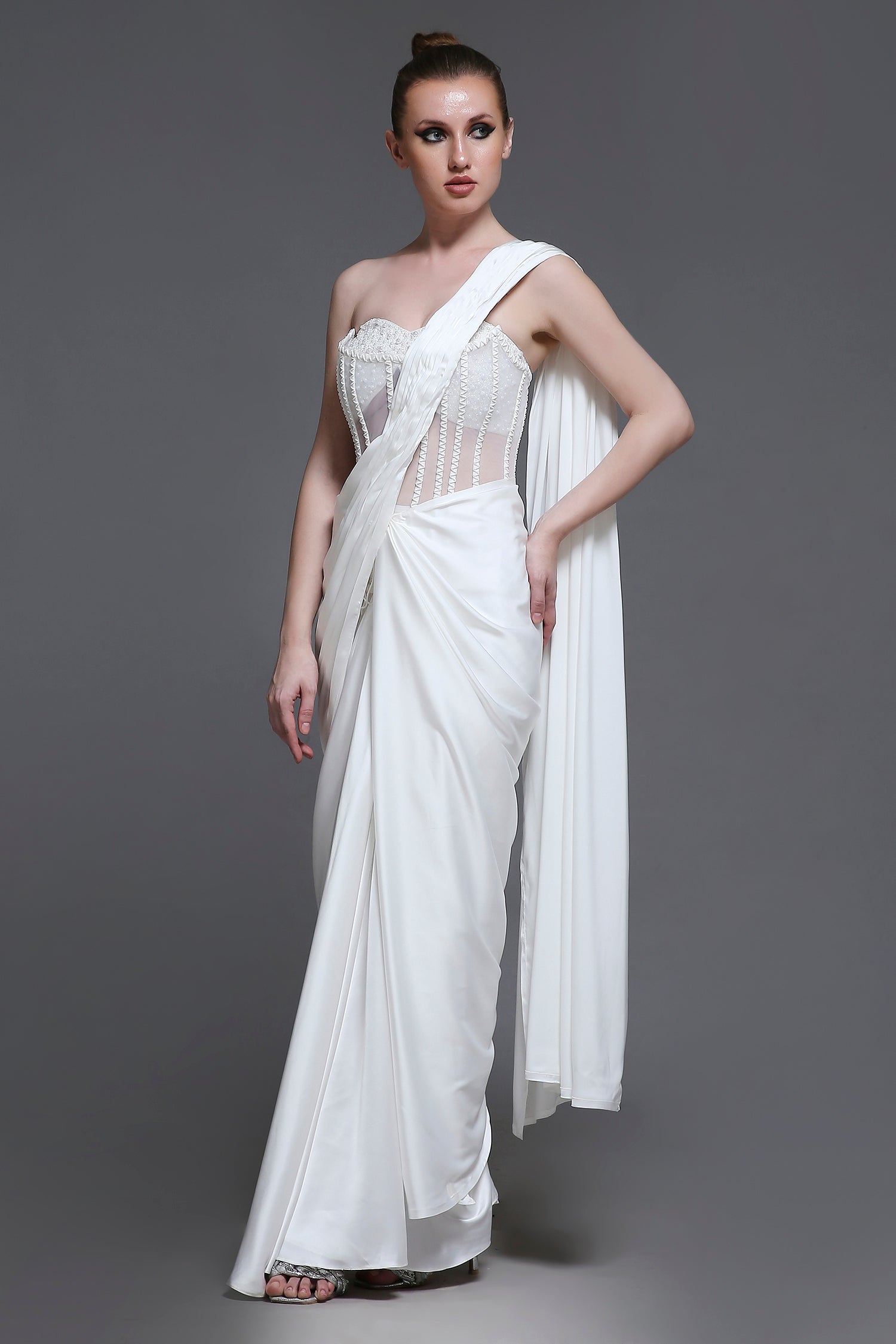 The set is completed with a flowing draped skirt and a detachable saree drape, offering versatility and graceful movement. Perfect for making a statement at any special occasion.