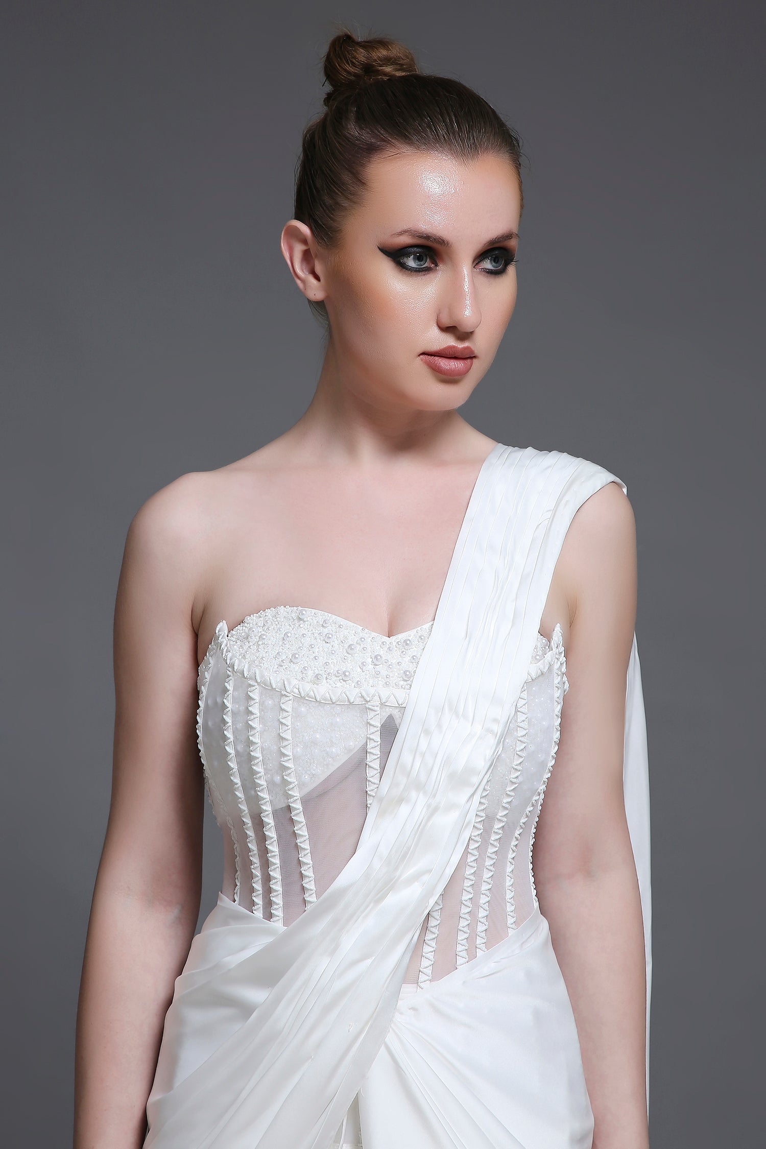 The bustier features hand-embroidered pearls, while a mesh-layered corset adds sophistication. Both pieces feature a back tie-up for a customizable fit.