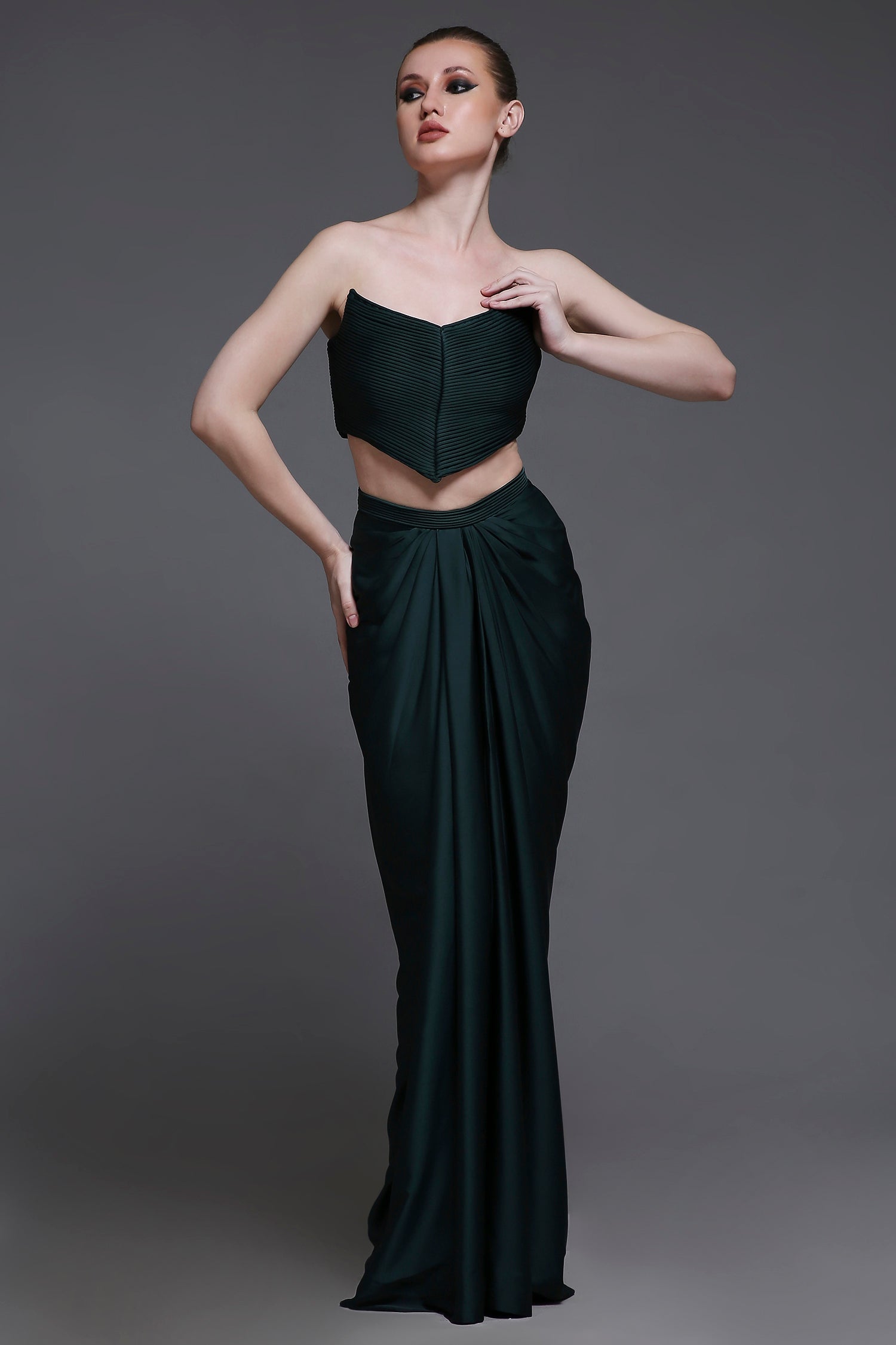 The corset top features intricate cord detailing along a structured neckline, with a tie-up back for a customisable fit that flatters and supports. It’s paired with a draped mini skirt, designed for graceful movement and a touch of drama.