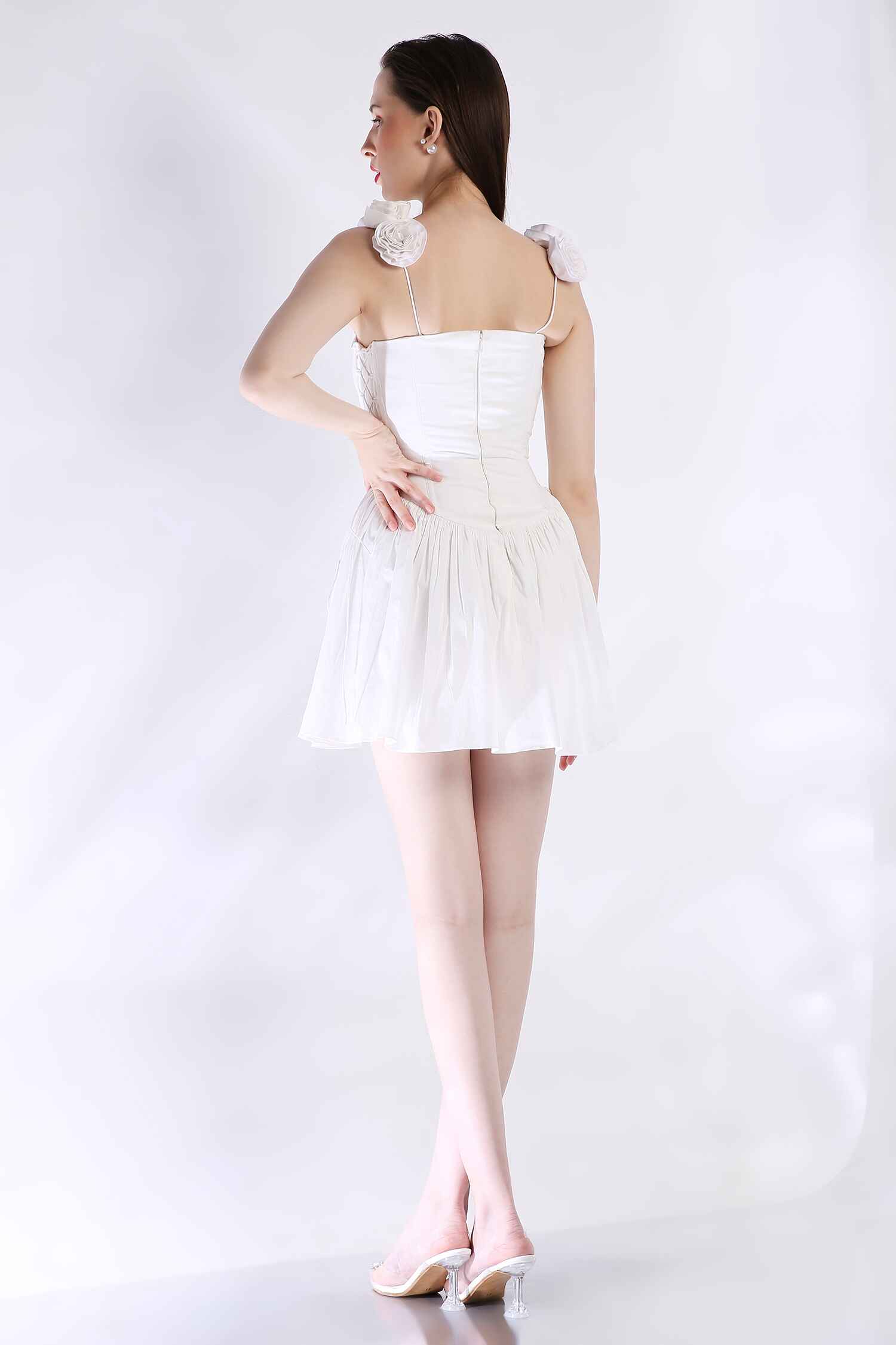 Channel modern chic with our white corset-inspired strapless short dress, featuring a flattering fitted bodice. The flowy, short ruffled skirt adds playful movement, while detachable straps adorned with 3D flowers offer versatility and a touch of elegance. Perfect for a special occasion where you want to stand out.