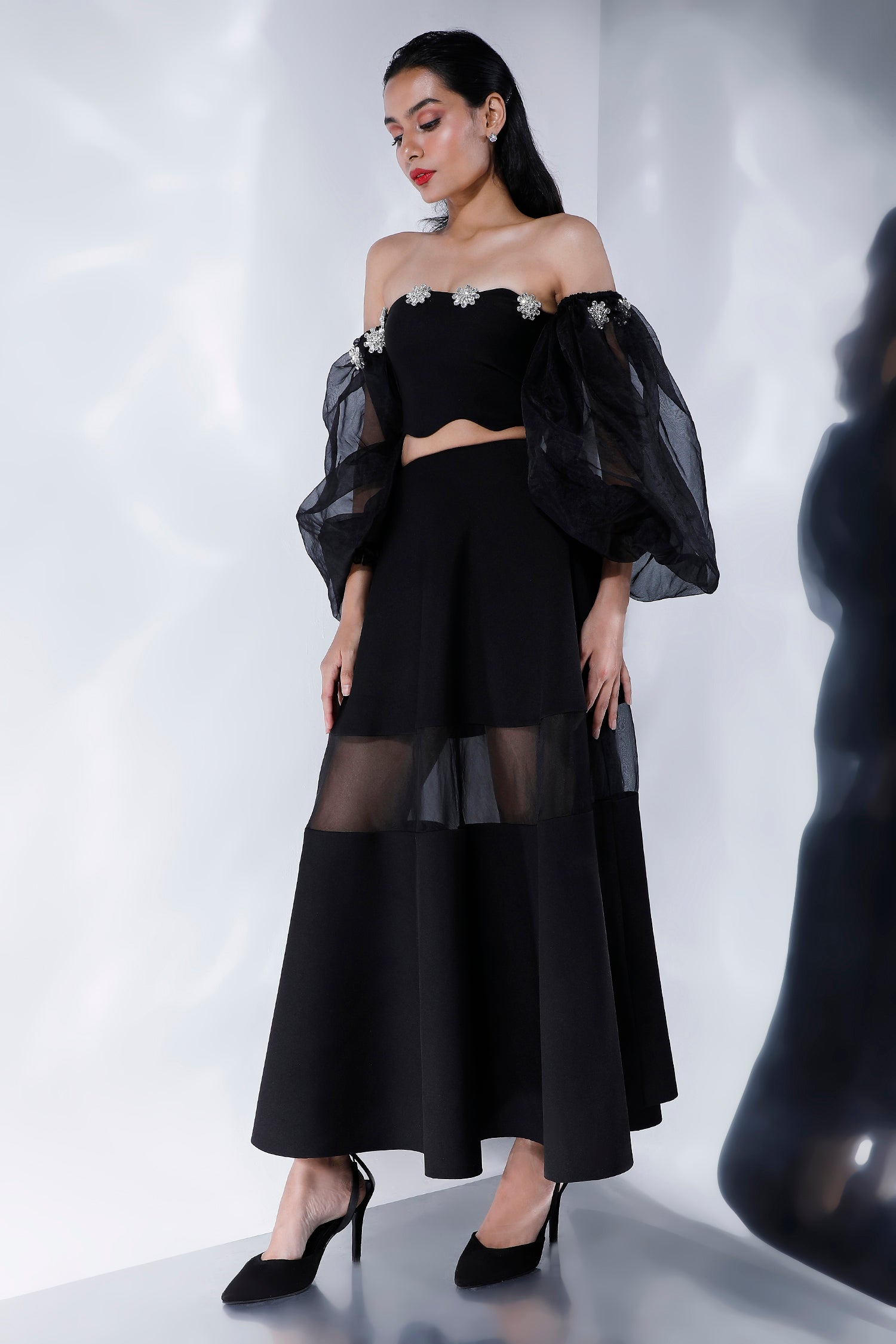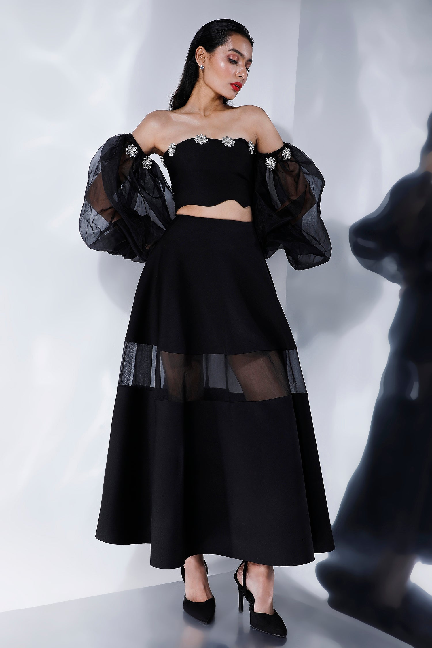 Wear it as is- strapless or with the detachable studded sleeves. The add-on sleeves ensure you get different wears out of this one wardrobe staple which is perfect for night-outs.
