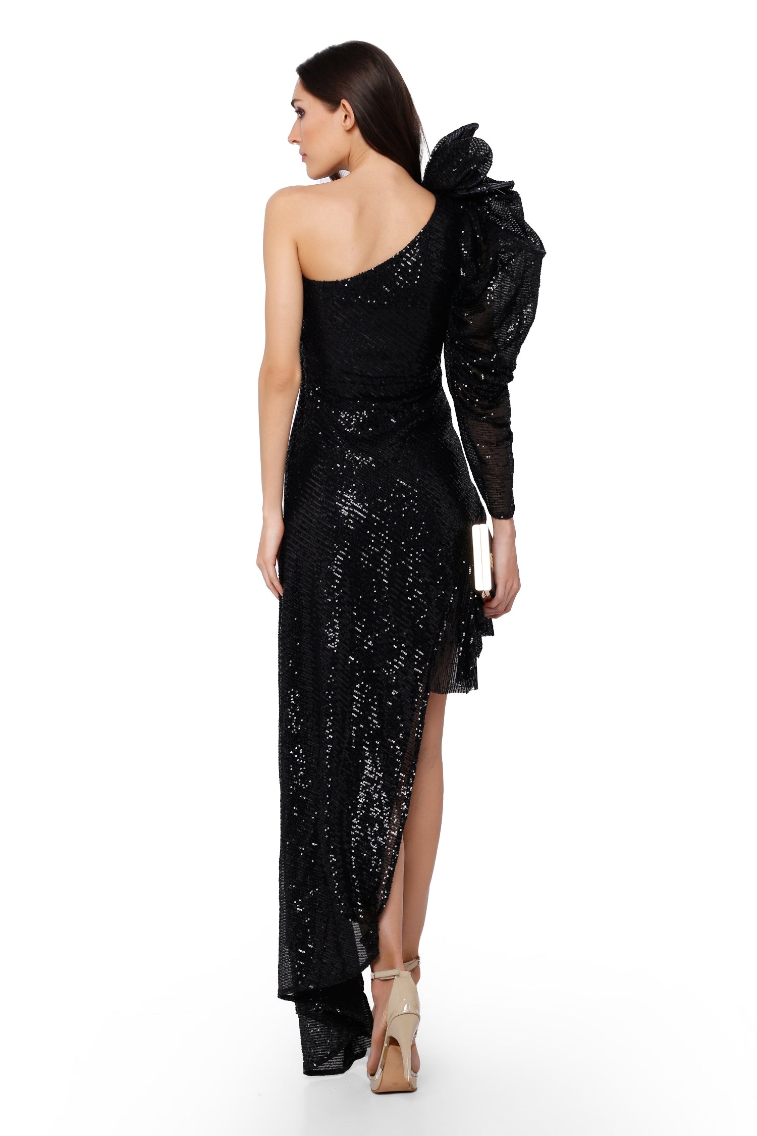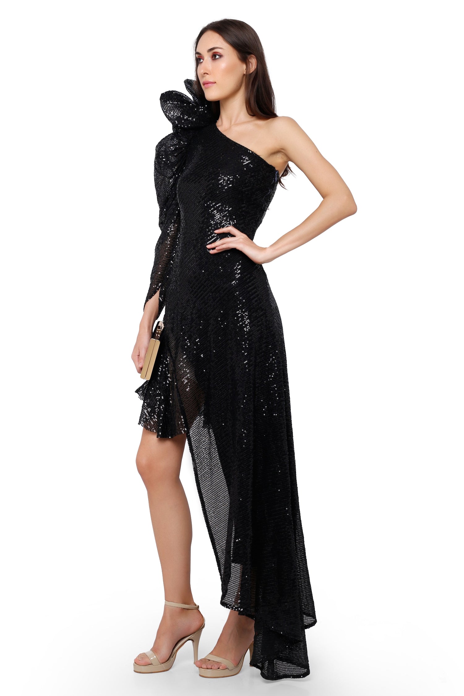 Featuring an asymmetrical, sequinned gown with elaborate sleeves and floral shoulder detailing. It comprises of Intricate hand sewing and boning.