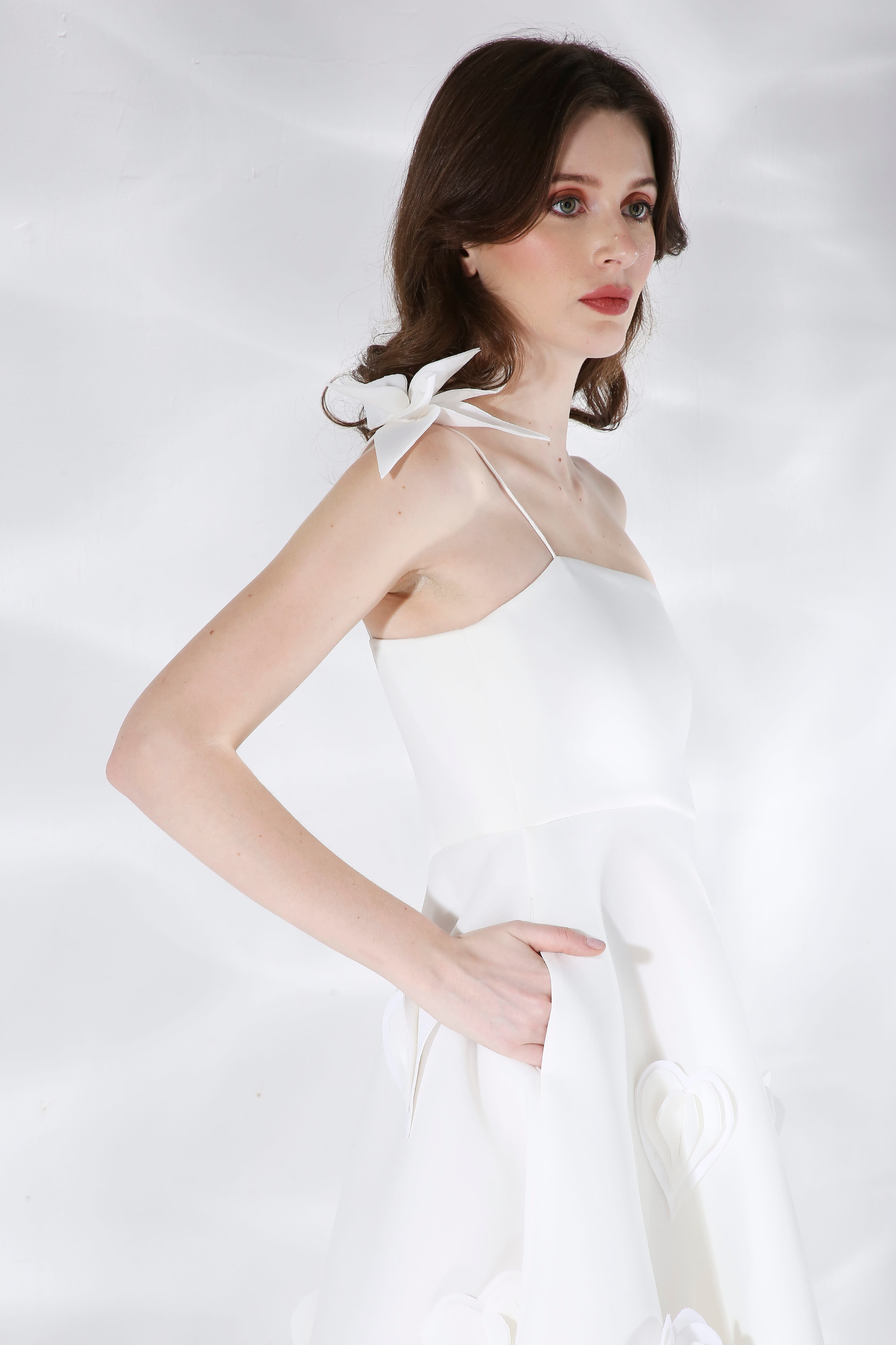 The fabric is thick and flows away from the body giving it a structured fall.