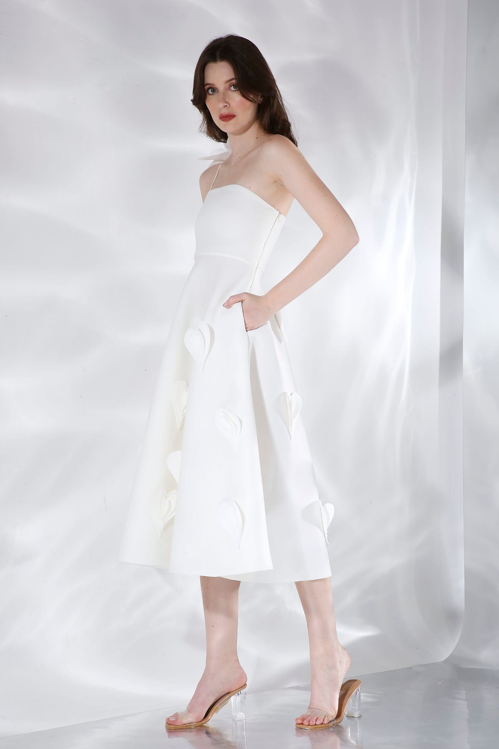 Featuring fit and flare dress, Cassandra with pockets and handmade heart appliqués attached by hand.