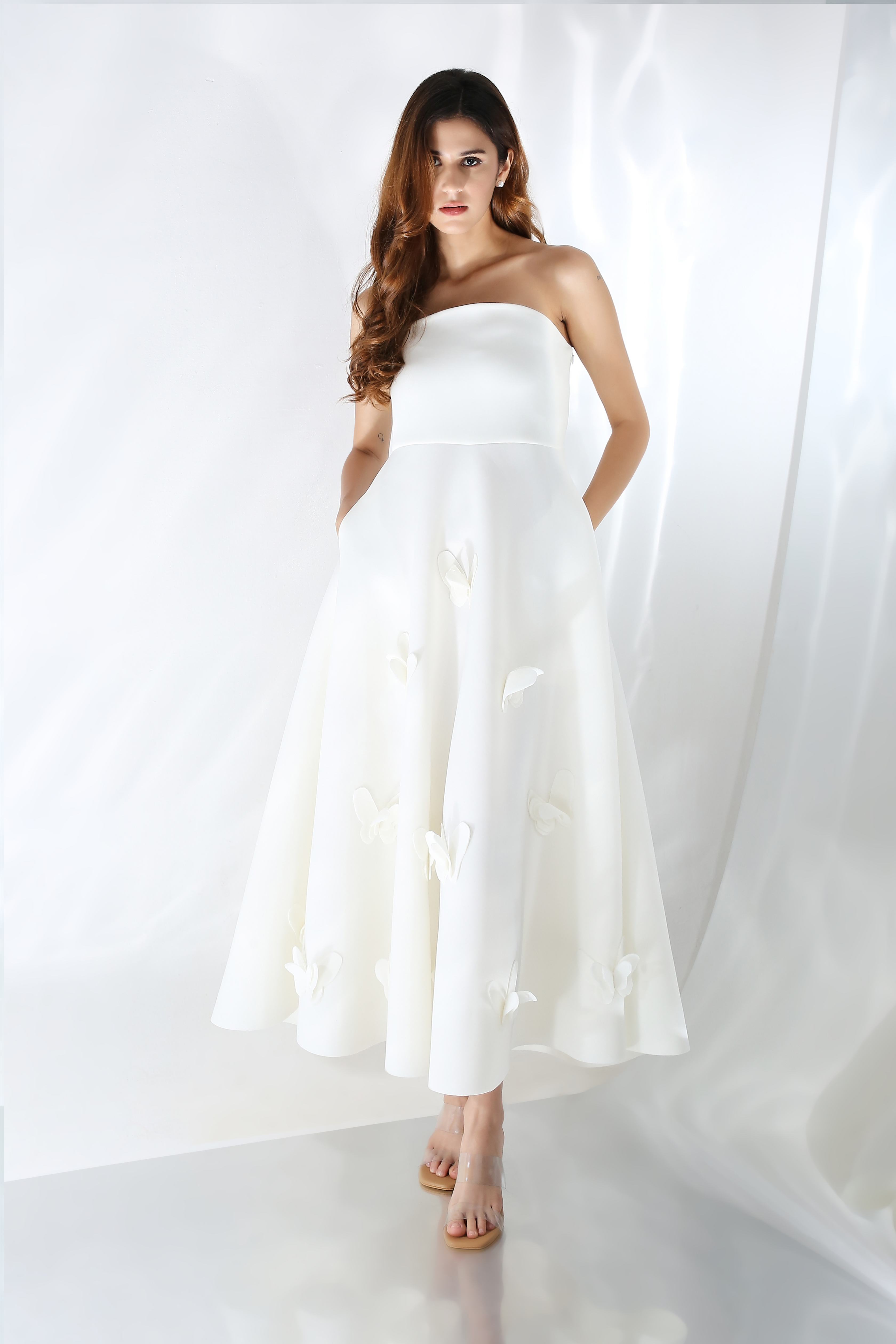 Featuring a strapless dress with pockets and a structured flare. It comes with a detachable wrap which can be worn off the shoulder, over one shoulder and reversed.