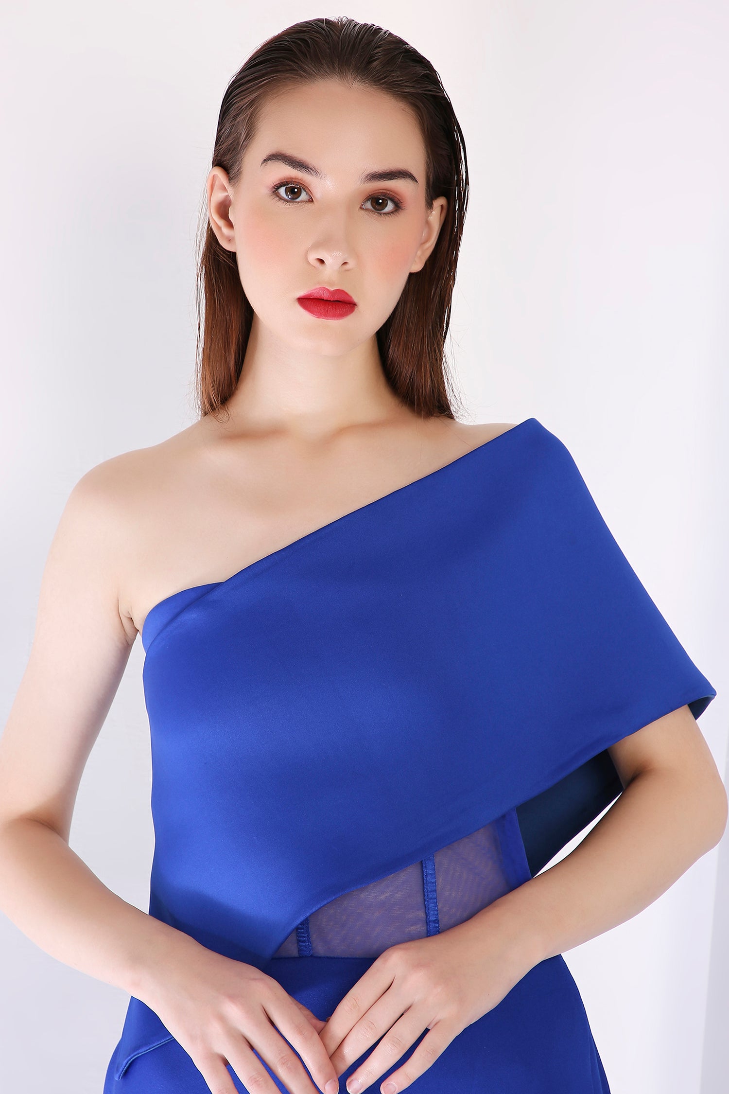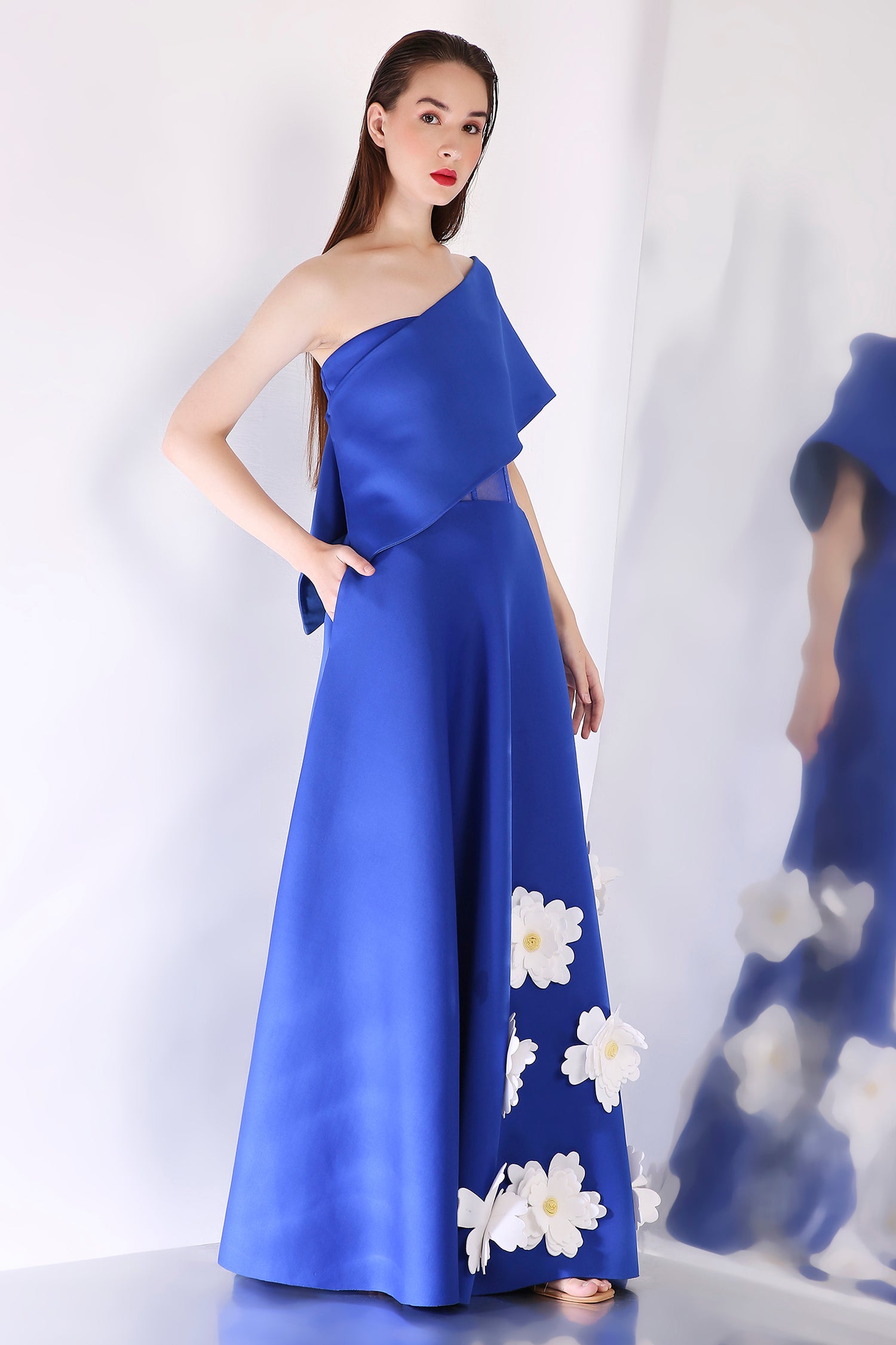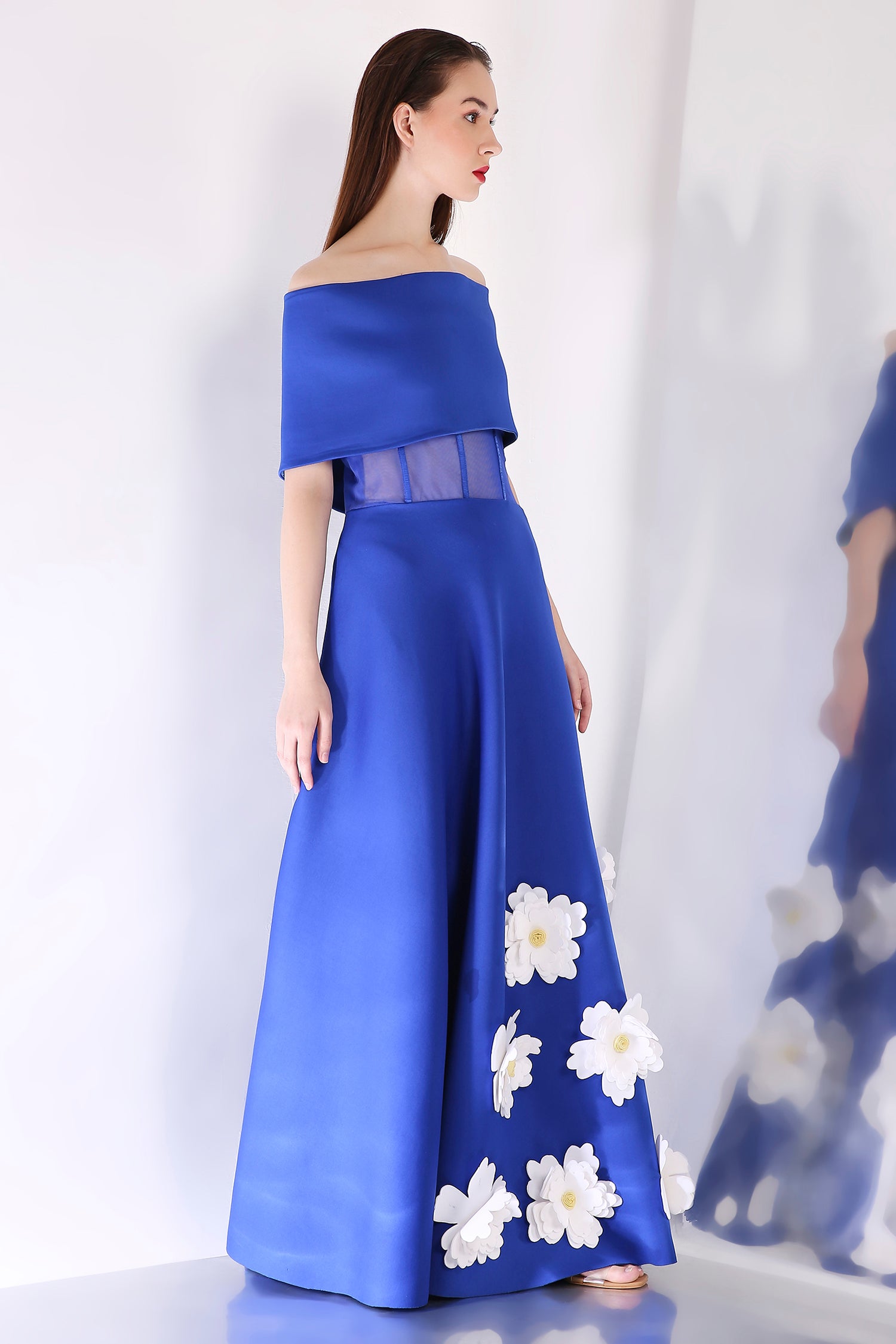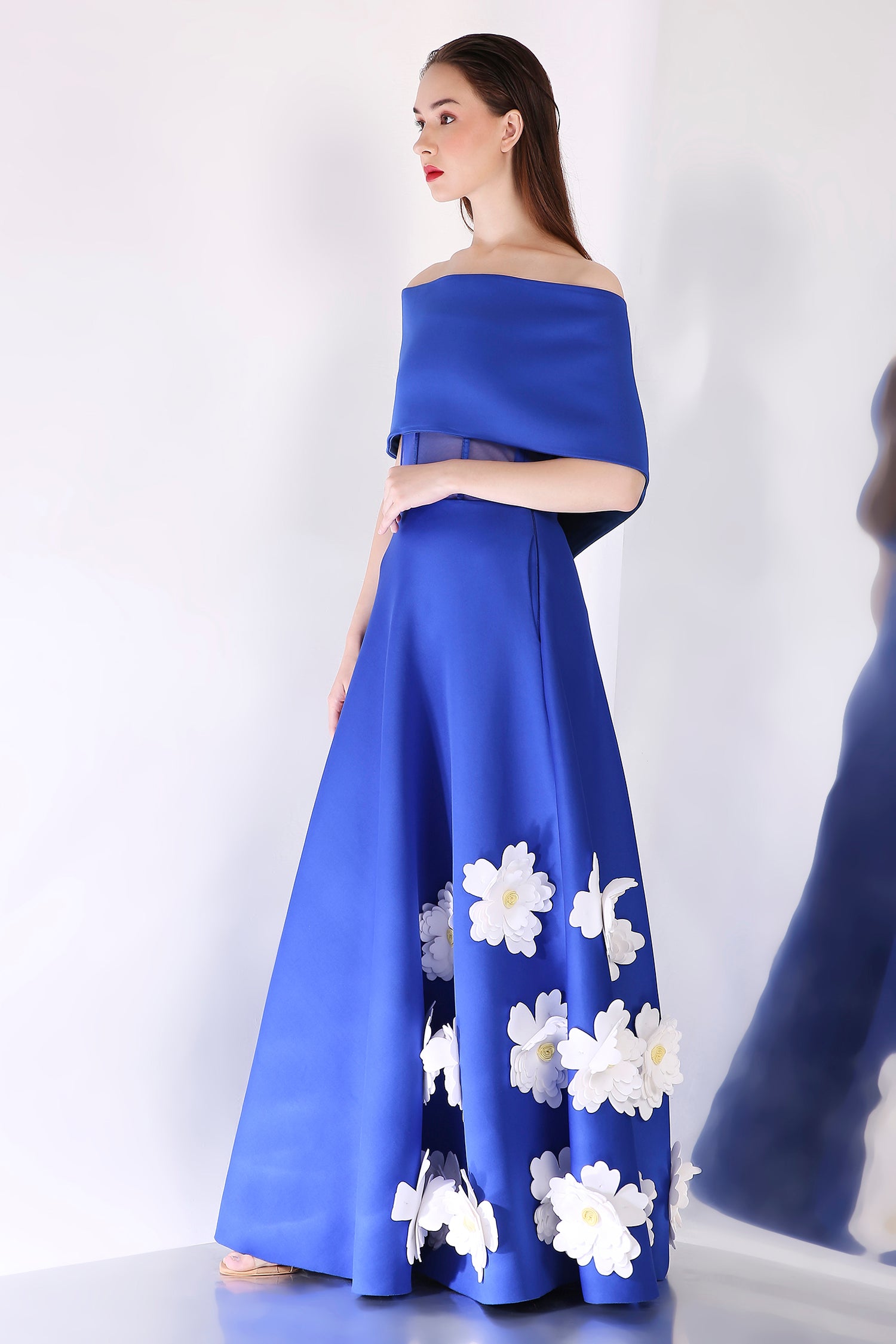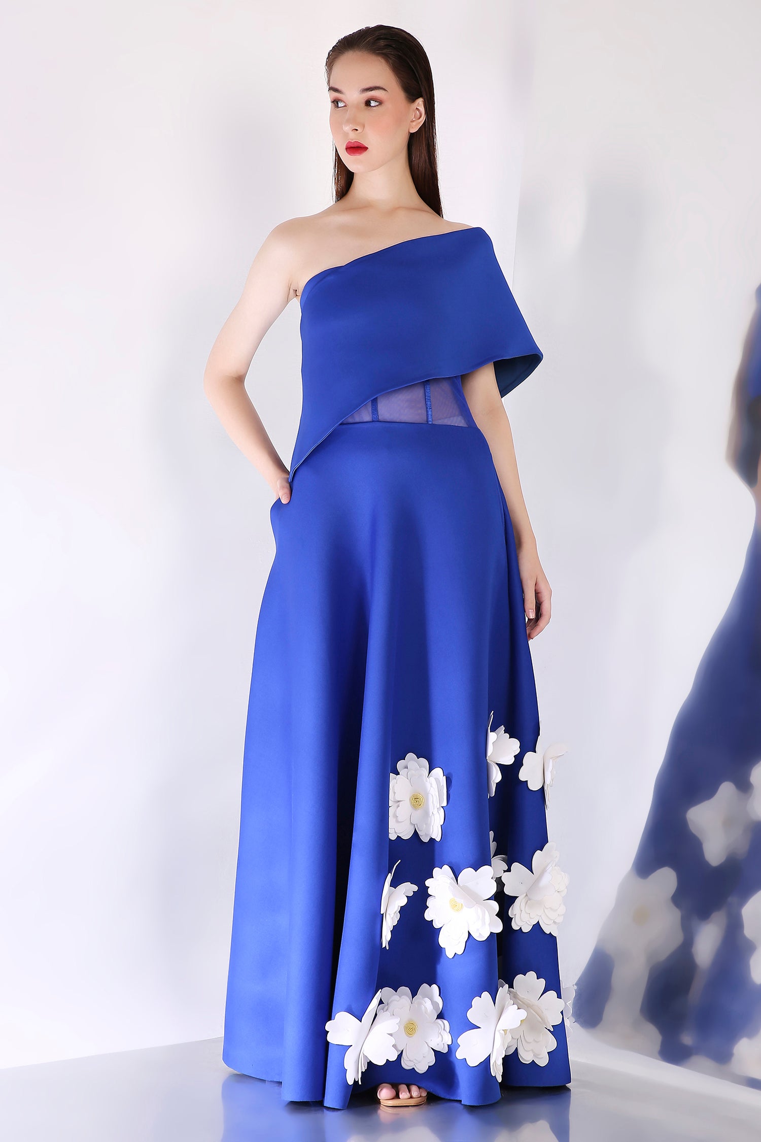 Crafted from premium neoprene fabric, this fit-and-flare maxi dress features mesh detailing at the waist and asymmetrical 3D floral accents along the hem. Paired with a versatile classic wrap, which can be styled both one-shoulder or off-shoulder, this ensemble offers modern structure with timeless elegance—perfect for any formal occasion.