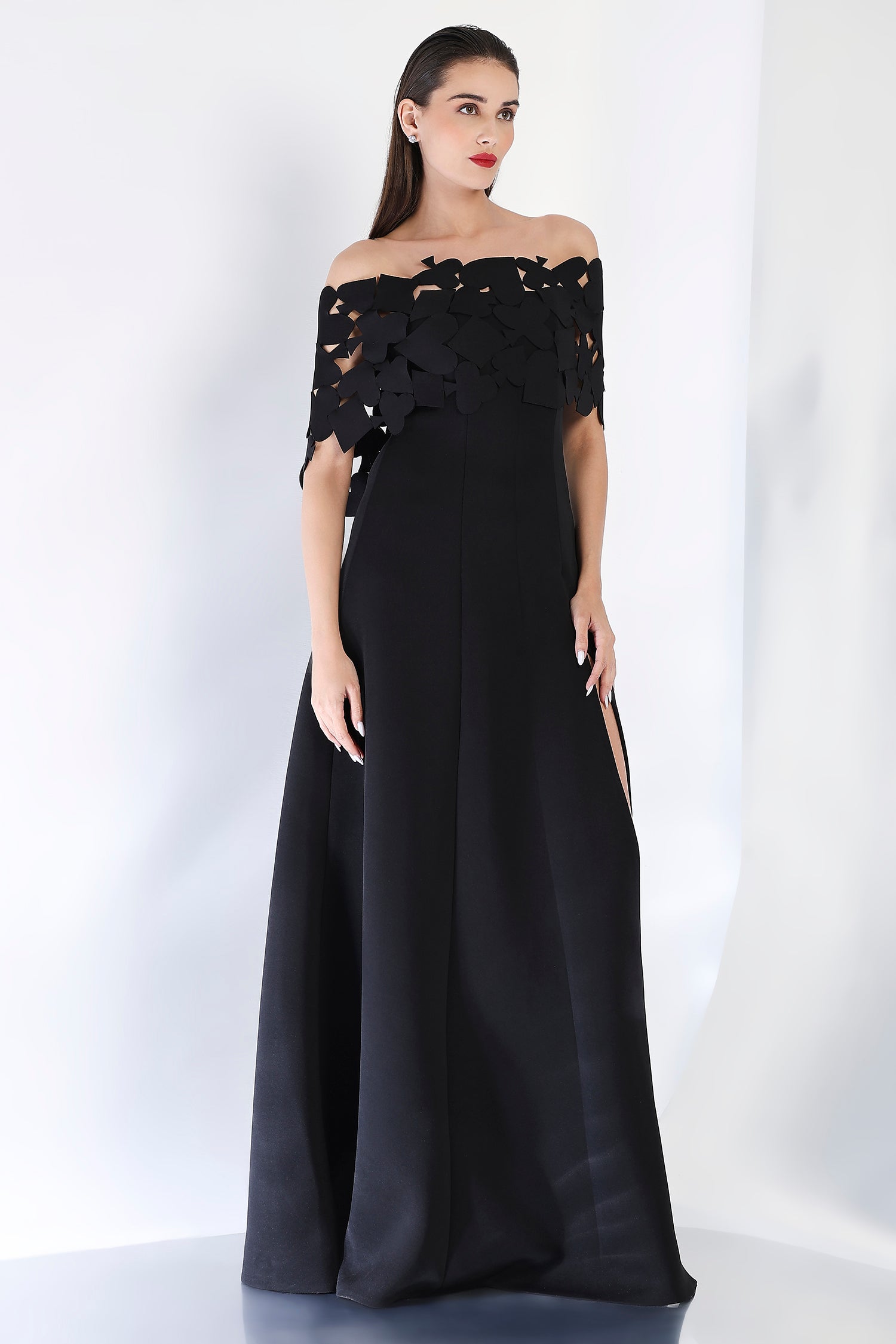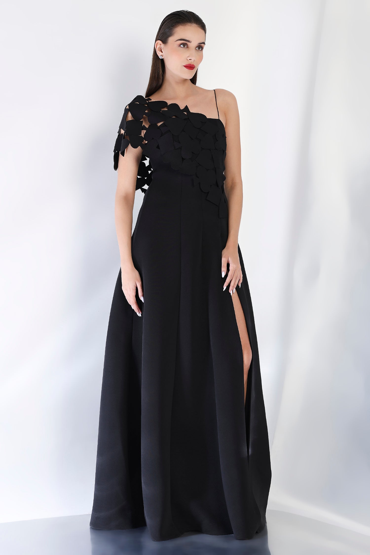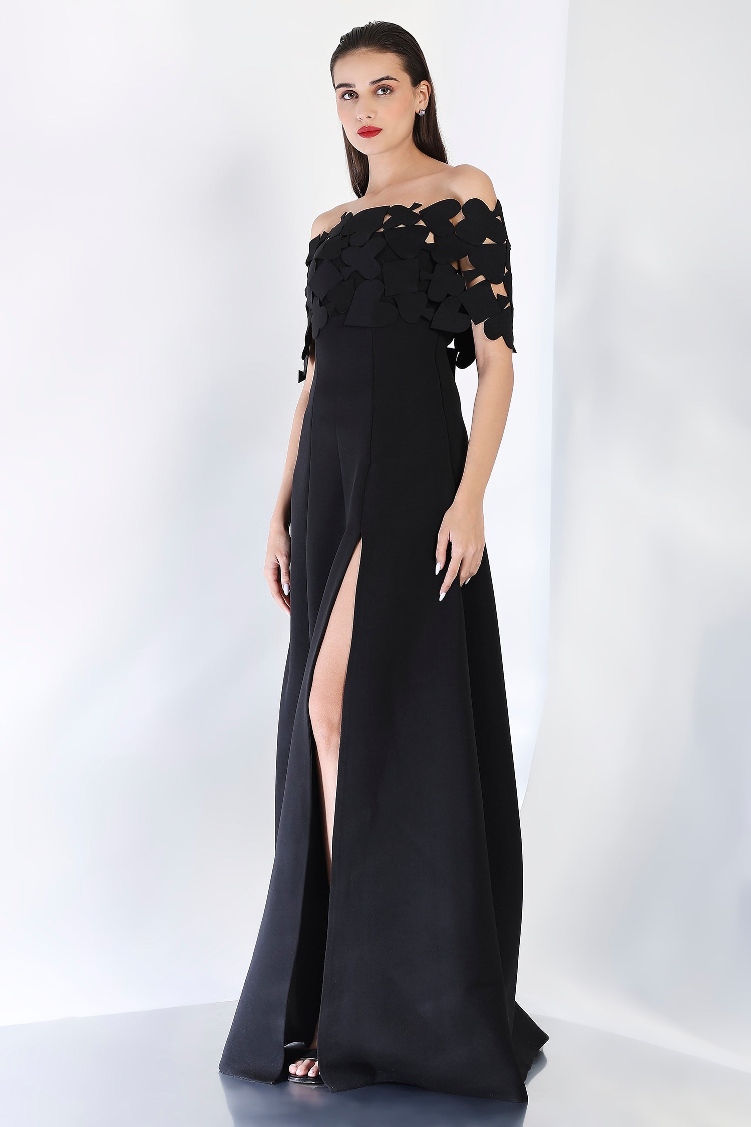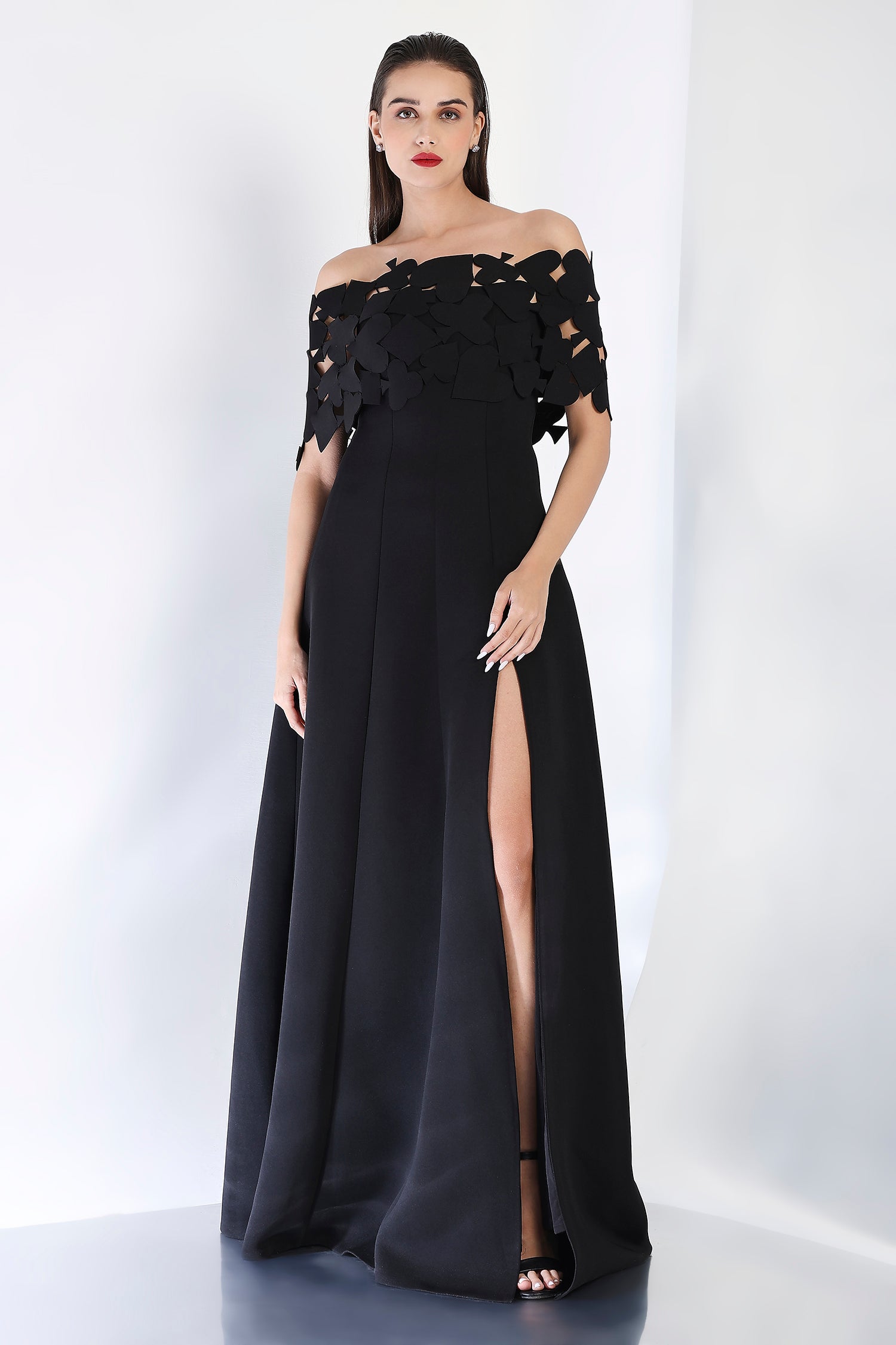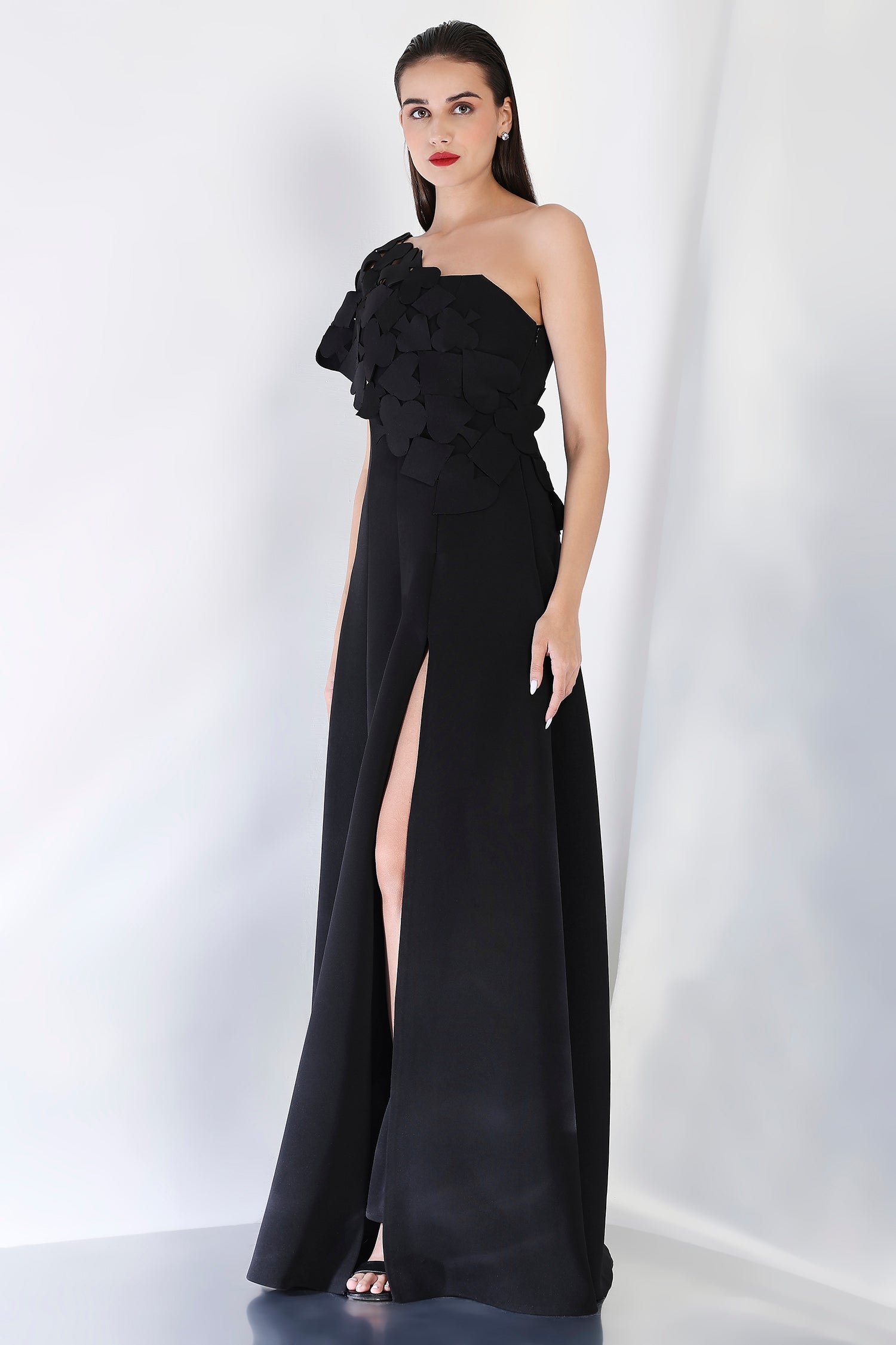 Designed for the modern fashionista, this strapless panel dress with a front slit creates an elegantly sleek shape. The ace cutout wrap, which can be styled as one-shoulder or off-shoulder, adds a contemporary edge to this sophisticated piece, making it perfect for an evening out or any formal gathering where style and poise are paramount.