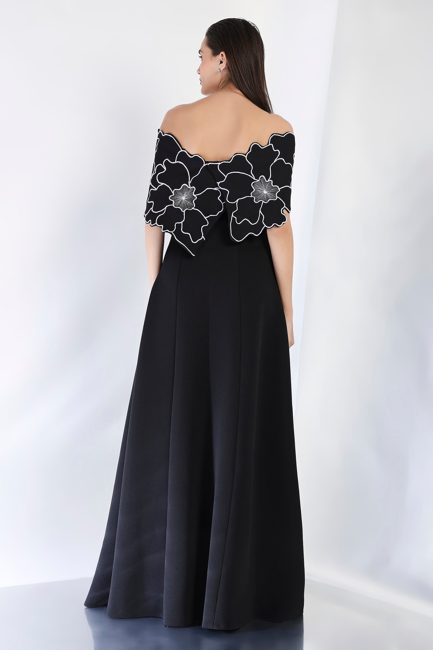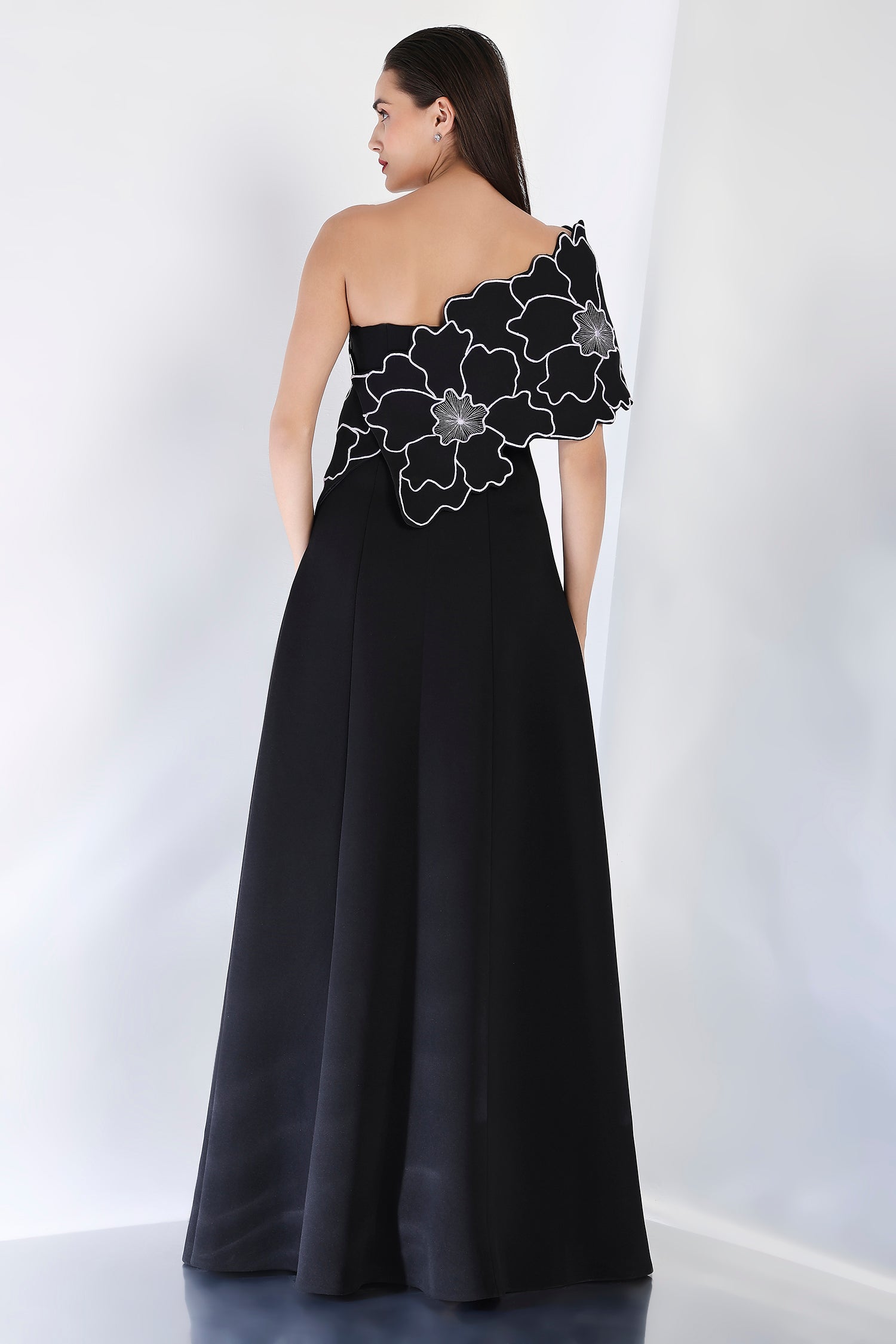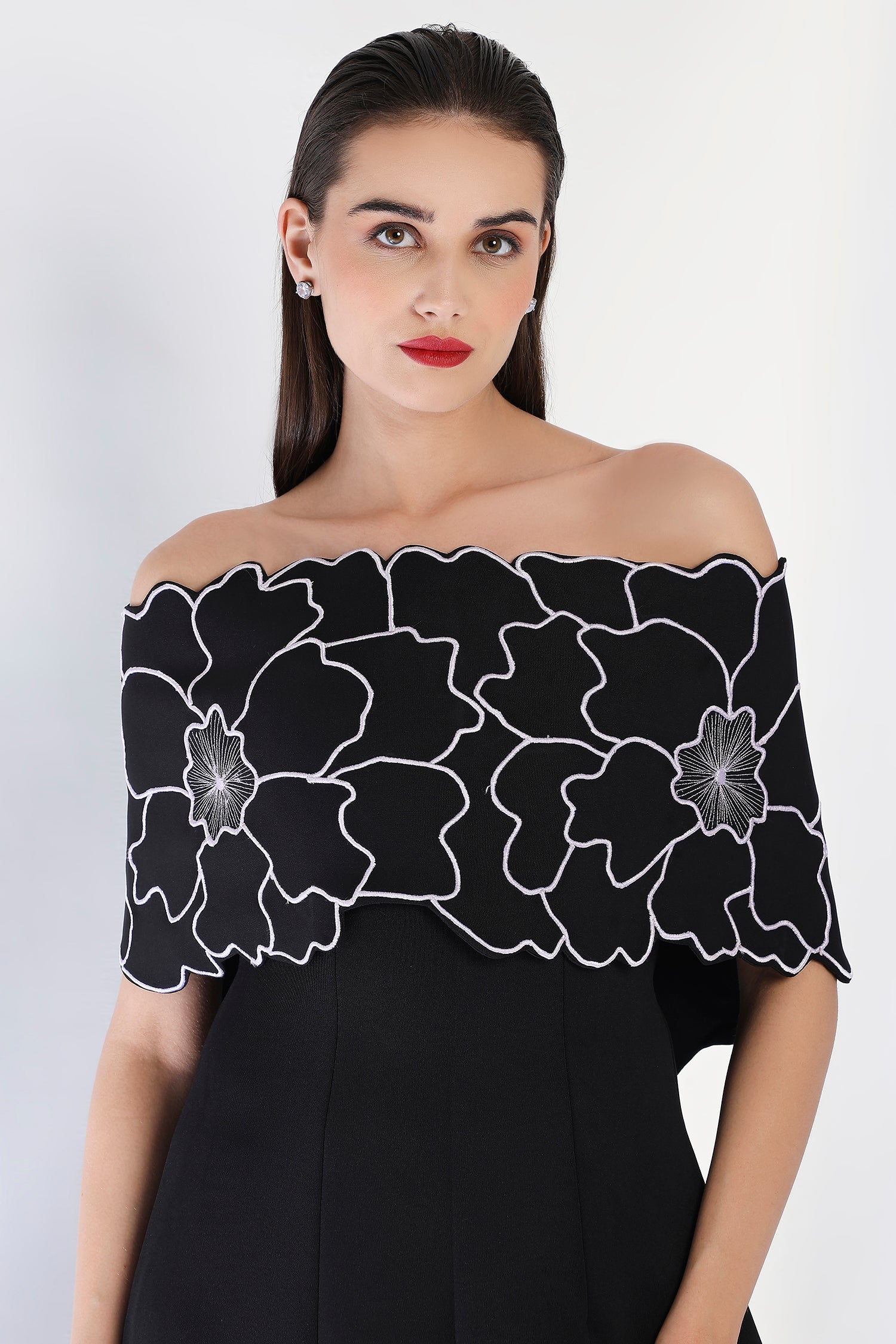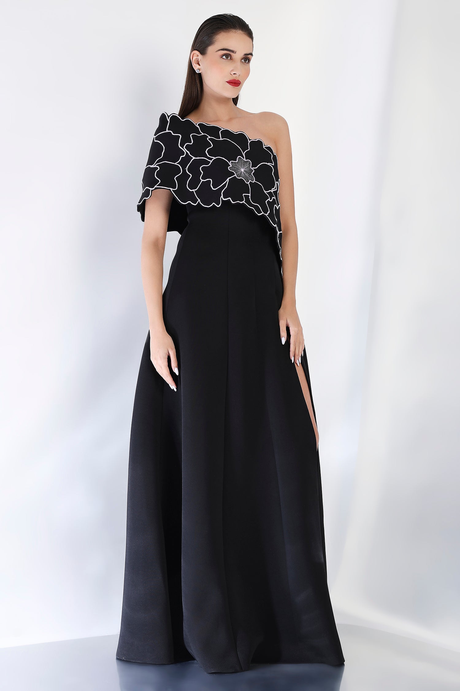 This strapless panel dress with a sultry front slit is paired with the Bella embroidered wrap, which can be styled either one-shoulder or off-shoulder. The intricate embroidery adds an element of artistry and refinement, making this an exquisite choice for an evening event where sophistication and style are a must.