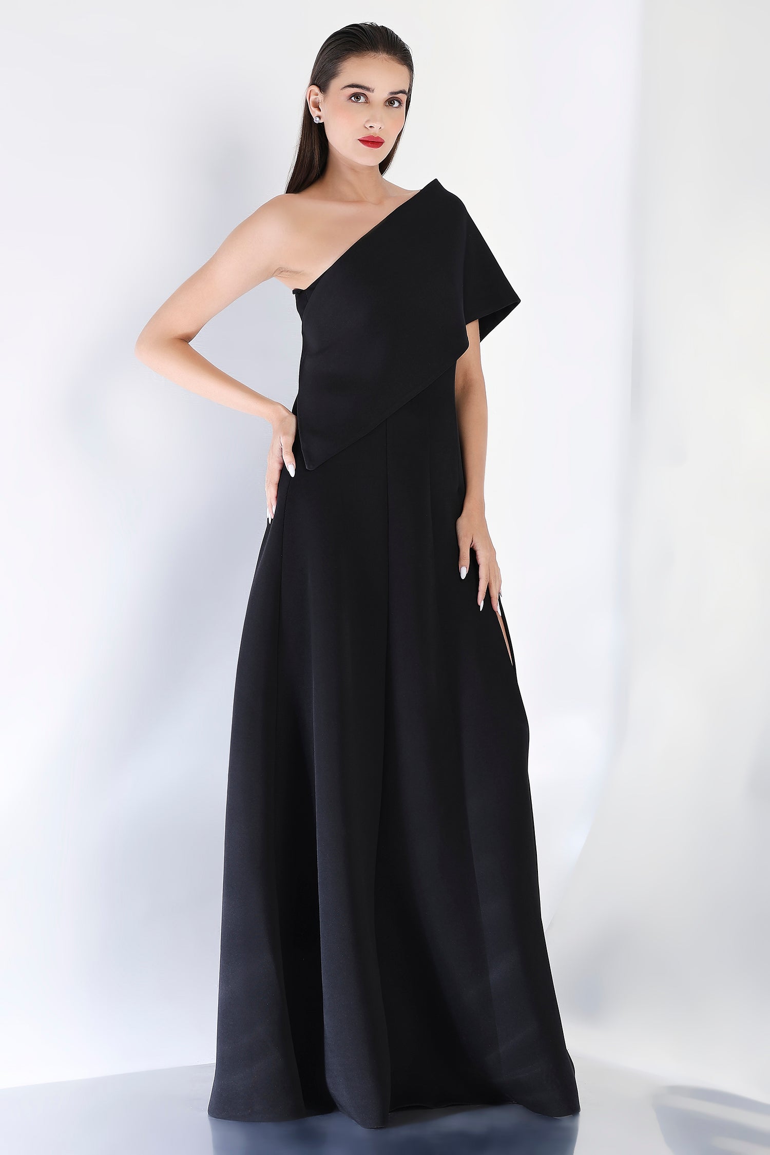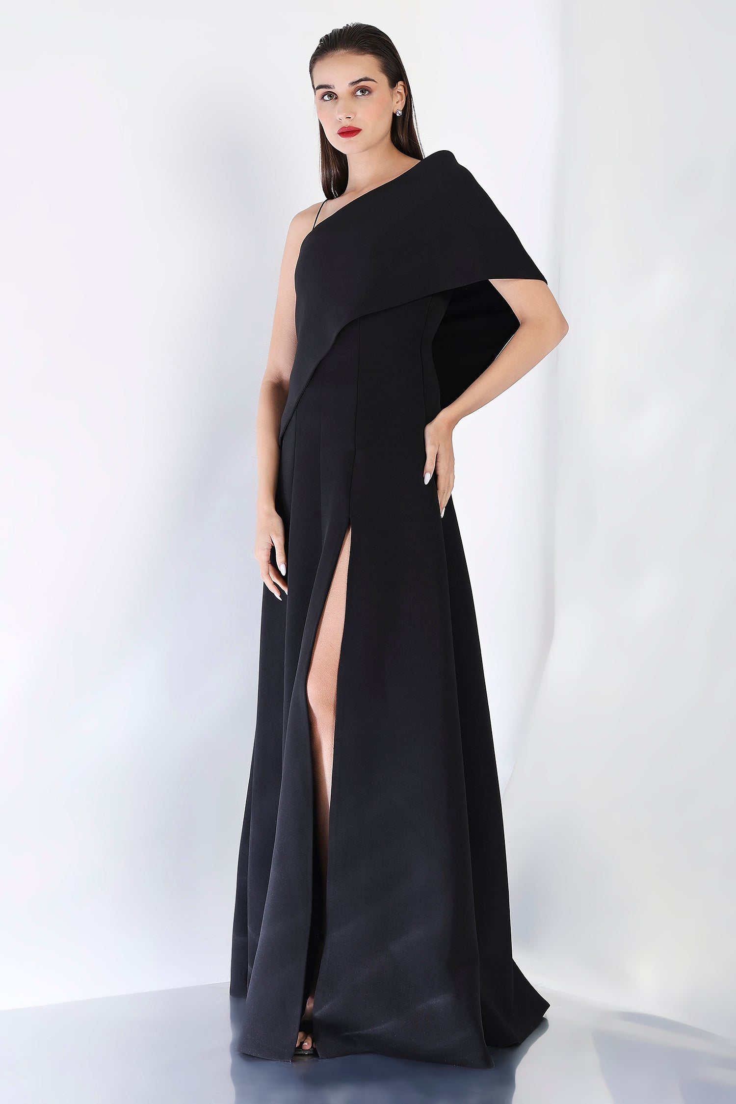 A striking fusion of structure and fluidity, this strapless panel dress with a front slit maxi design exudes sophistication. The classic wrap, which can be styled as one-shoulder or off-shoulder, adds a touch of versatility to the look, making this ensemble ideal for upscale occasions where grace and elegance are essential.