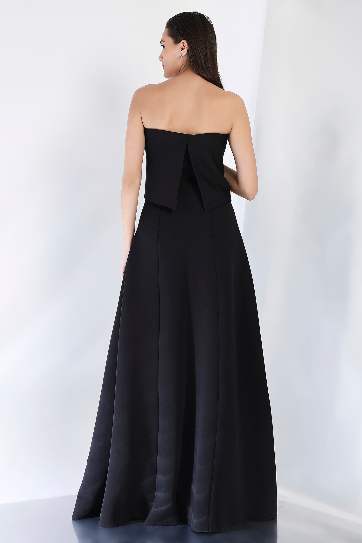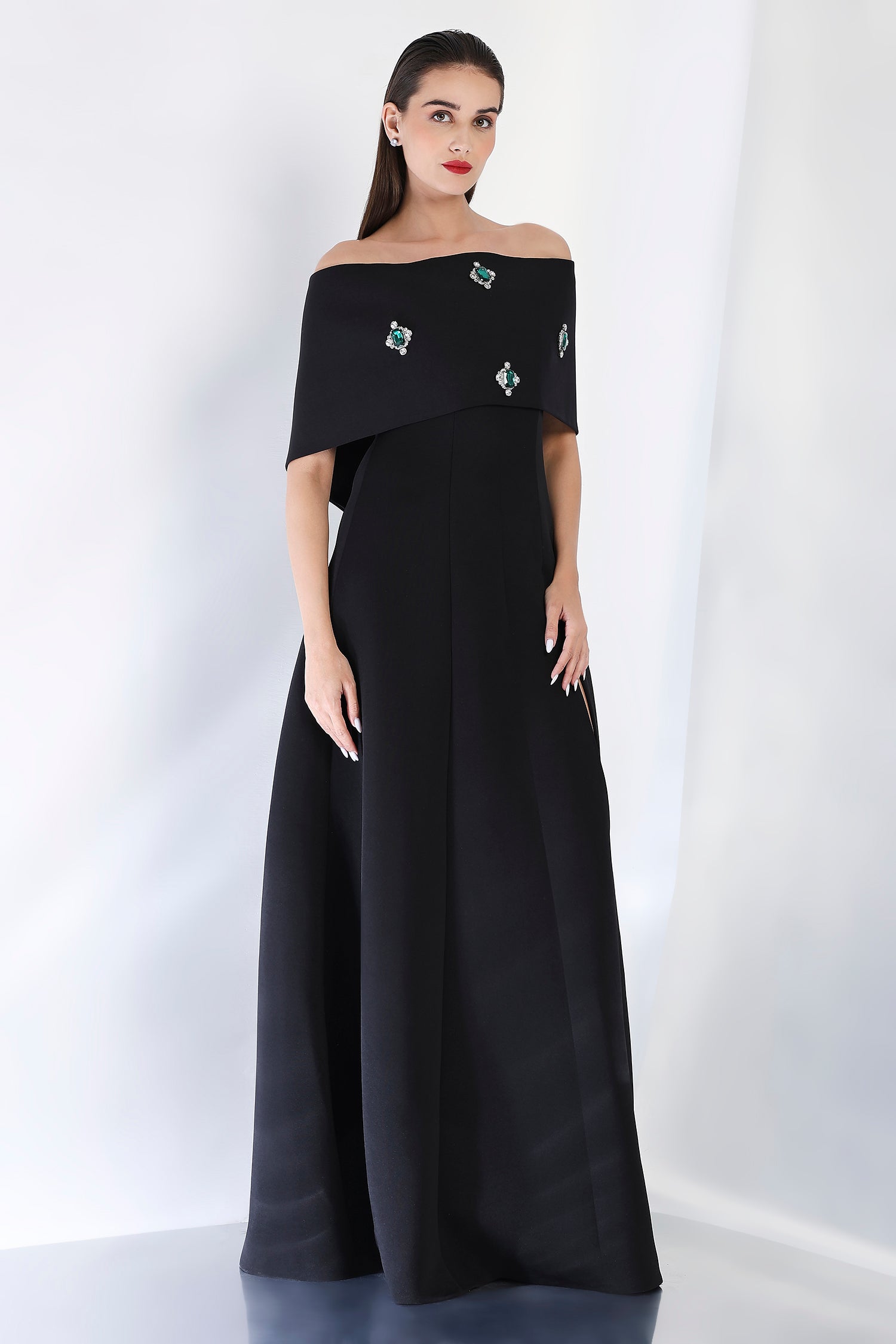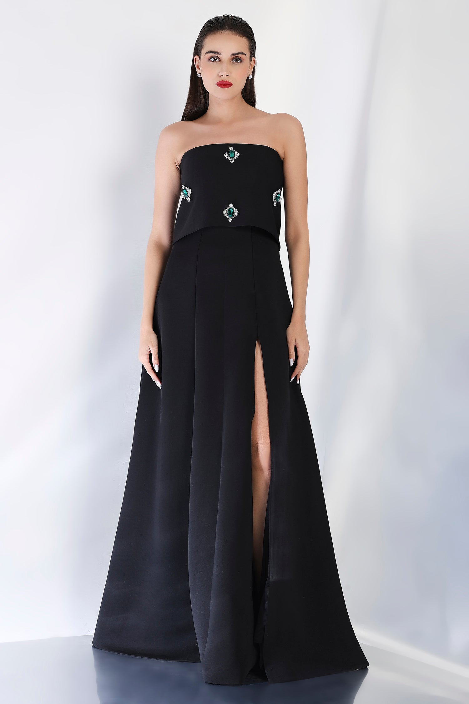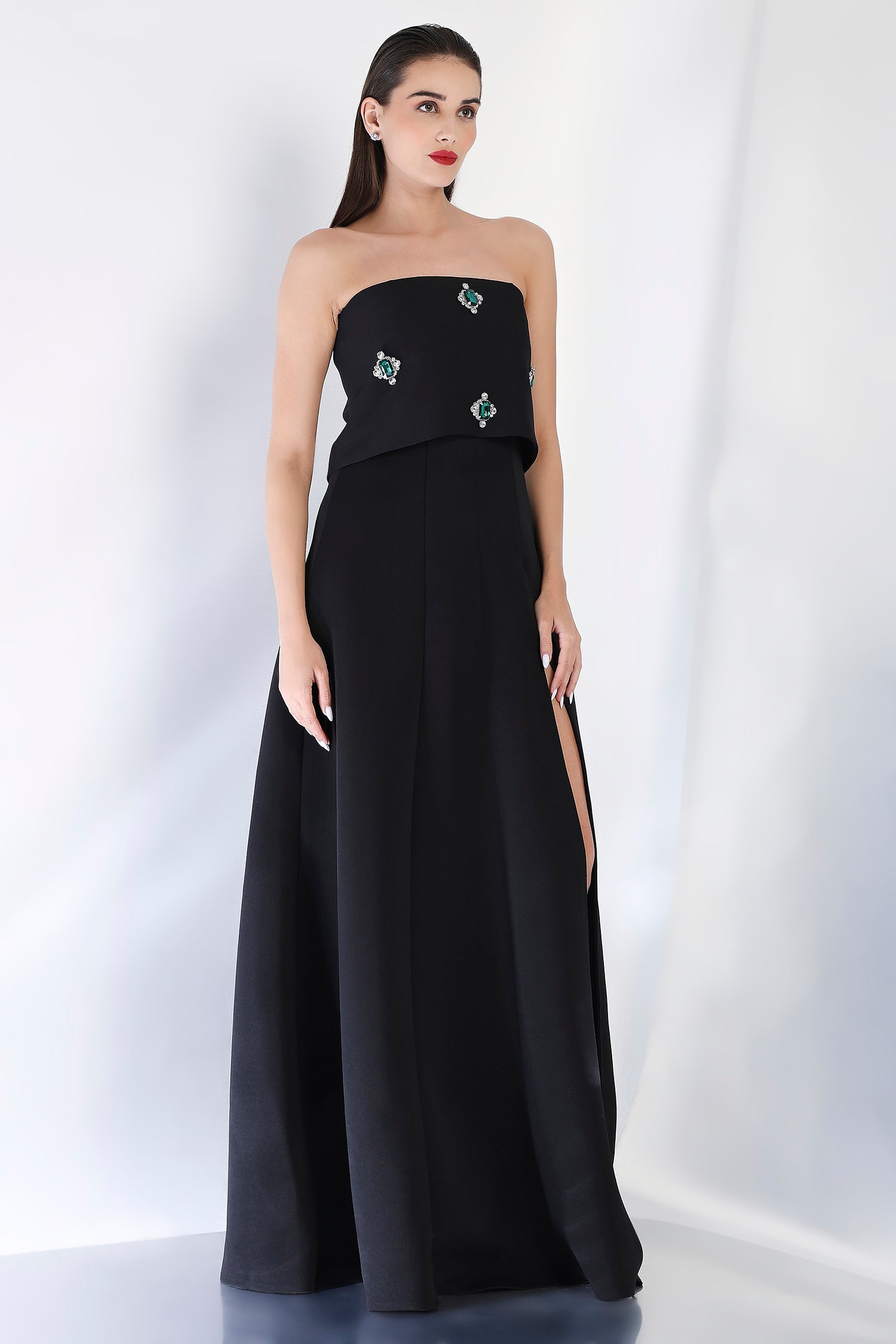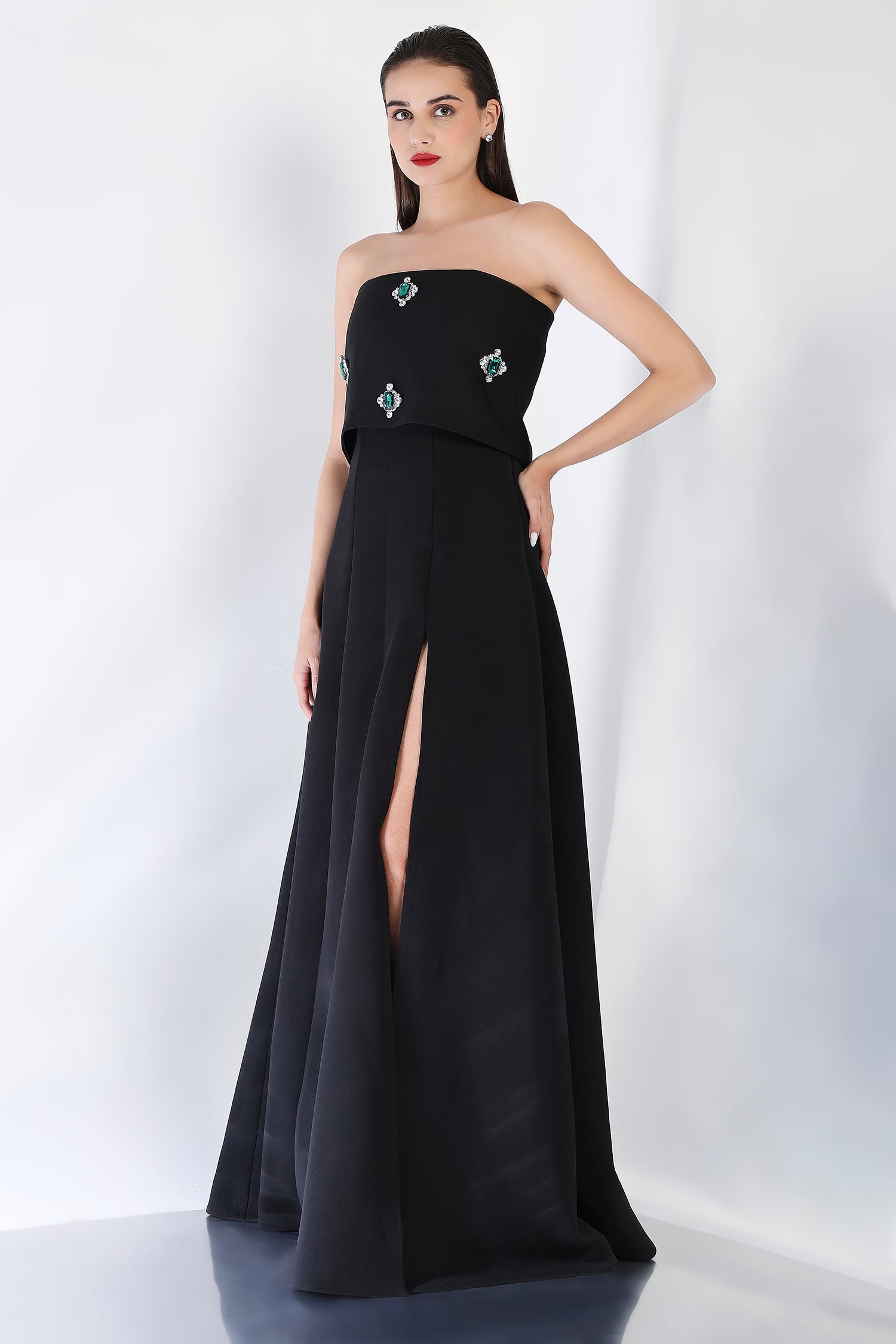 Timeless and luxurious, this strapless panel dress with a front slit creates a sleek, flattering shape. The emerald-studded wrap, positioned at the center, can be styled either one-shoulder or off-shoulder, offering a sparkling focal point to the ensemble. Perfect for those seeking a glamorous and refined look for an evening celebration.
