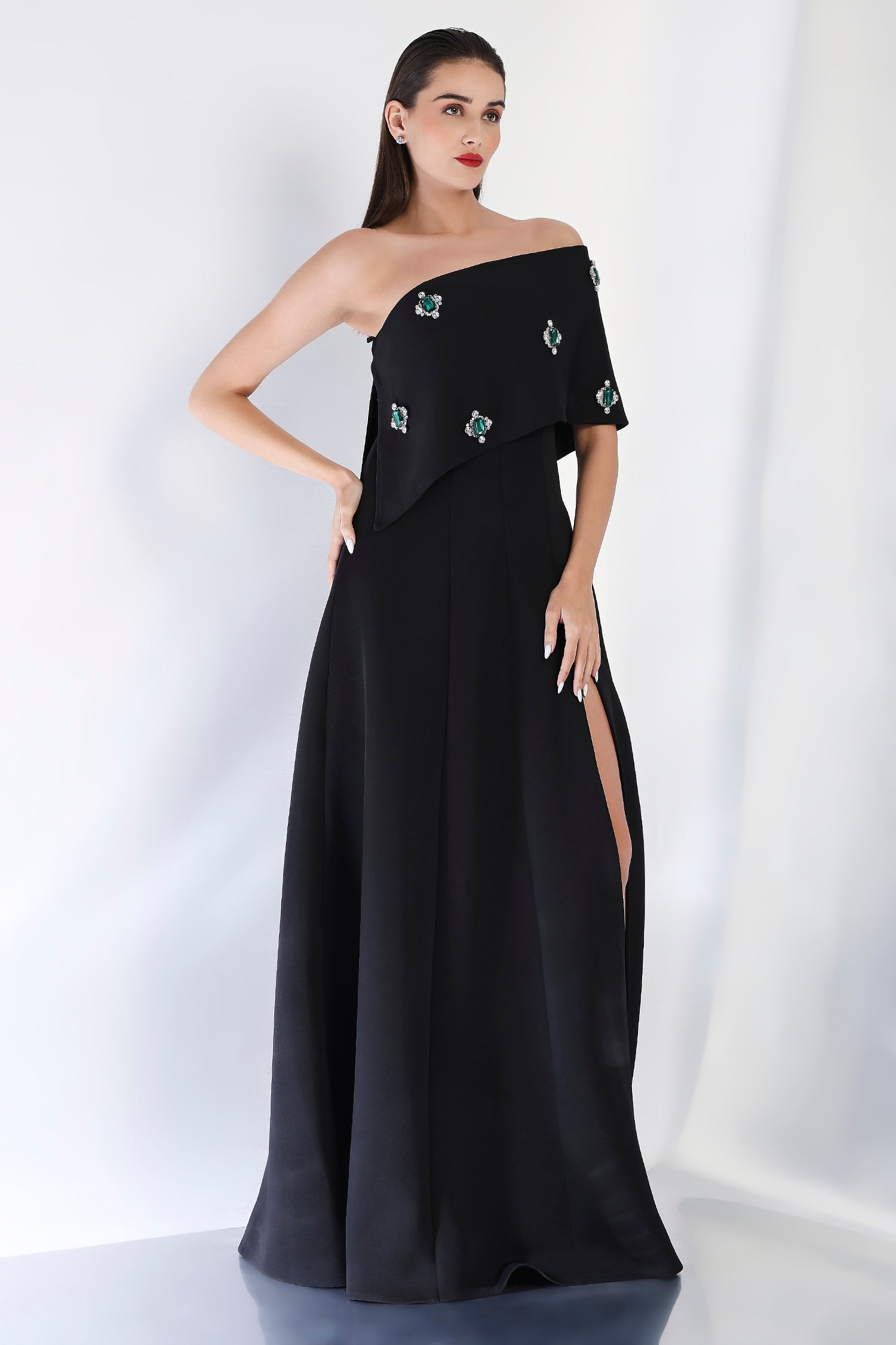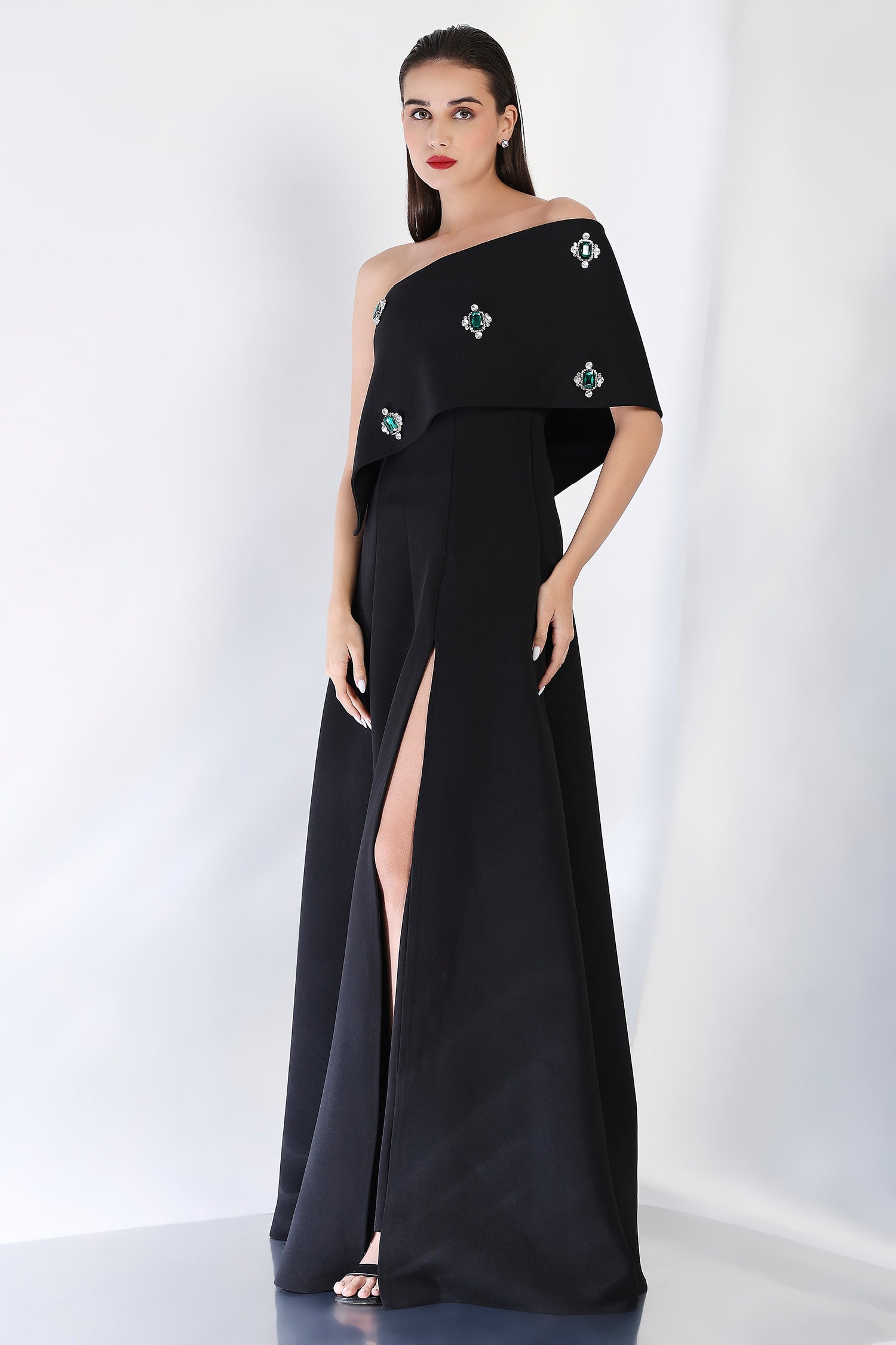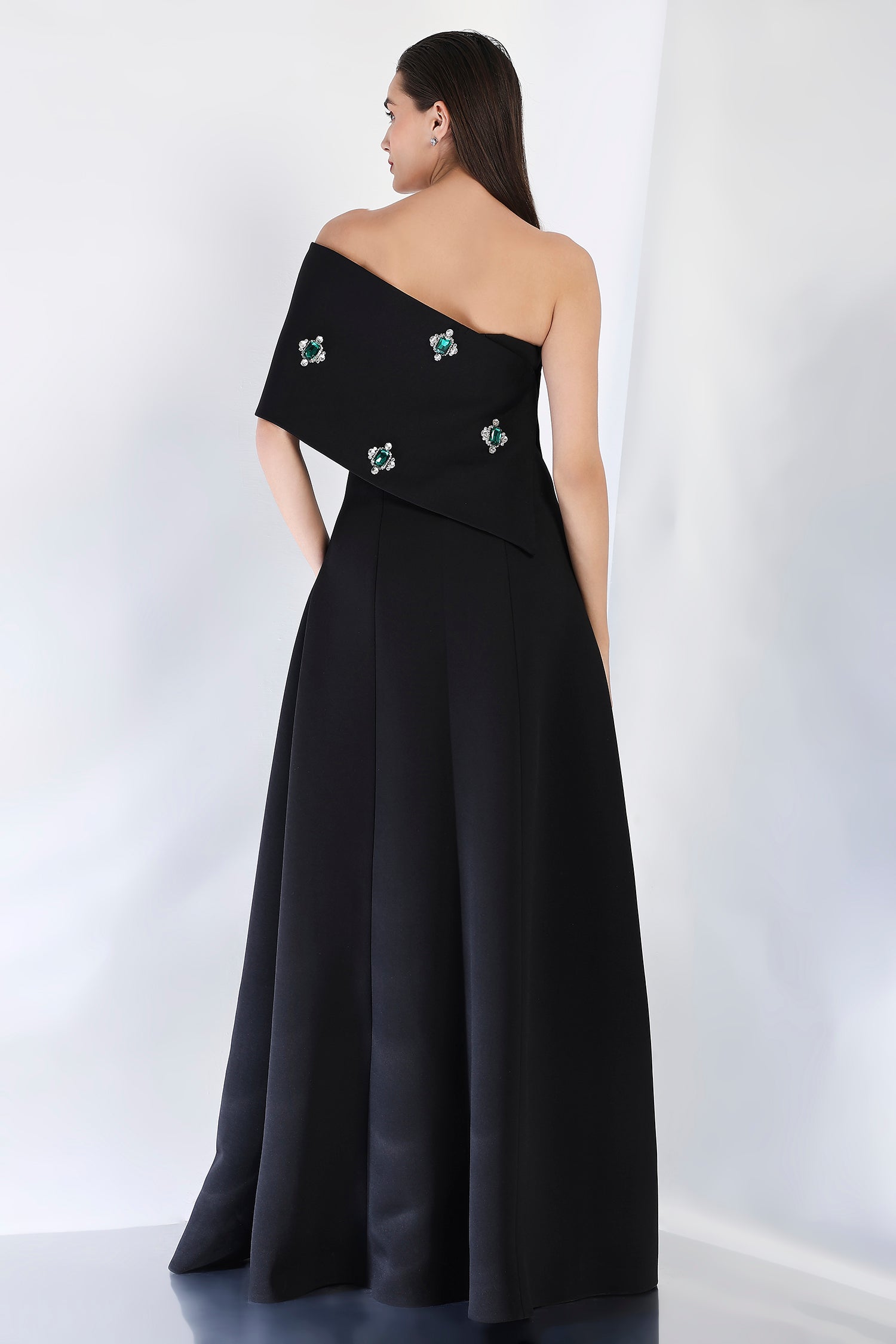 With its sleek and flattering silhouette, this strapless panel maxi dress is elevated by an emerald-studded wrap that covers the entire piece. Styled either one-shoulder or off-shoulder, this stunning detail brings a touch of luxury and sophistication, making it the perfect choice for upscale occasions and formal gatherings.