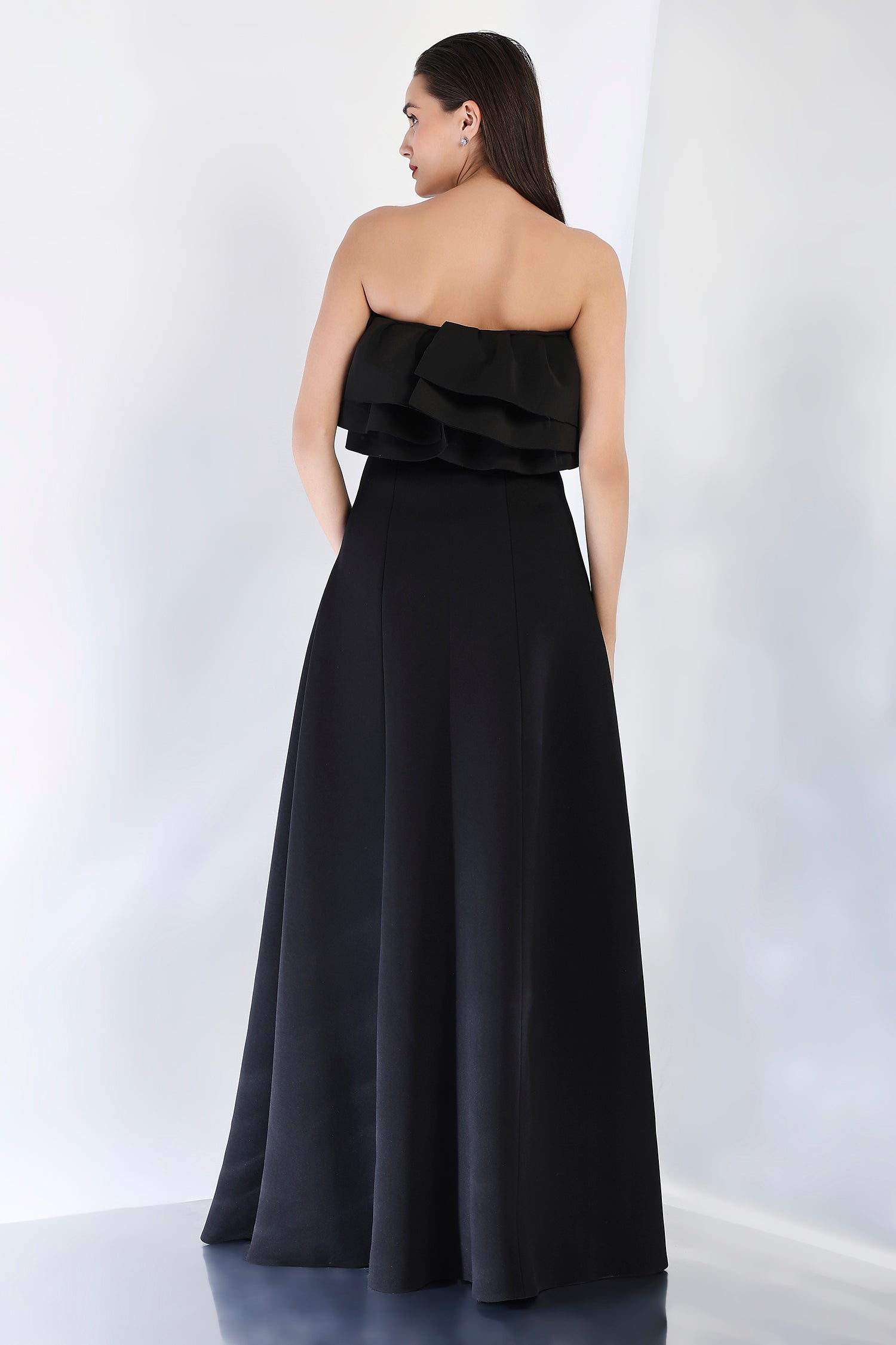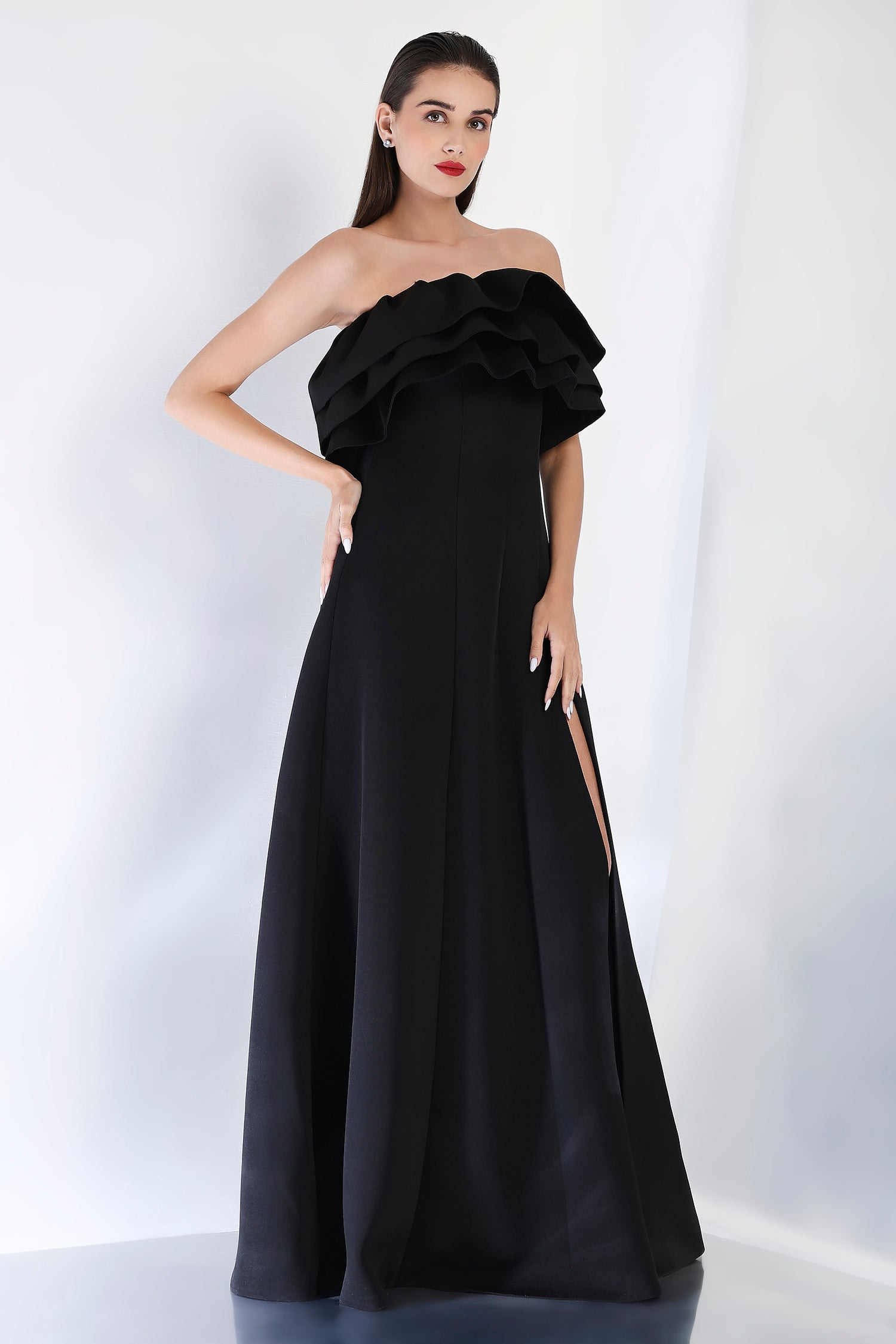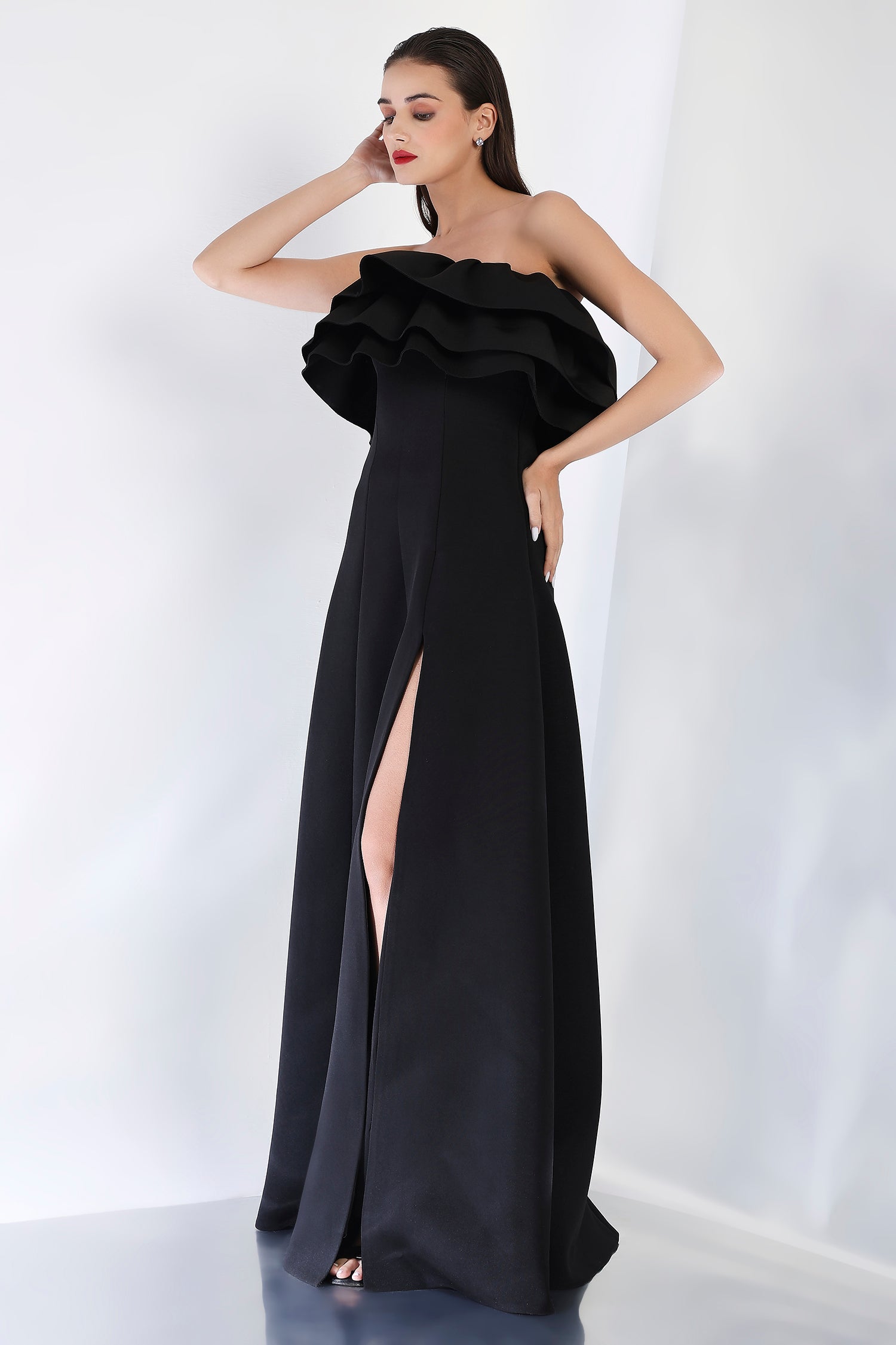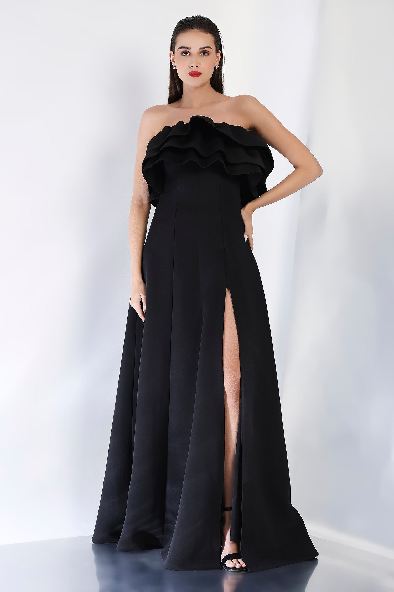 Gracefully designed with a front slit and strapless silhouette, this panel maxi dress offers an alluring yet sophisticated shape. The three-layer ruffle wrap, which can be styled as one-shoulder or off-shoulder, adds texture and movement to the dress, perfect for those looking for a refined yet playful look for a formal affair.