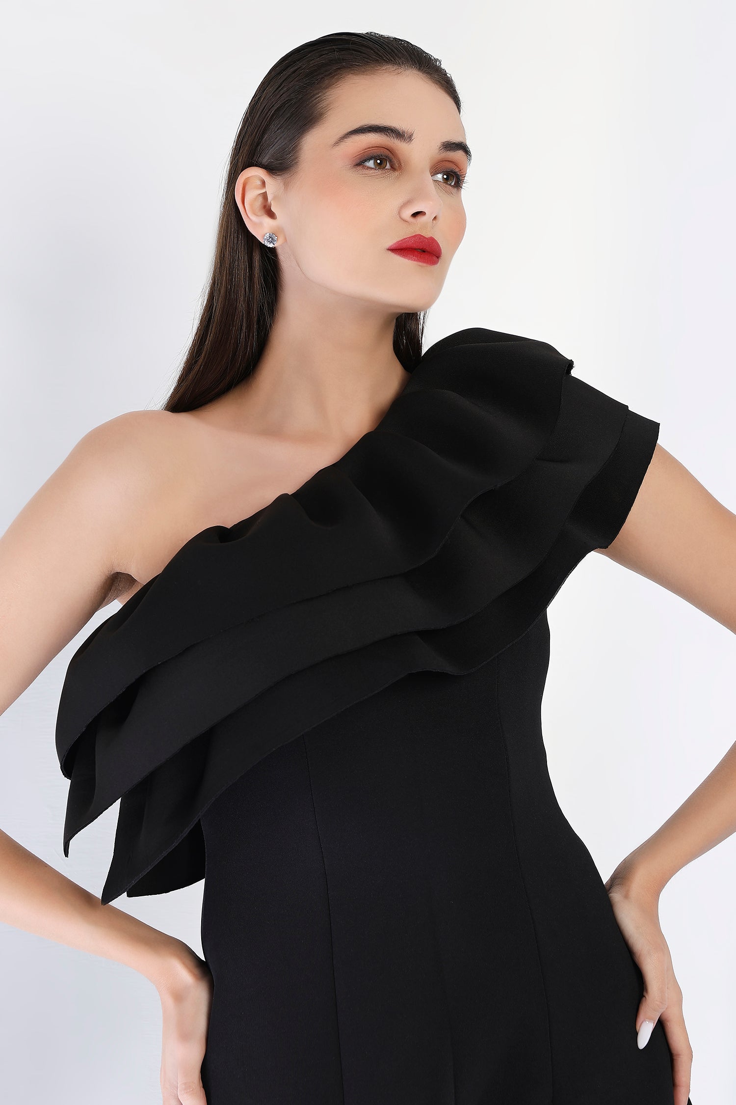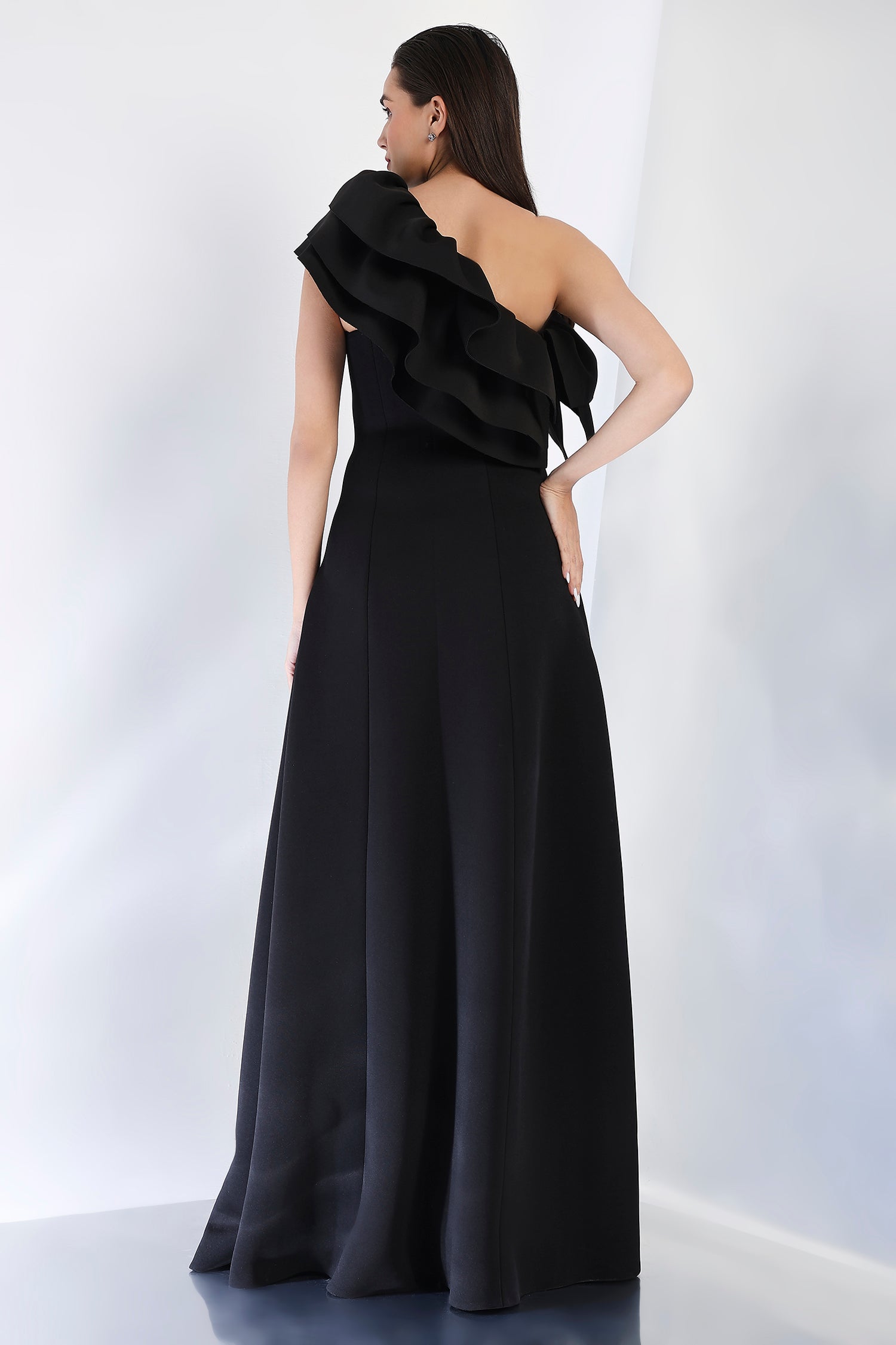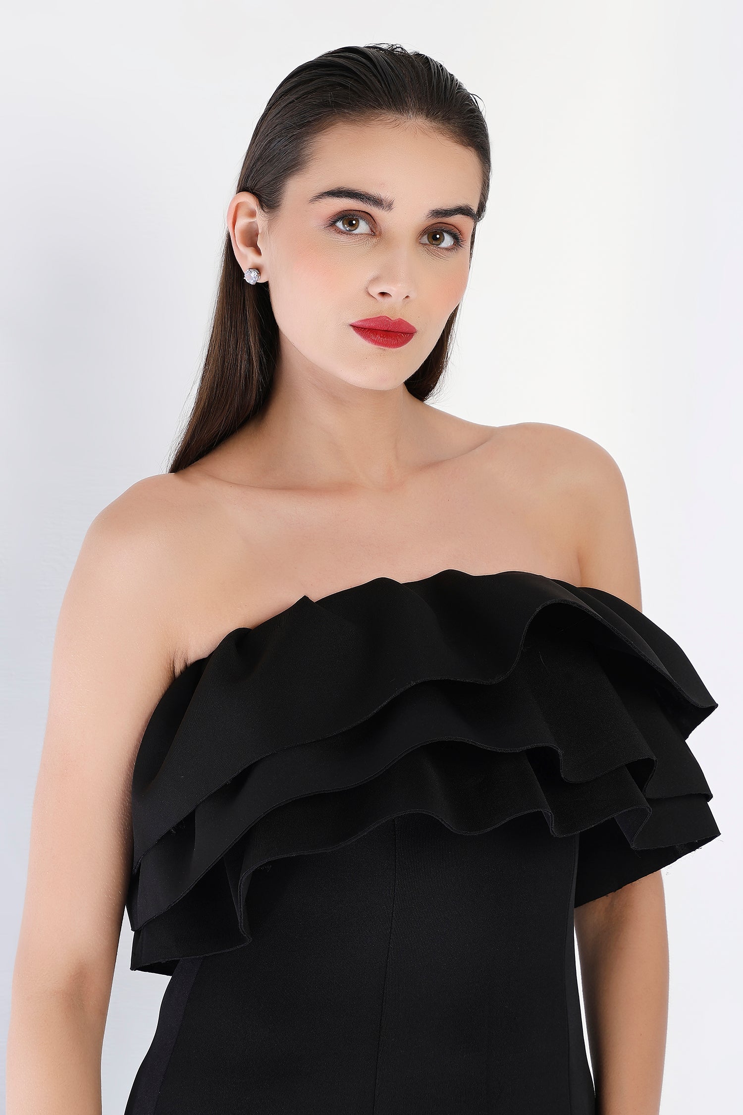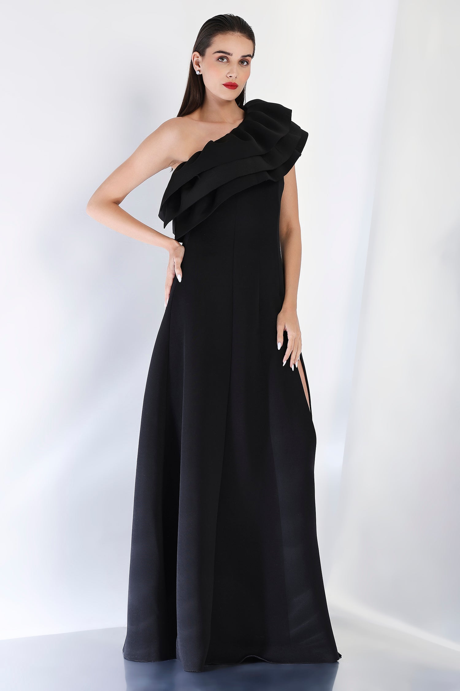 Gracefully designed with a front slit and strapless silhouette, this panel maxi dress offers an alluring yet sophisticated shape. The three-layer ruffle wrap, which can be styled as one-shoulder or off-shoulder, adds texture and movement to the dress, perfect for those looking for a refined yet playful look for a formal affair.