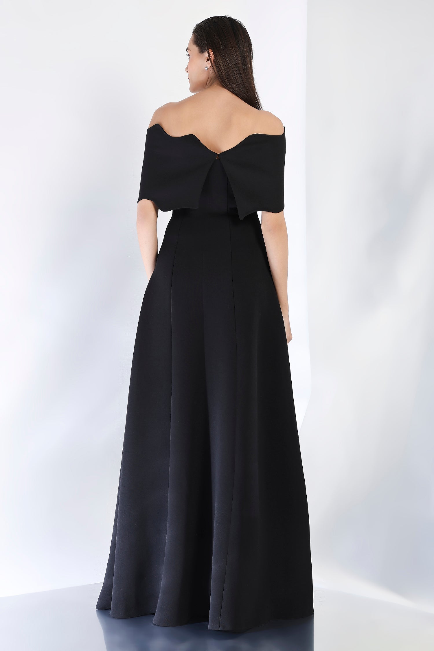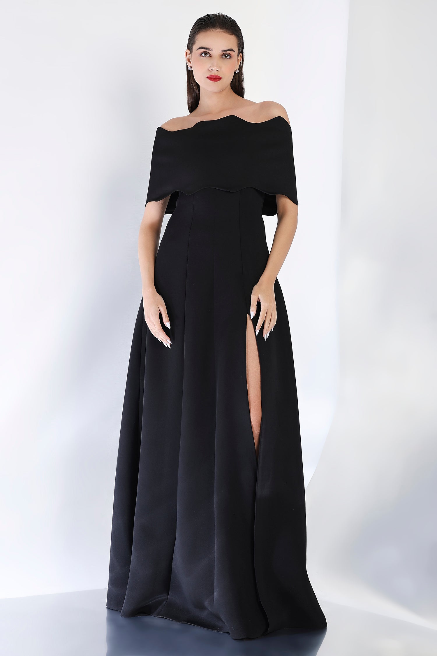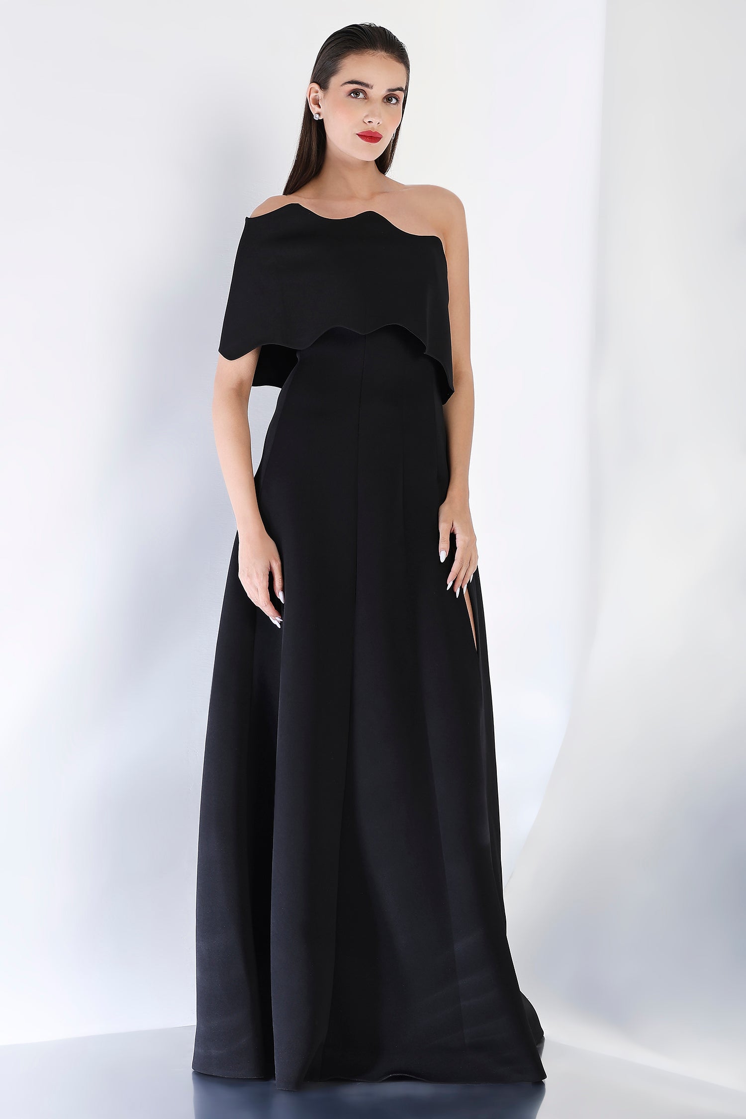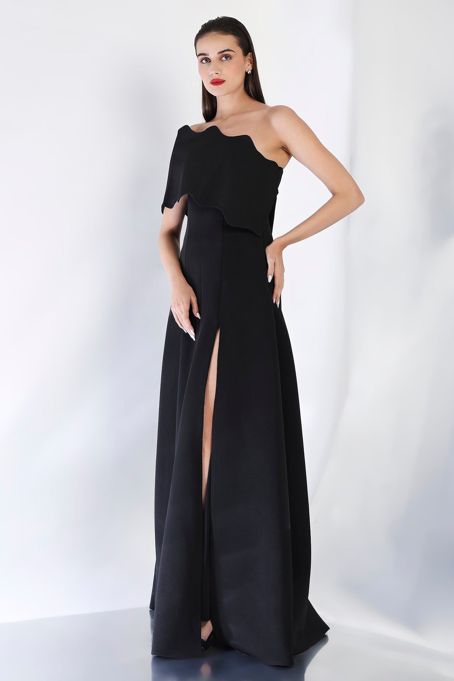 The flattering fit of this strapless panel dress, combined with its front slit maxi length, creates an effortlessly chic silhouette. Paired with a wave wrap that can be styled both one-shoulder or off-shoulder, this ensemble offers a sophisticated twist on modern fashion, perfect for both formal and semi-formal events.