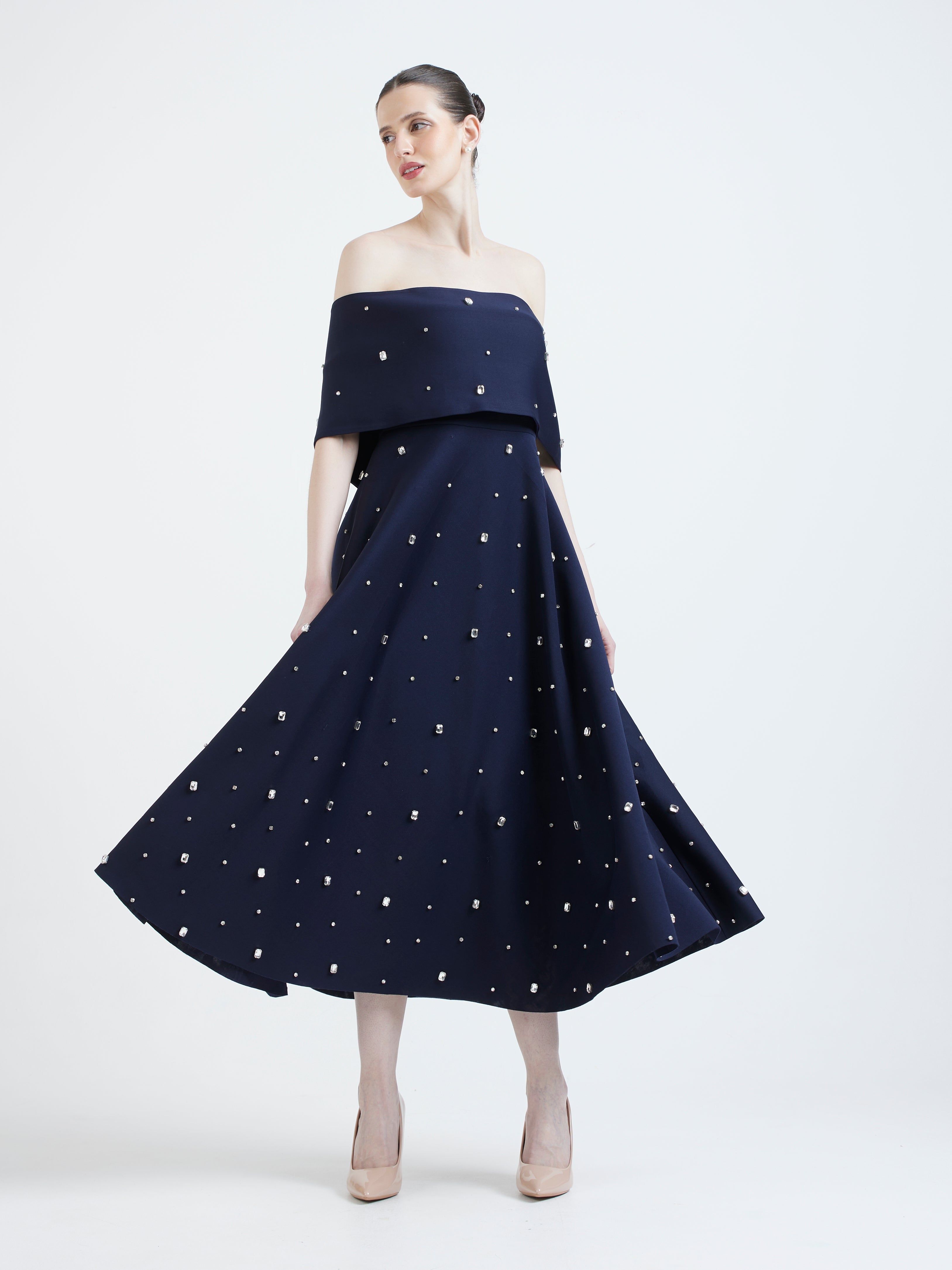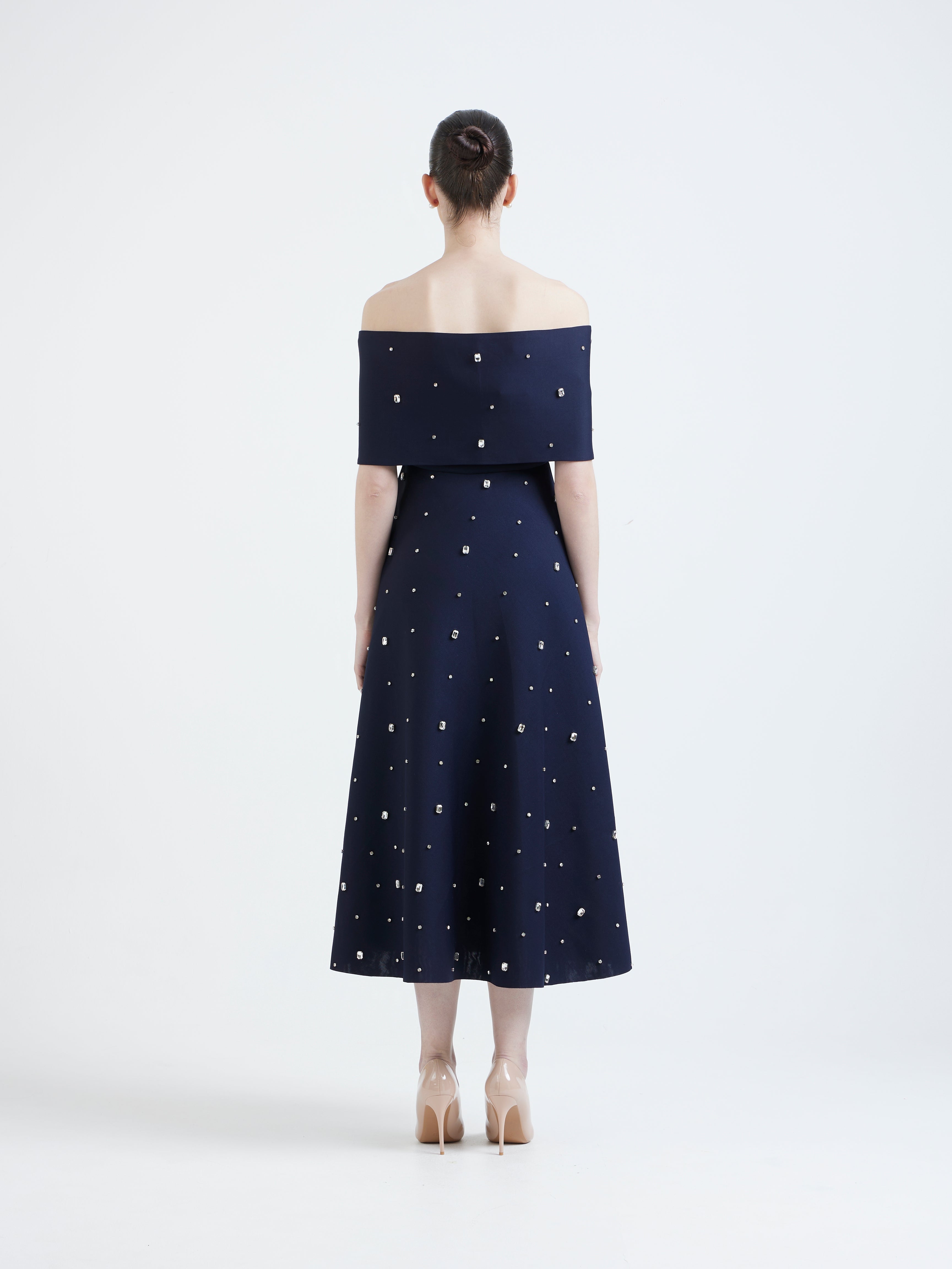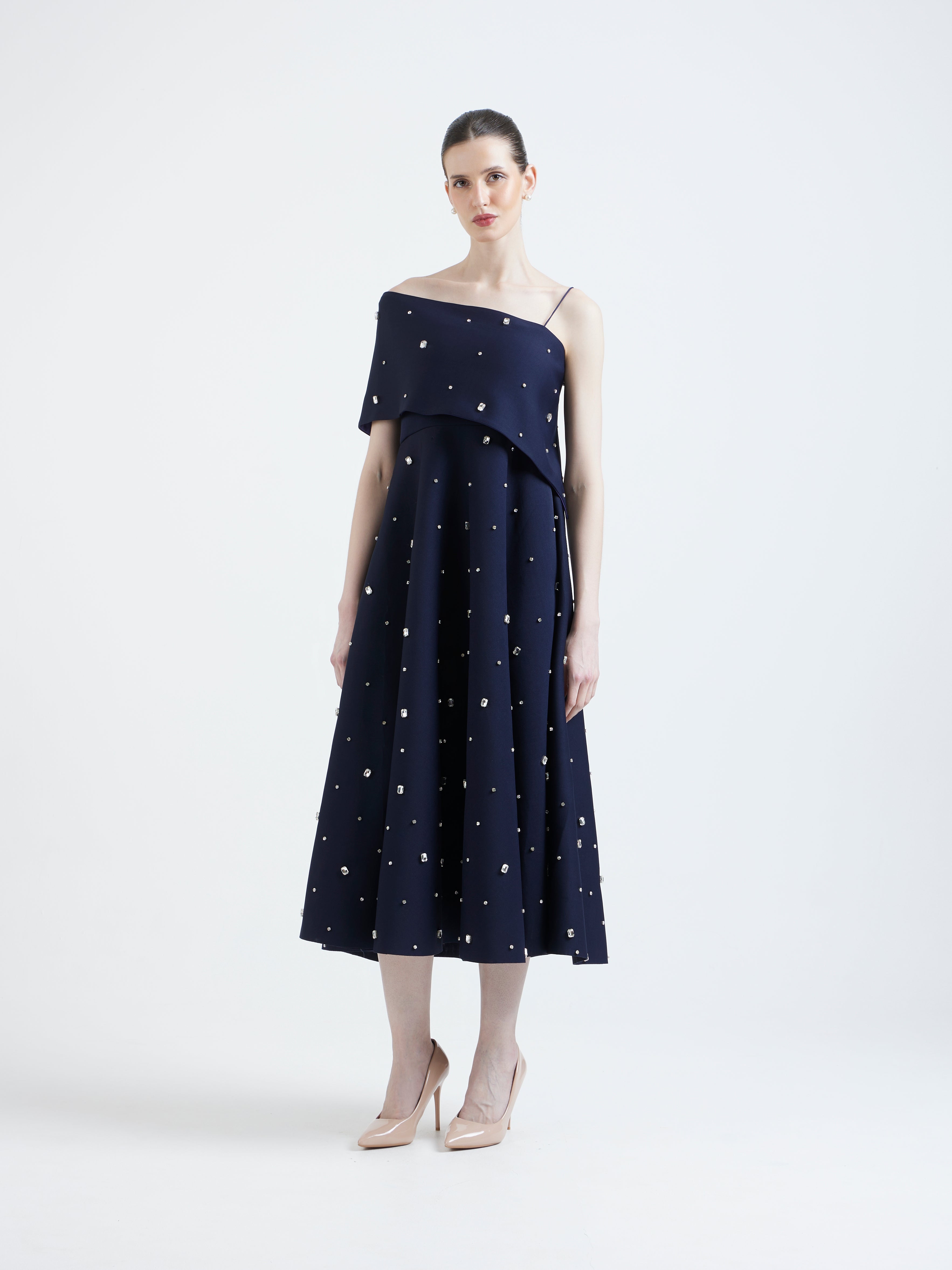 The silhouette falls into a fluid but structured flare, adorned with meticulously placed stones that catch the light in soft, scattered glimmers.