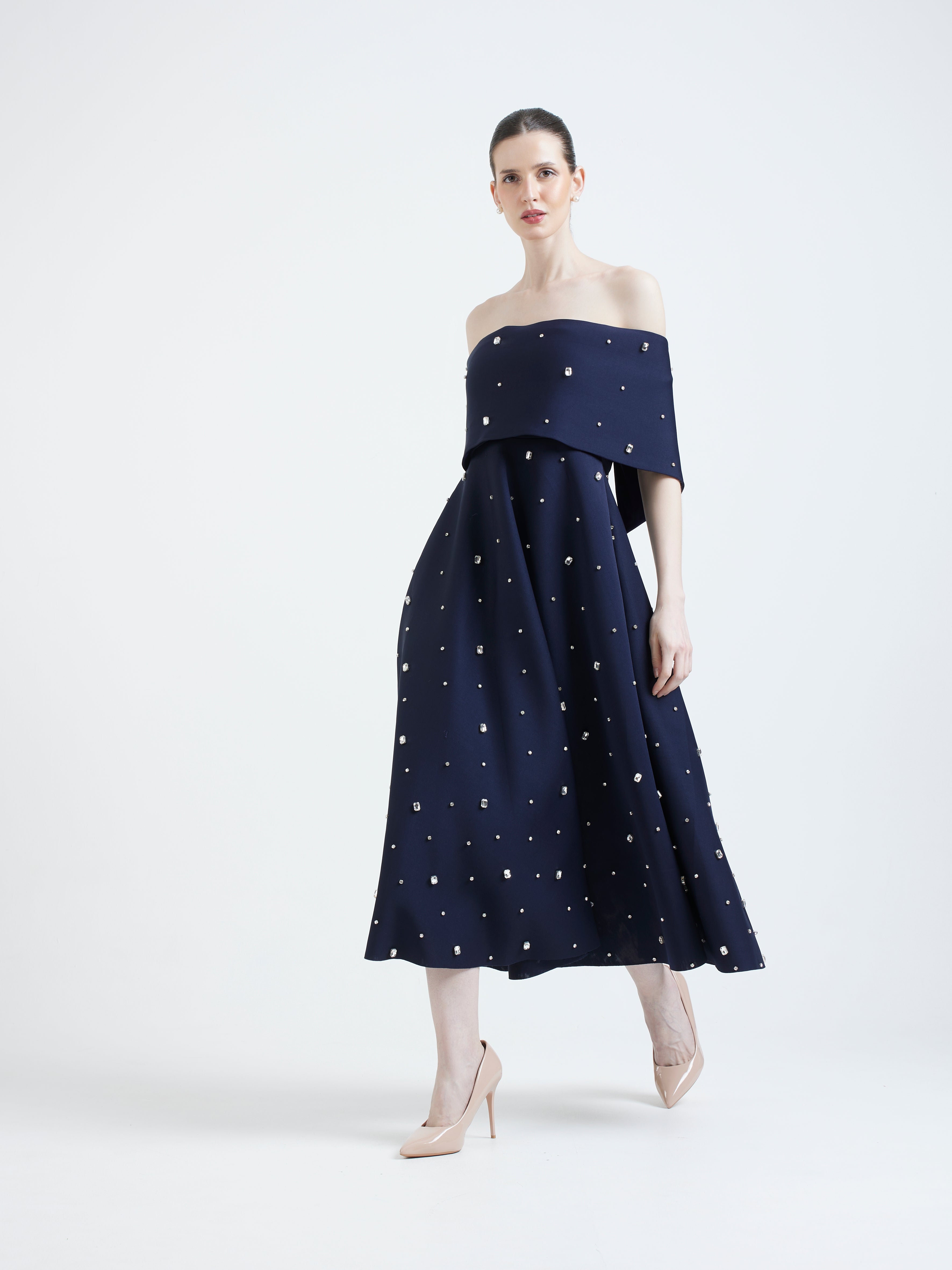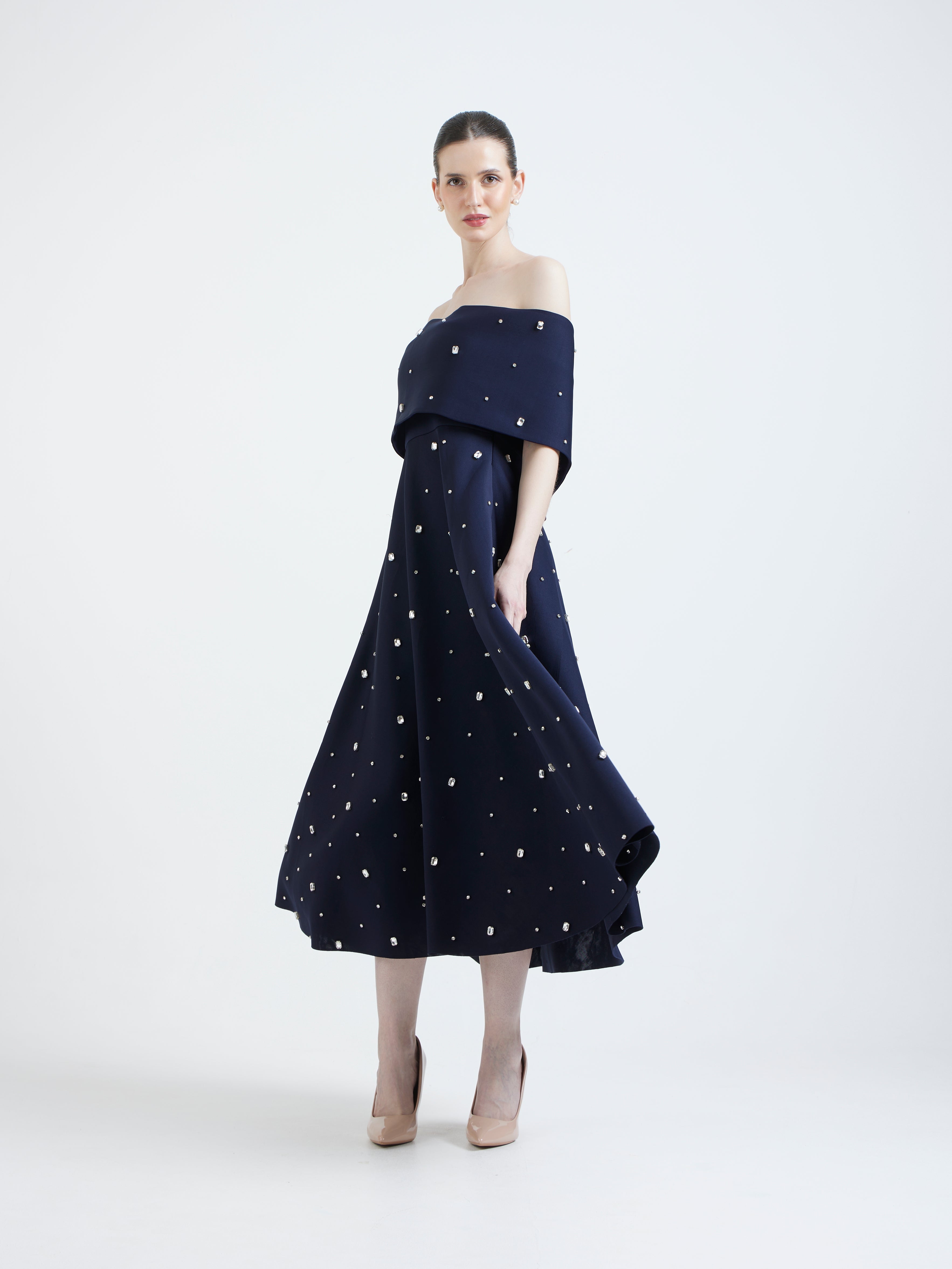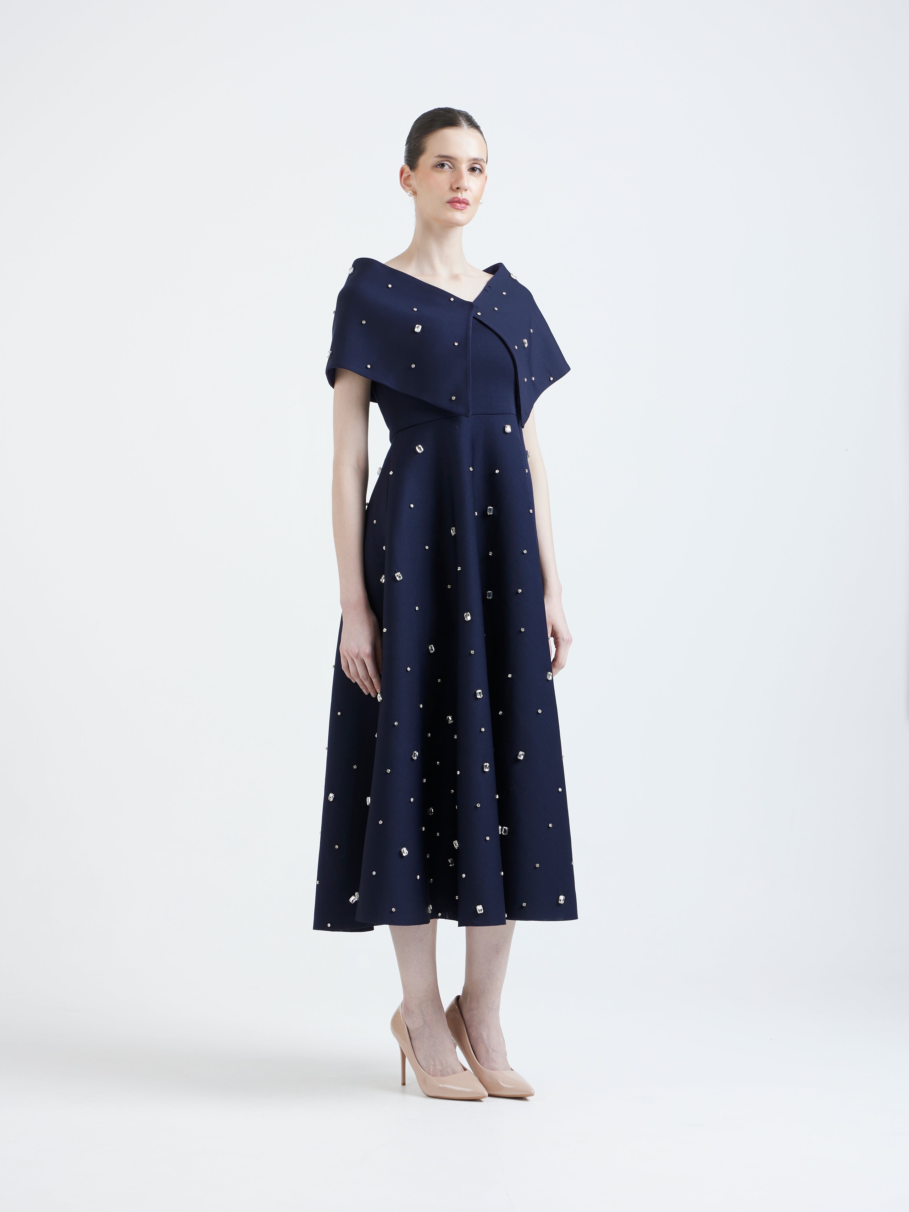 The silhouette falls into a fluid but structured flare, adorned with meticulously placed stones that catch the light in soft, scattered glimmers.