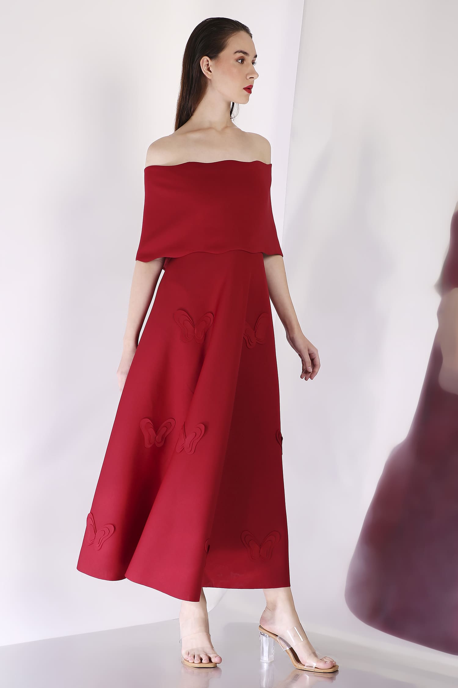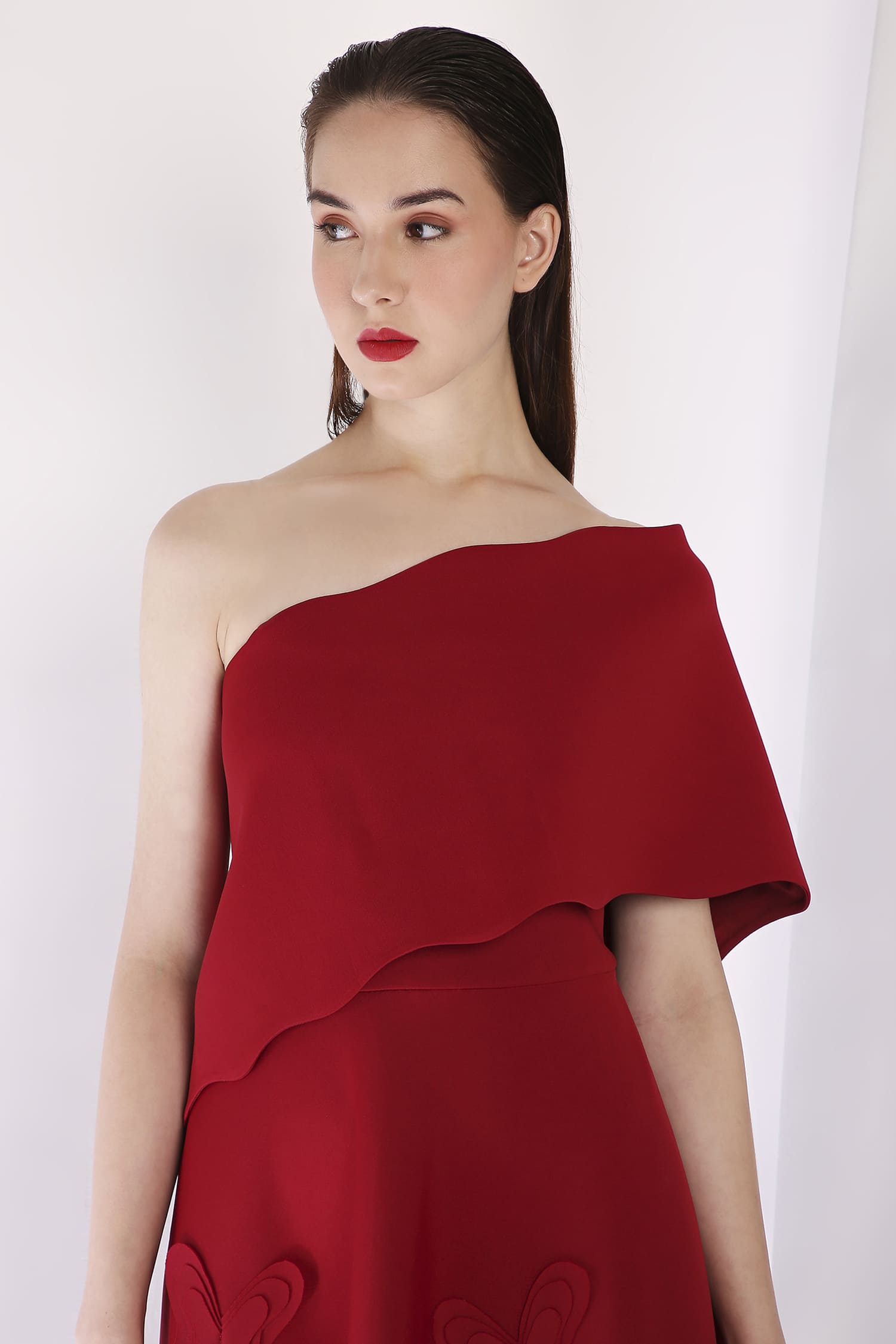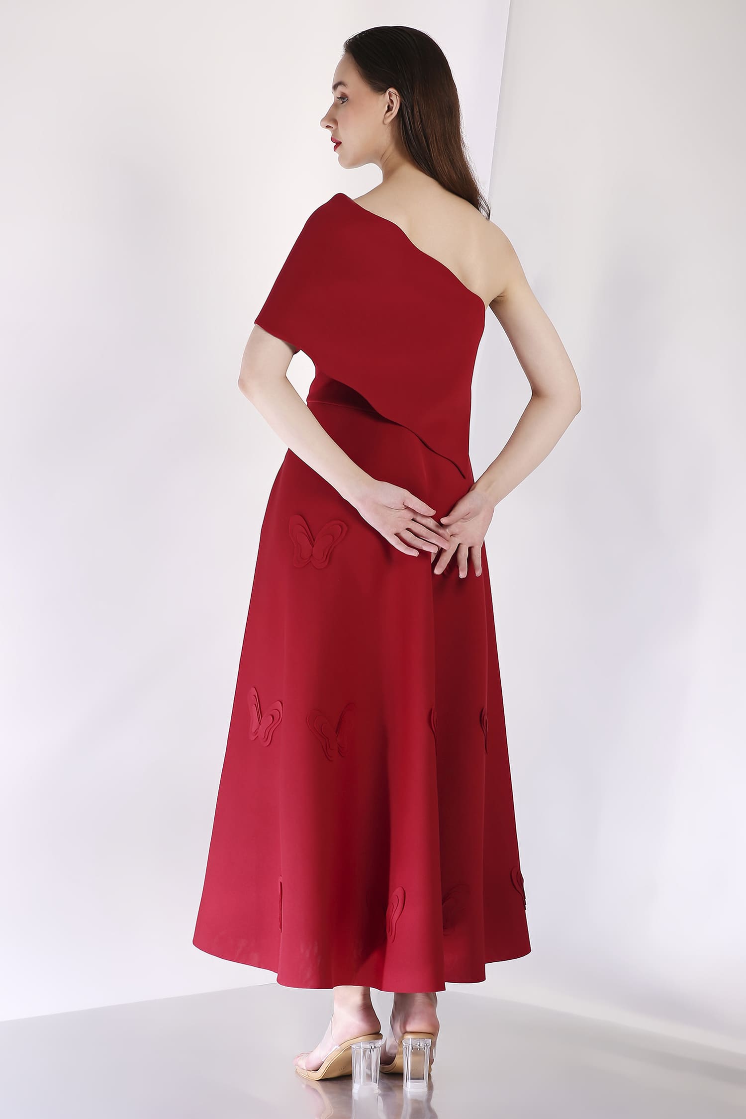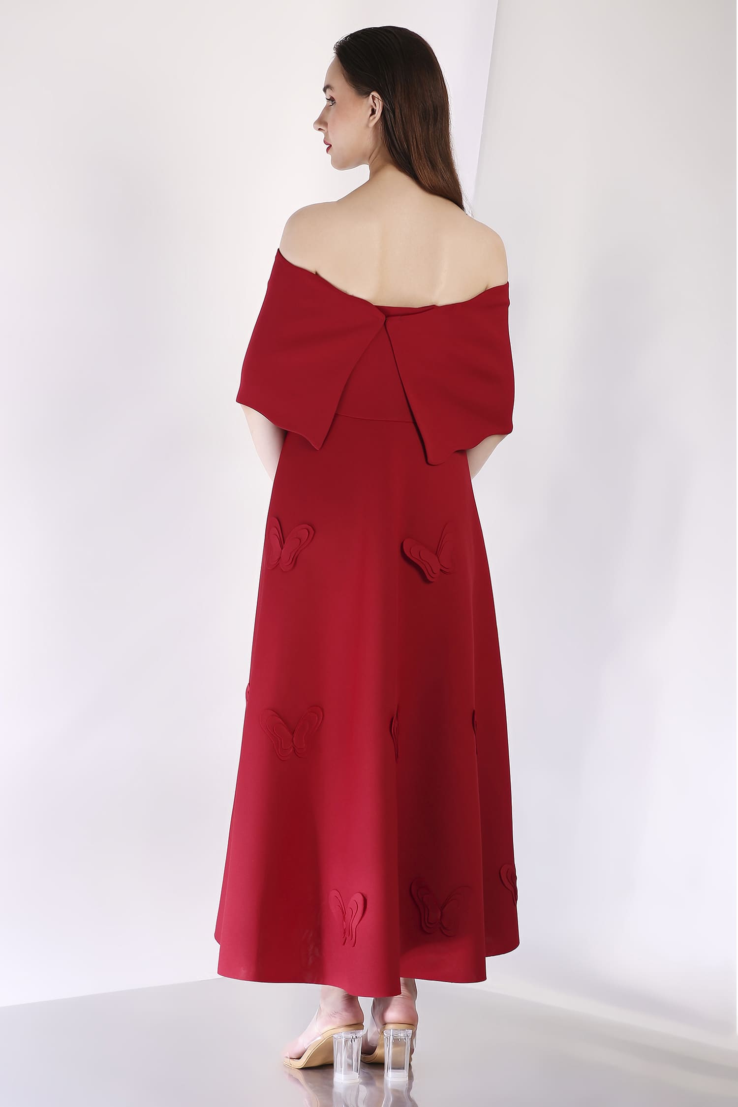 A fit-and-flare mid-calf dress featuring butterfly appliqués for a textured, romantic look, complemented by a wave wrap that can be styled one-shoulder or off-shoulder.