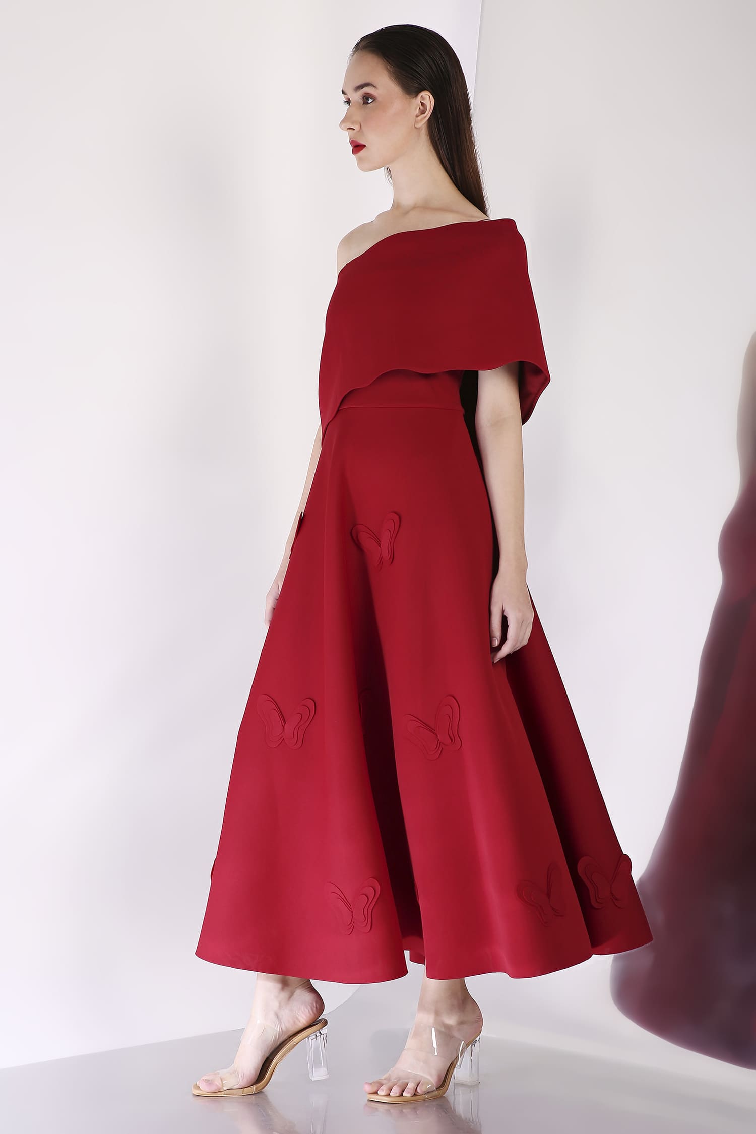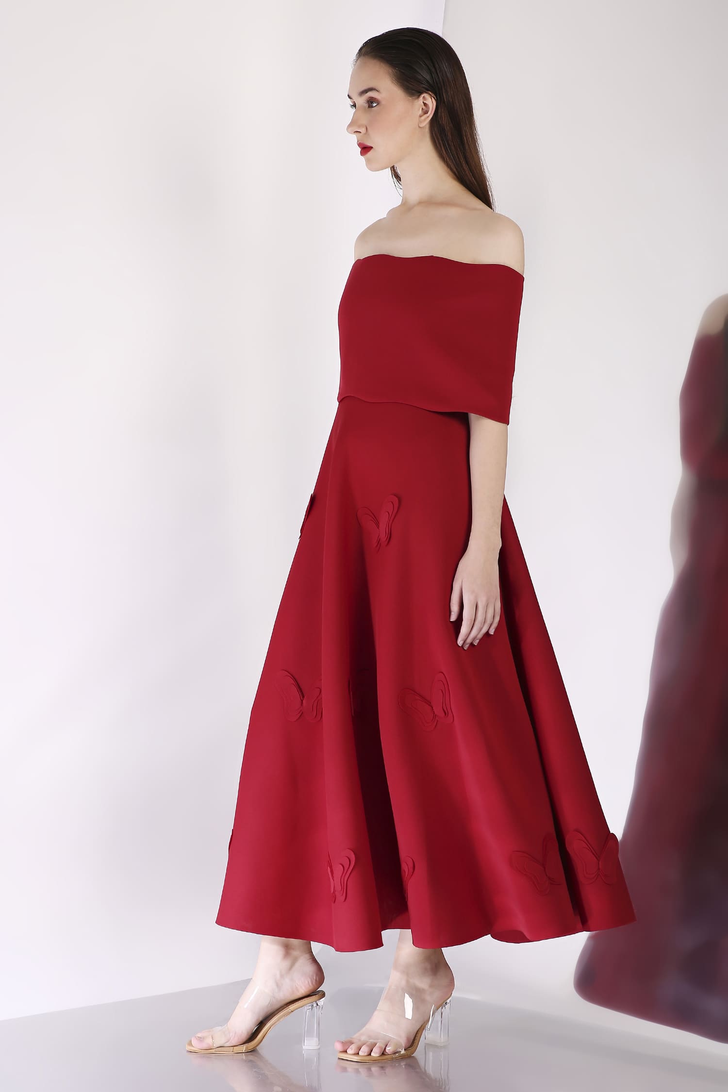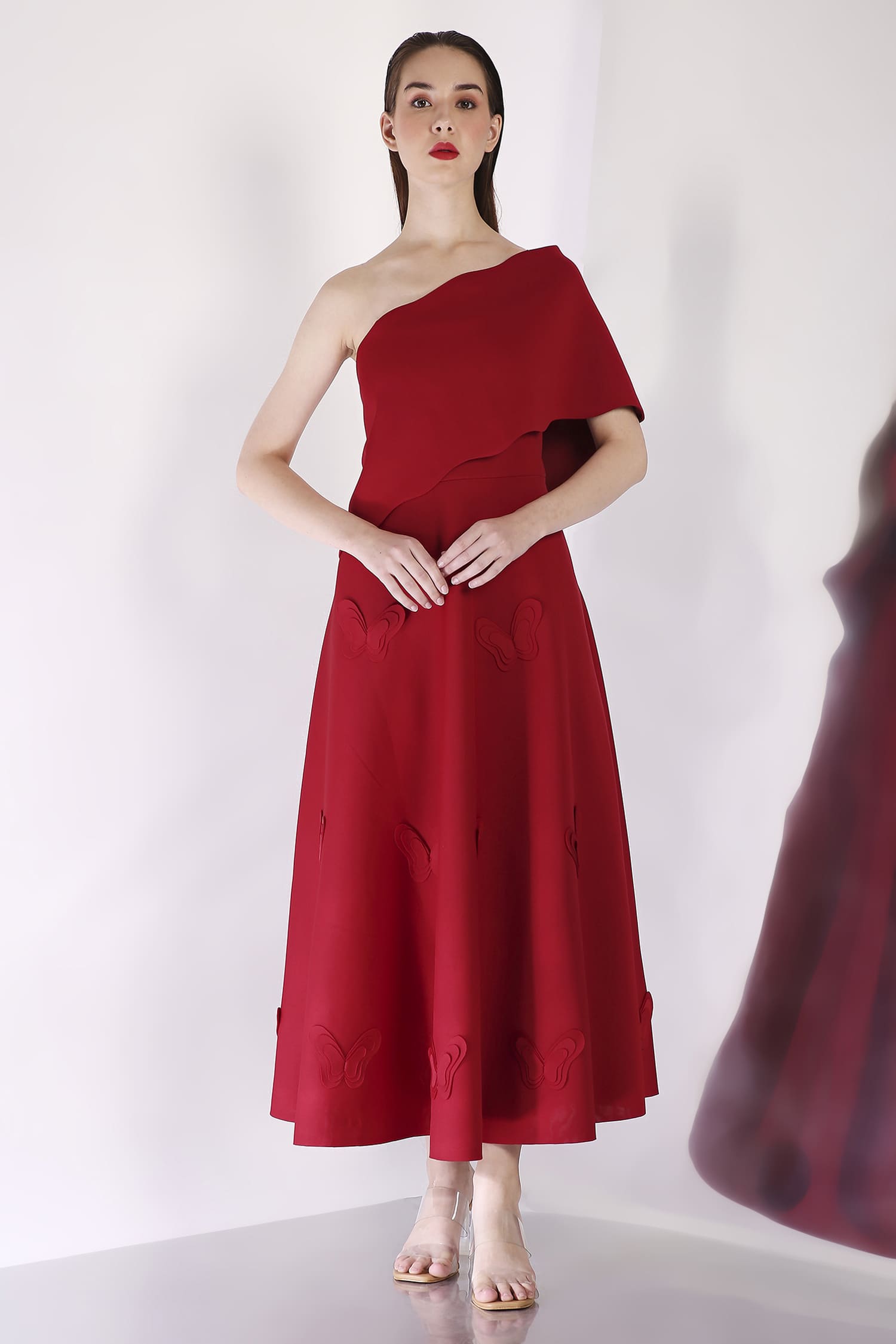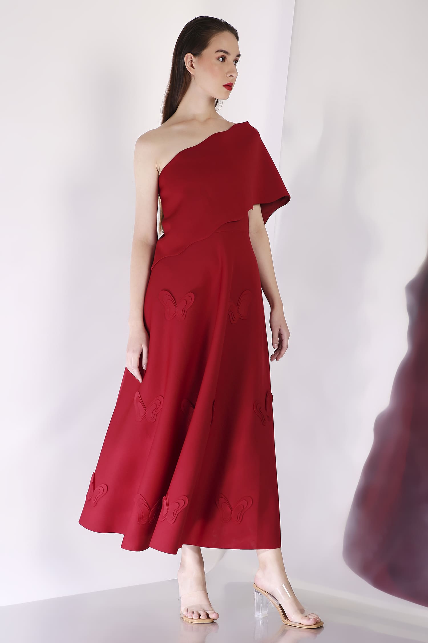 A fit-and-flare mid-calf dress featuring butterfly appliqués for a textured, romantic look, complemented by a wave wrap that can be styled one-shoulder or off-shoulder.