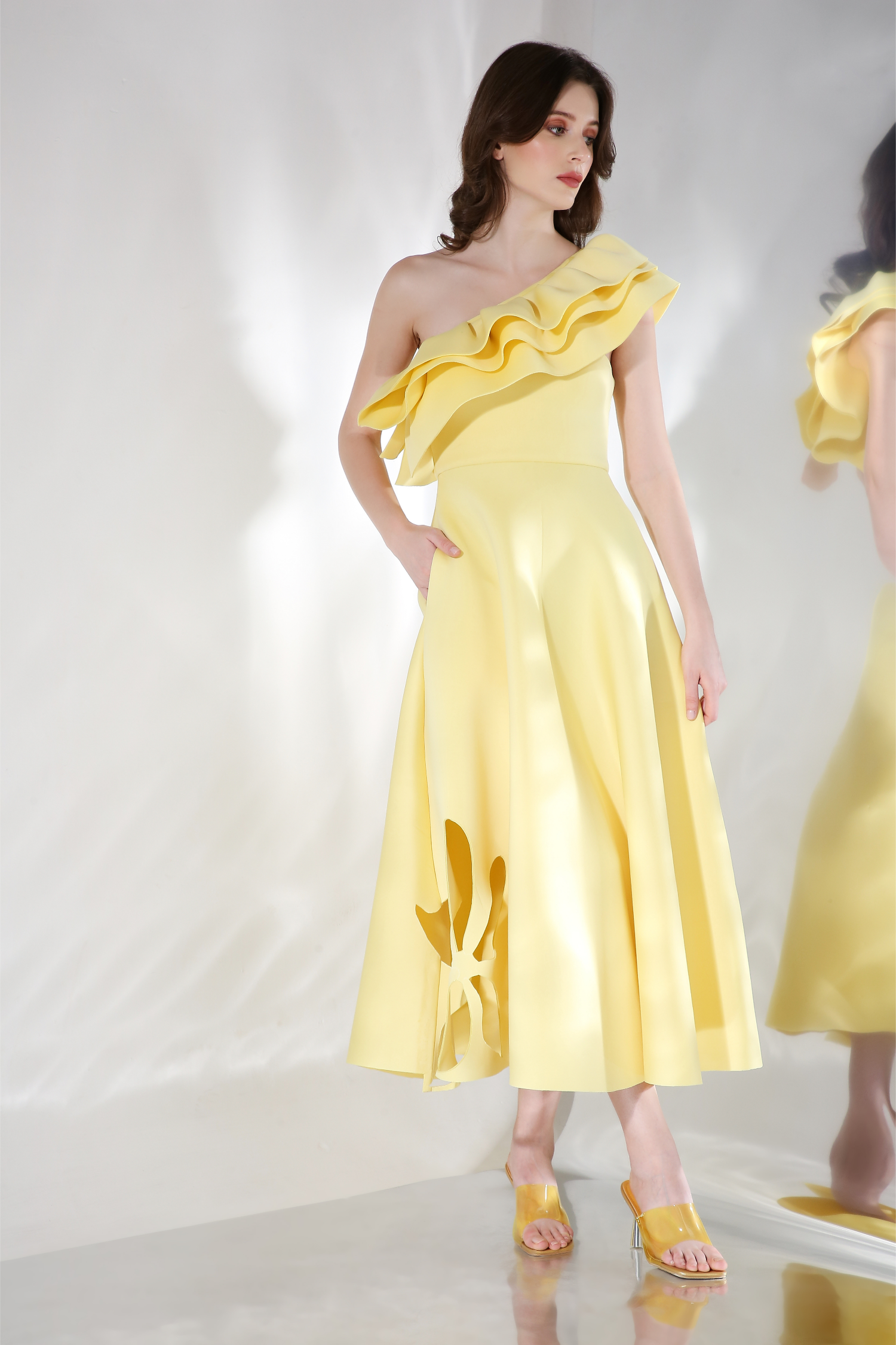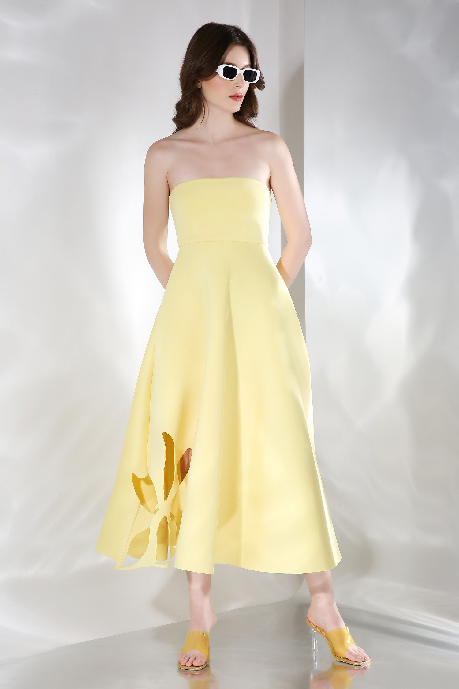 Featuring a fit and flare dress with floral cutouts on the base and detachable. Wear it in three ways,