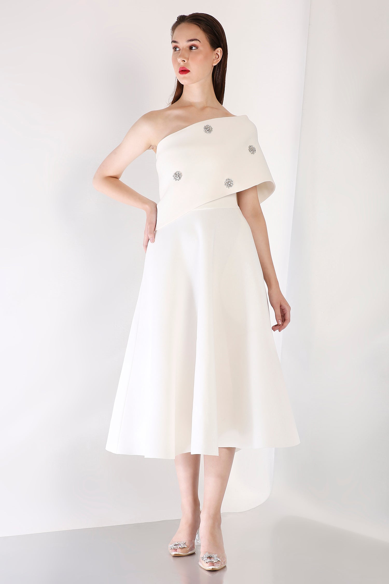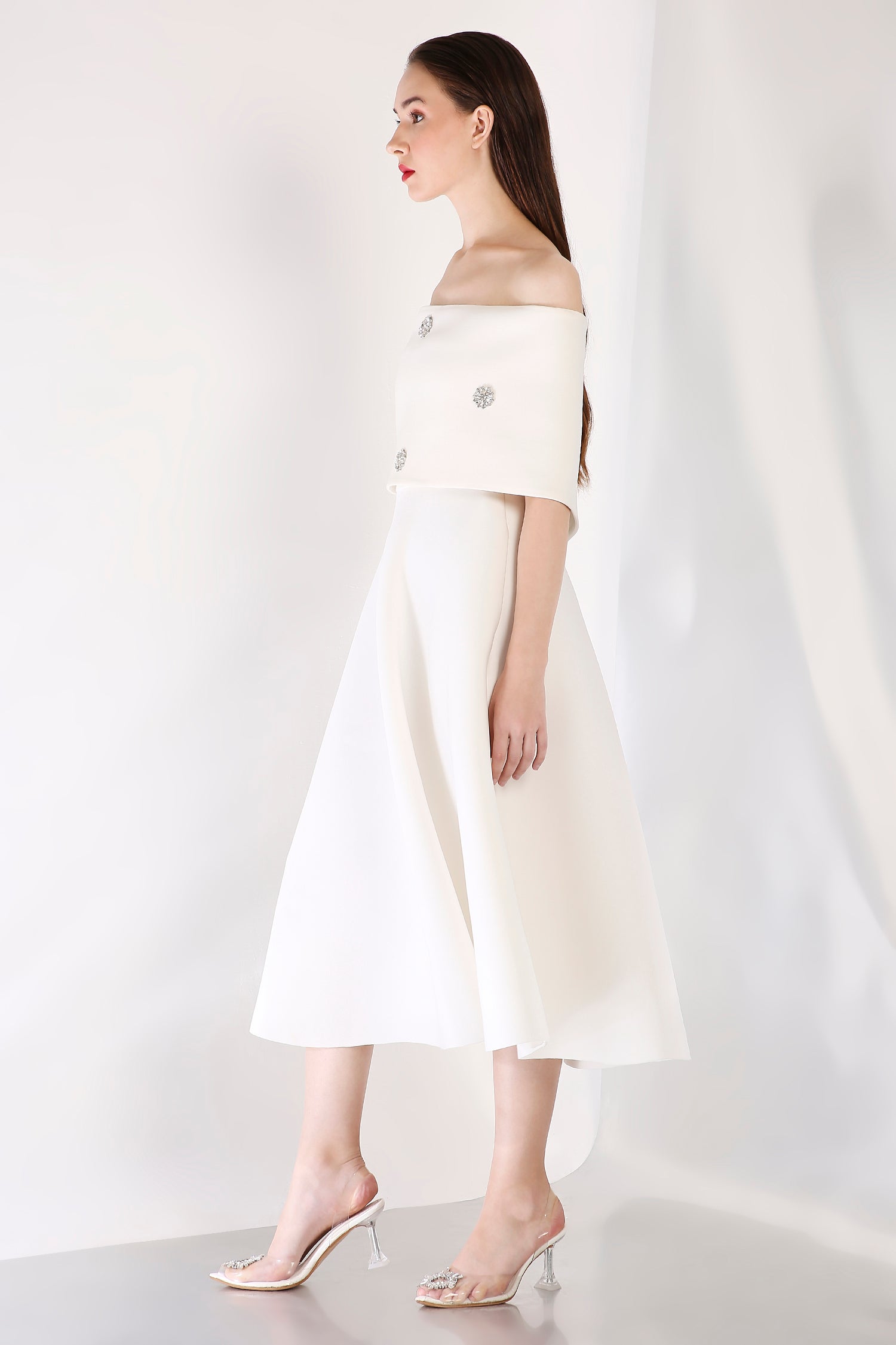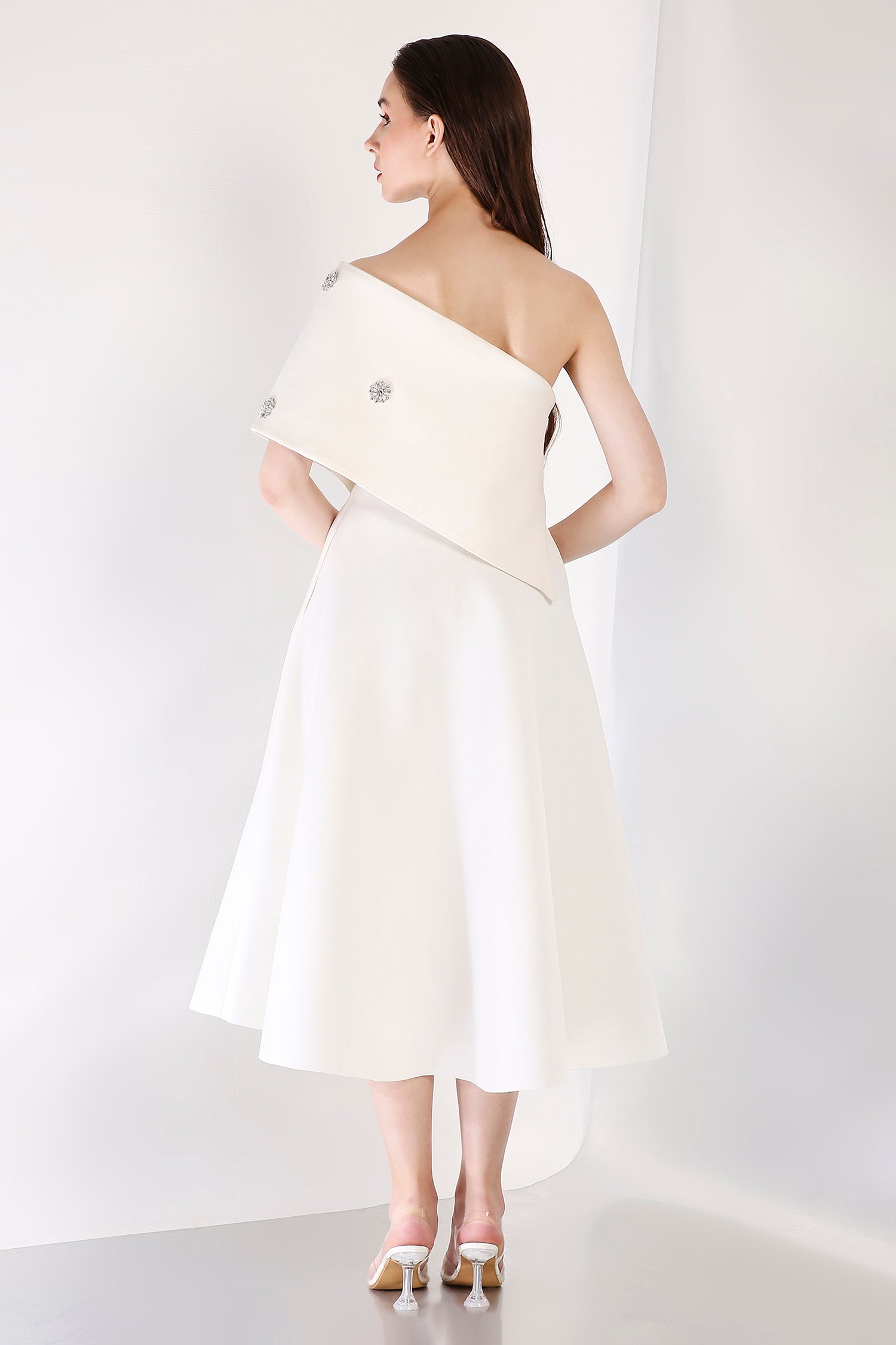 This strapless midi dress exudes timeless elegance with its fit-and-flare design, while the silver studded wrap elevates the ensemble with its exquisite detailing. The wrap is versatile, offering two styling options—one-shoulder or off-shoulder—ideal for a chic and polished appearance at any formal event.