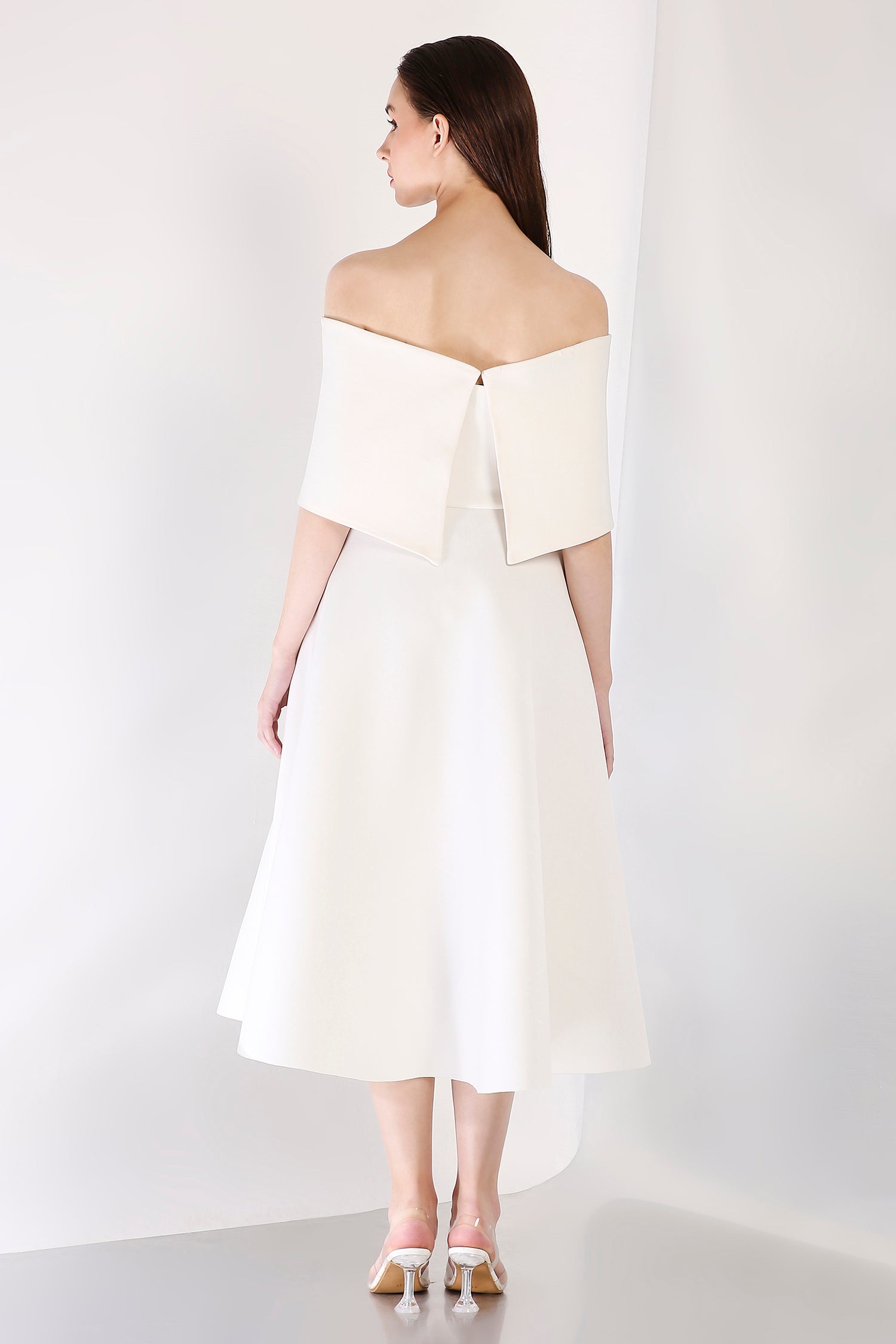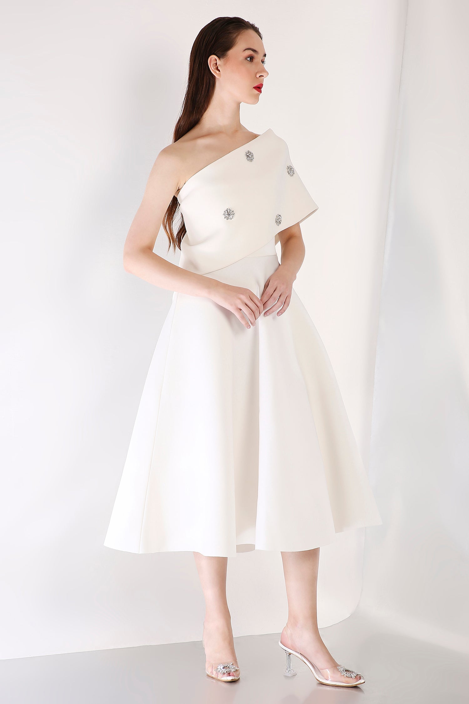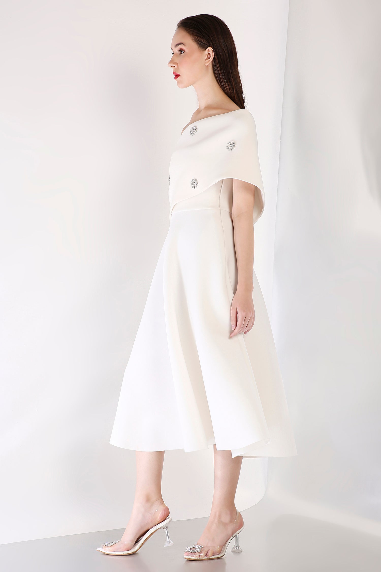 This strapless midi dress exudes timeless elegance with its fit-and-flare design, while the silver studded wrap elevates the ensemble with its exquisite detailing. The wrap is versatile, offering two styling options—one-shoulder or off-shoulder—ideal for a chic and polished appearance at any formal event.