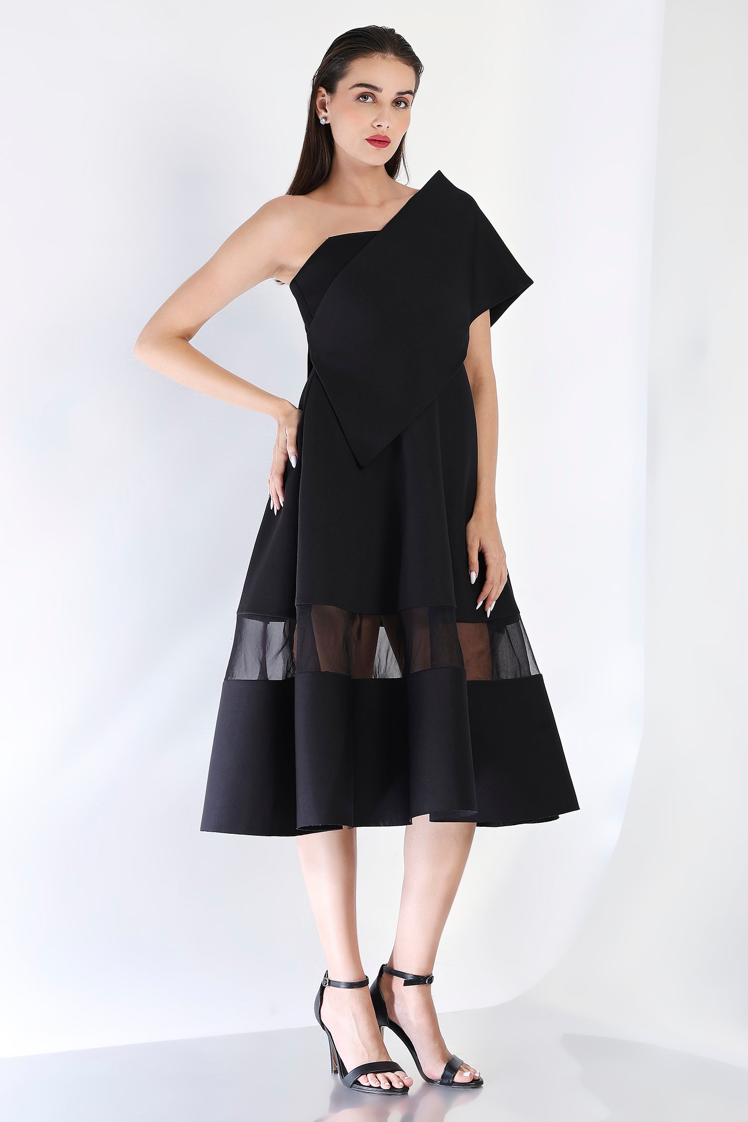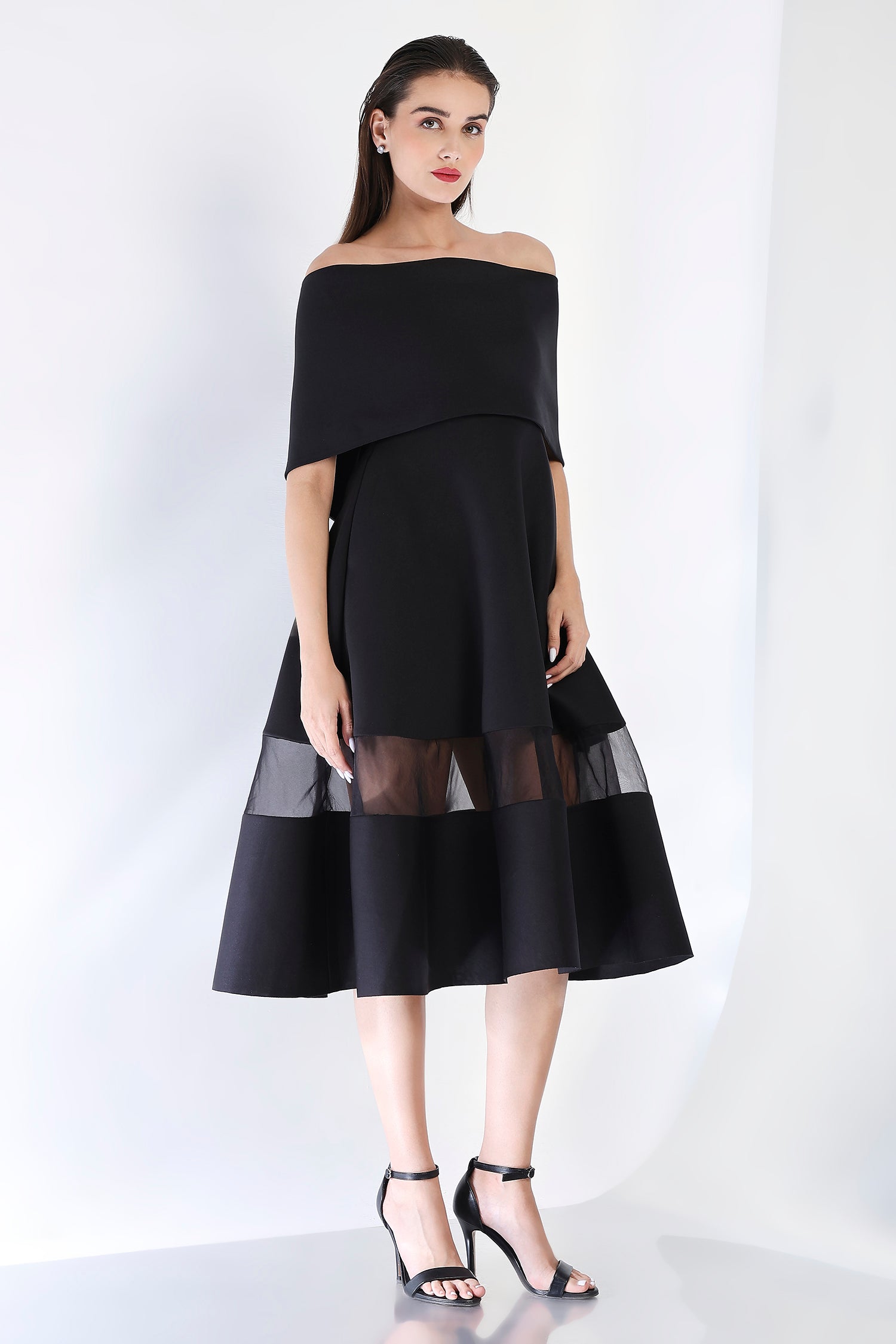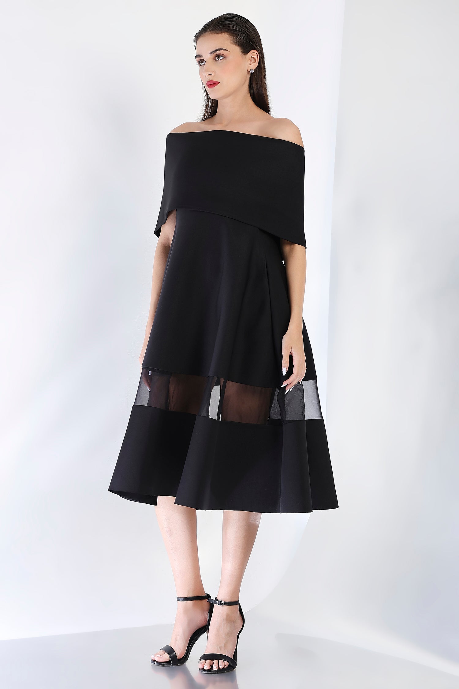As seen on Hanna Khan, featuring a strapless dress with a sheer and opaque hem, pockets and a structured flare.
