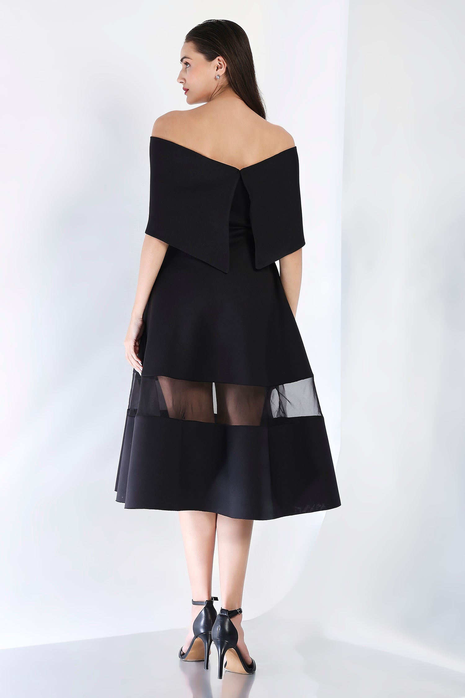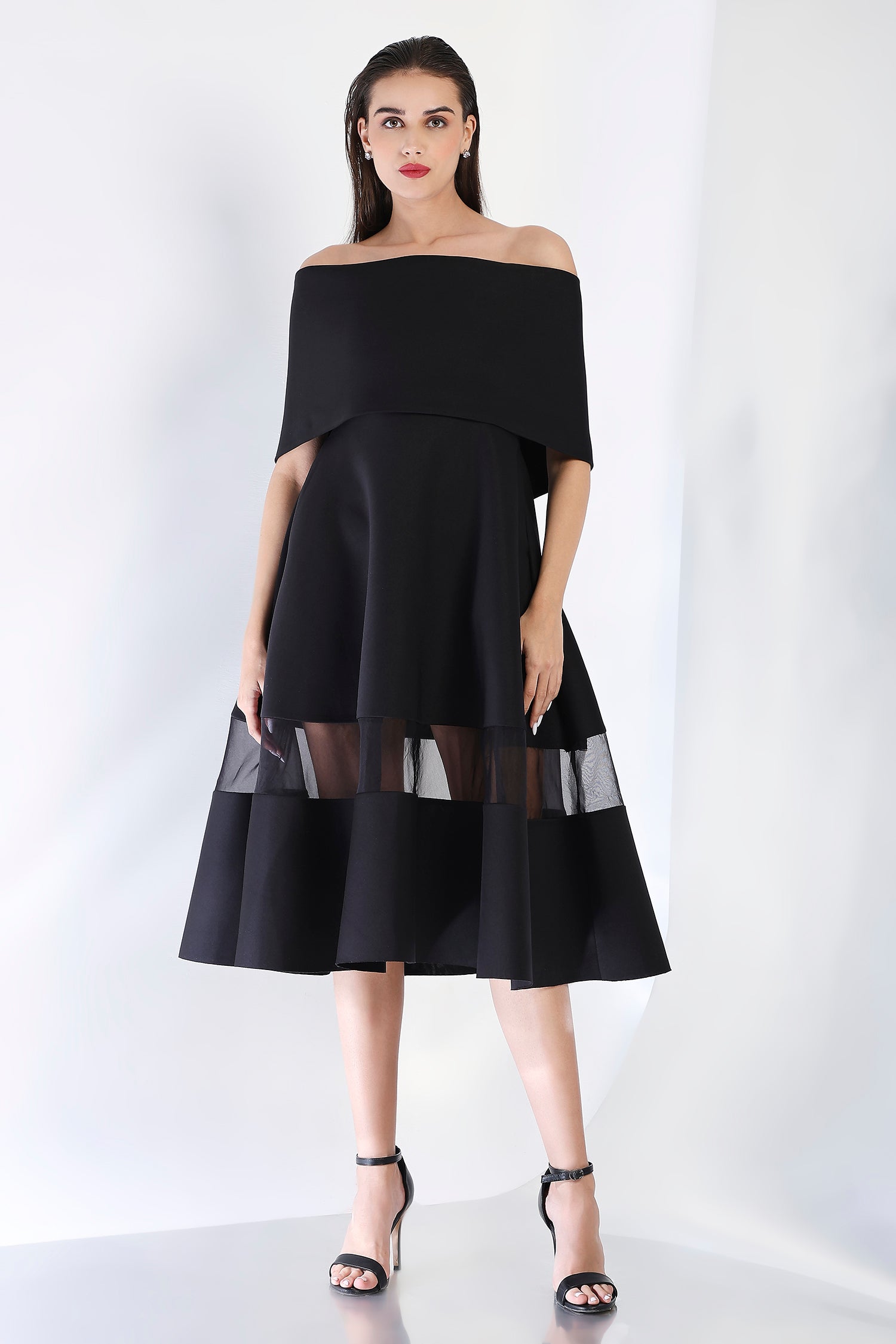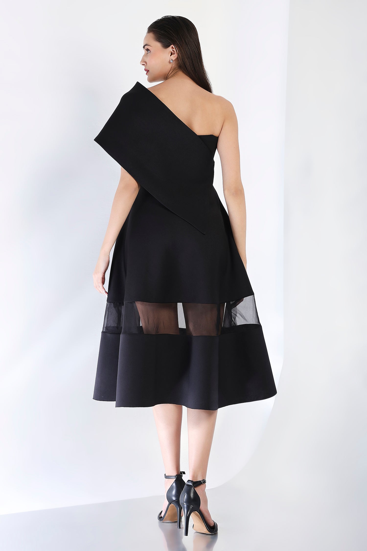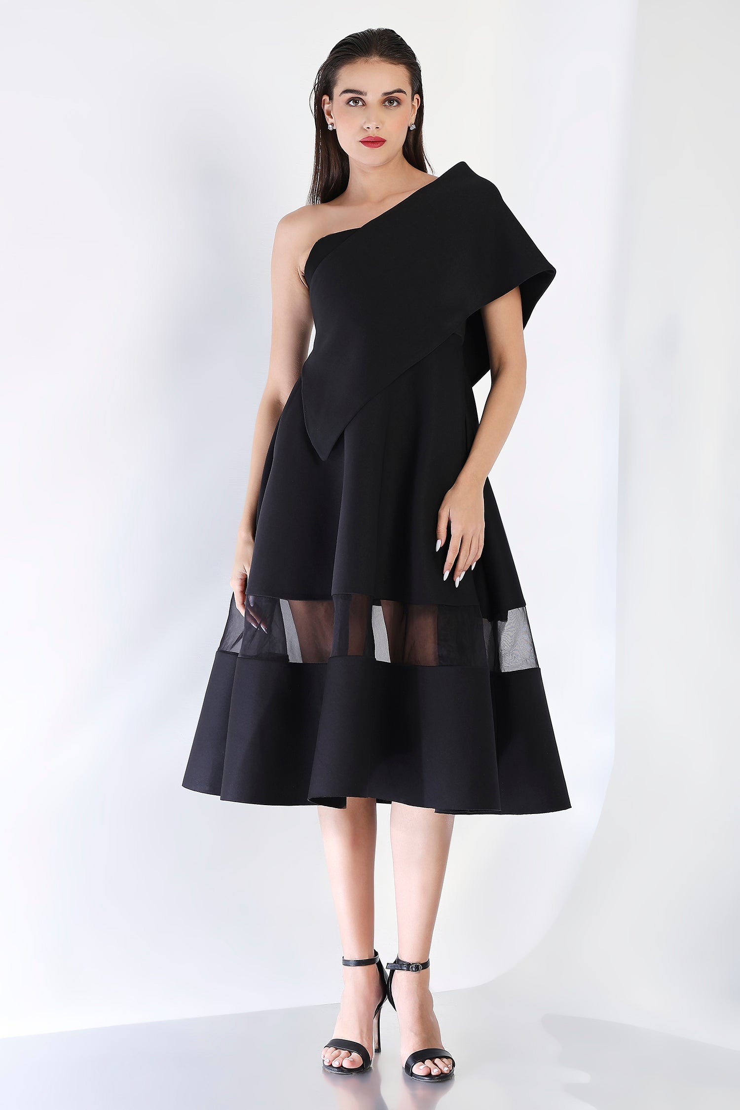 As seen on Hanna Khan, featuring a strapless dress with a sheer and opaque hem, pockets and a structured flare.