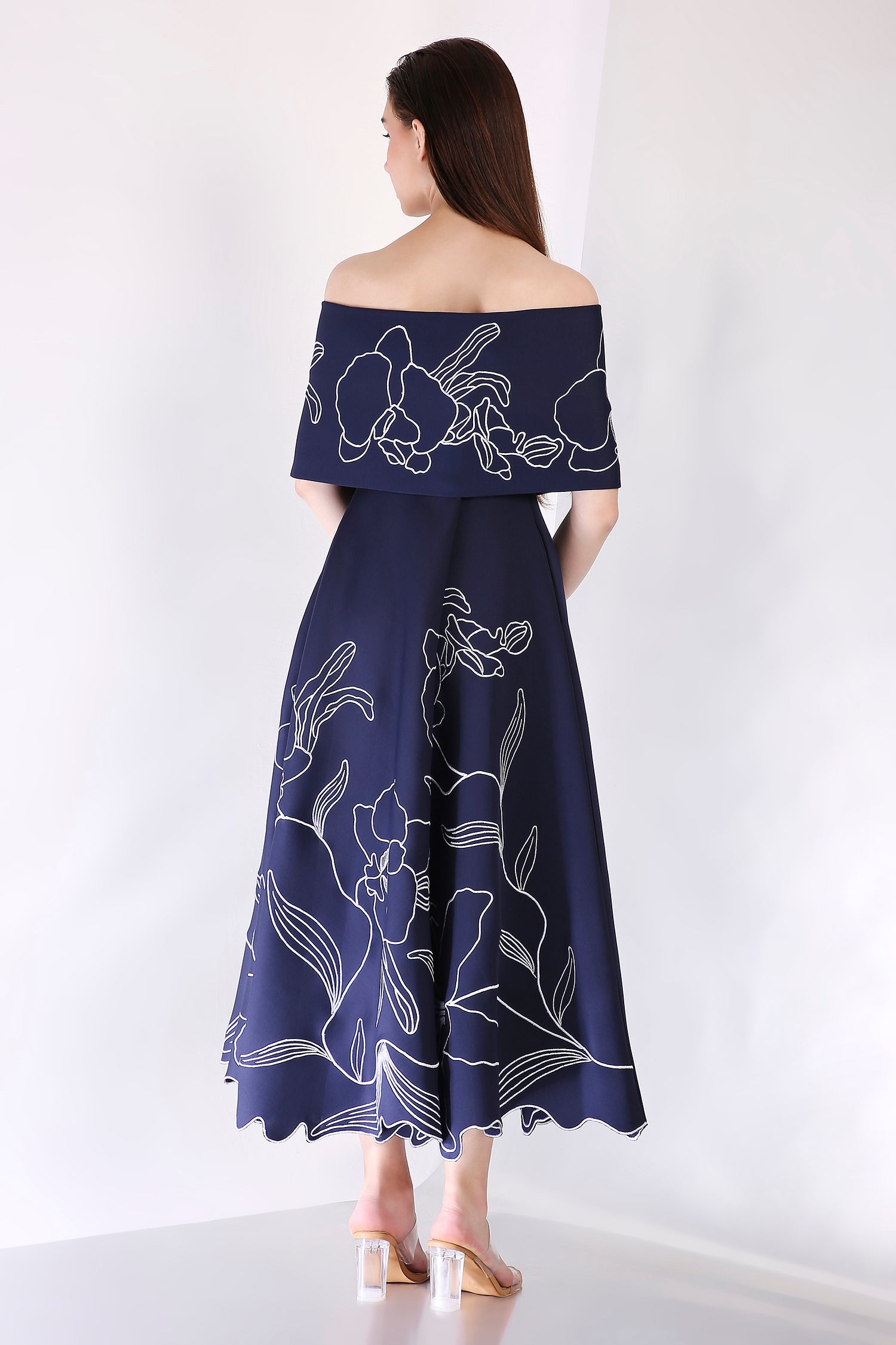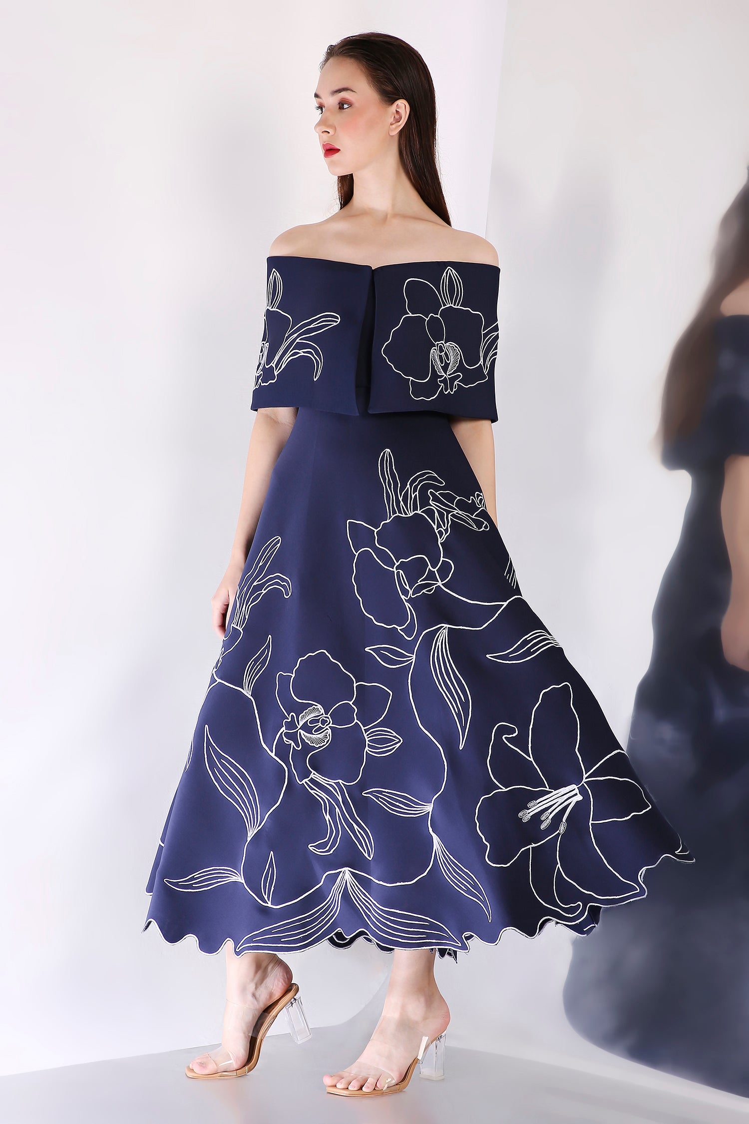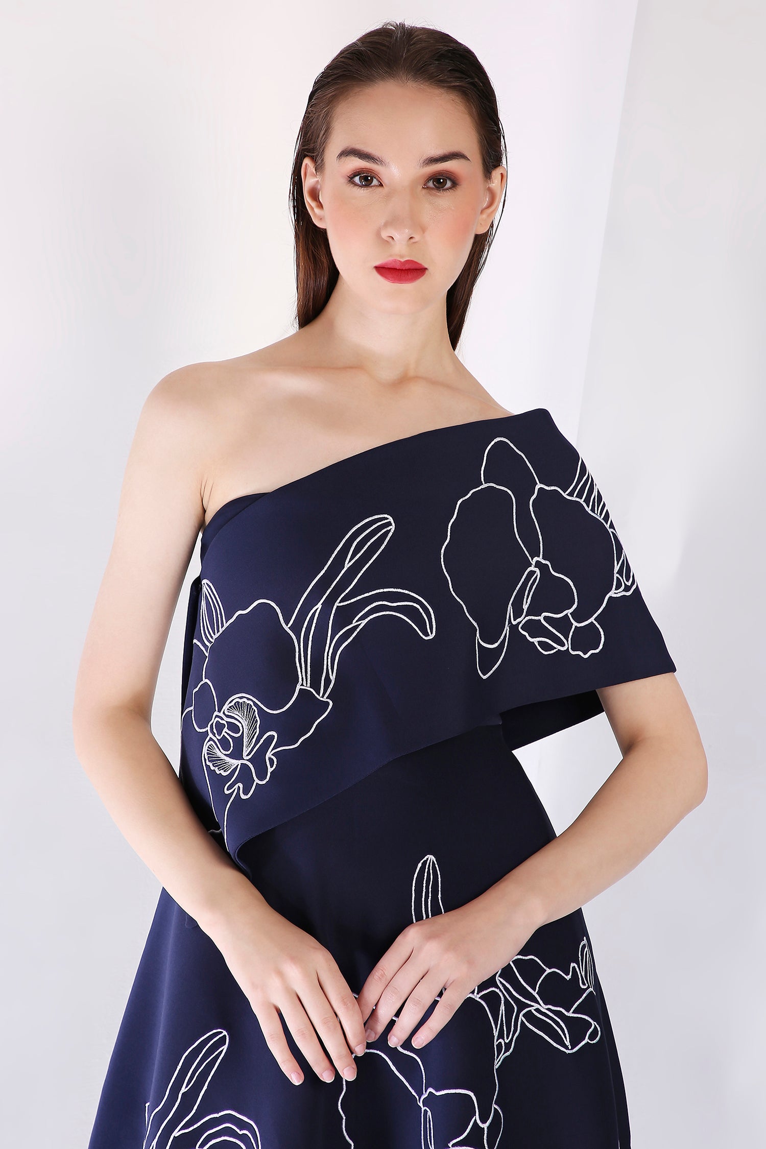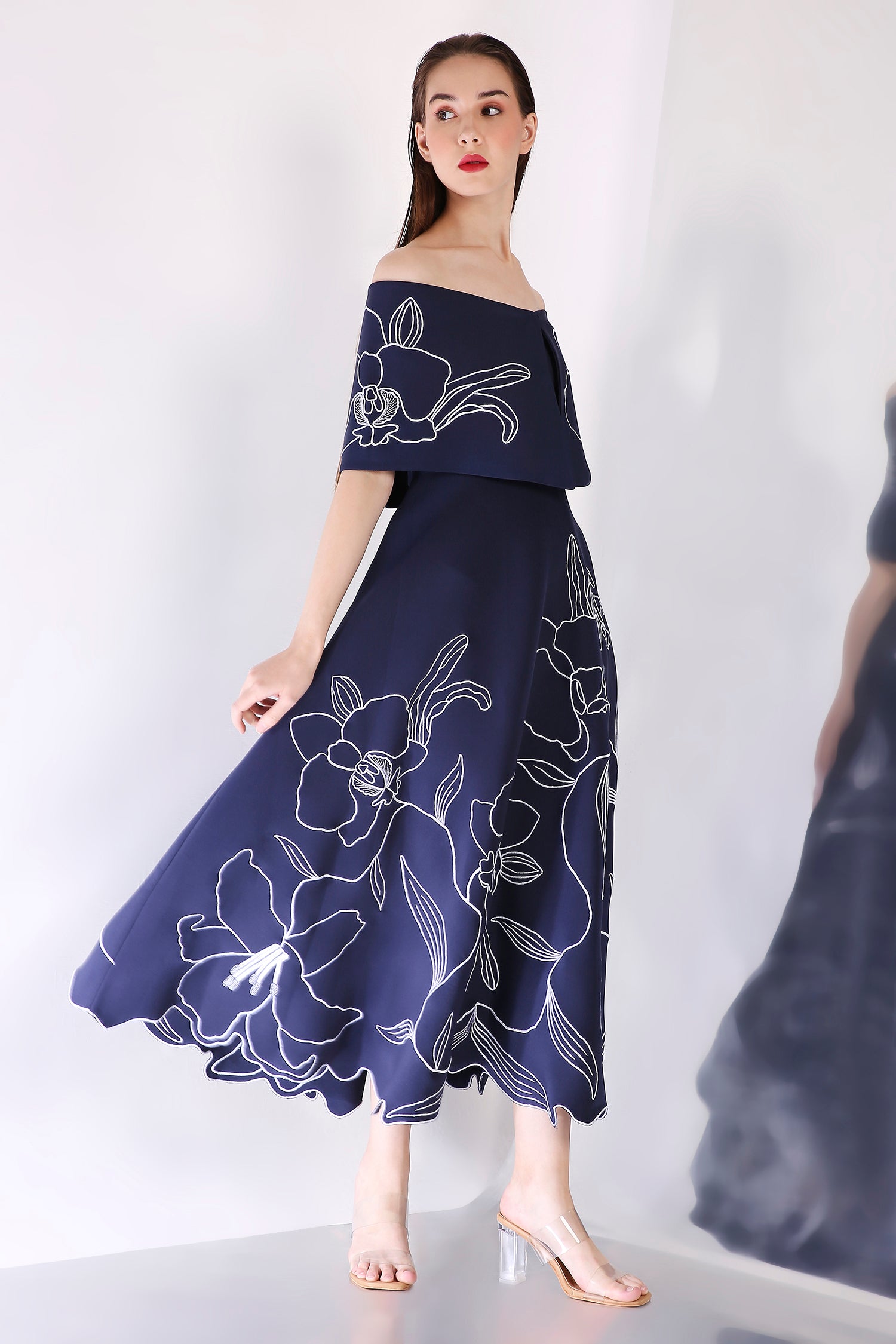 This strapless fit-and-flare mid-calf length dress, crafted from premium neoprene fabric, features intricate floral embroidery motifs that elegantly adorn the entire silhouette. Paired with a versatile embroidered wrap, which can be styled both one-shoulder or off-shoulder, this ensemble offers a perfect balance of modern sophistication and timeless charm—ideal for any formal occasion.