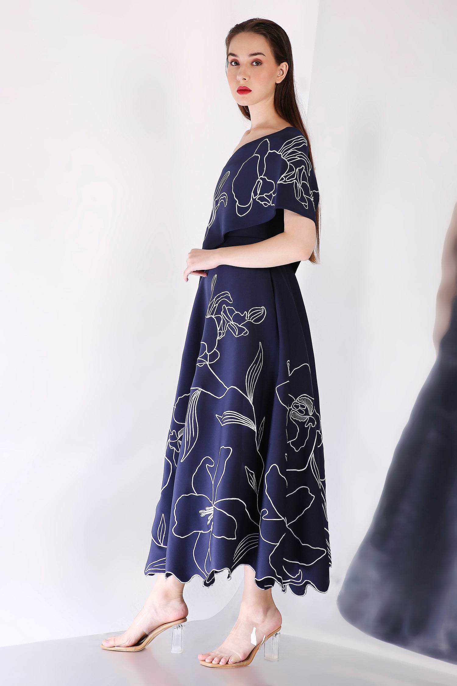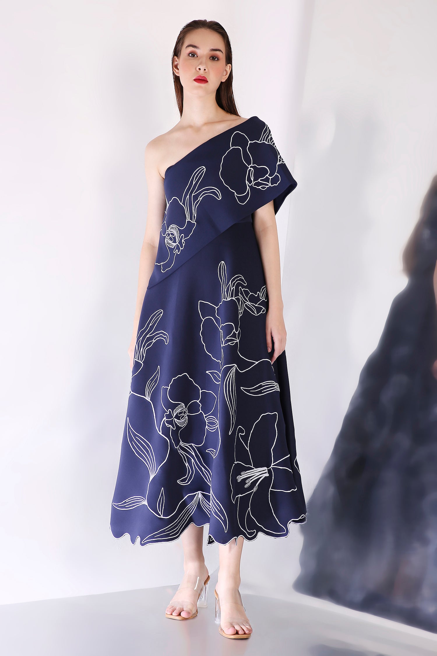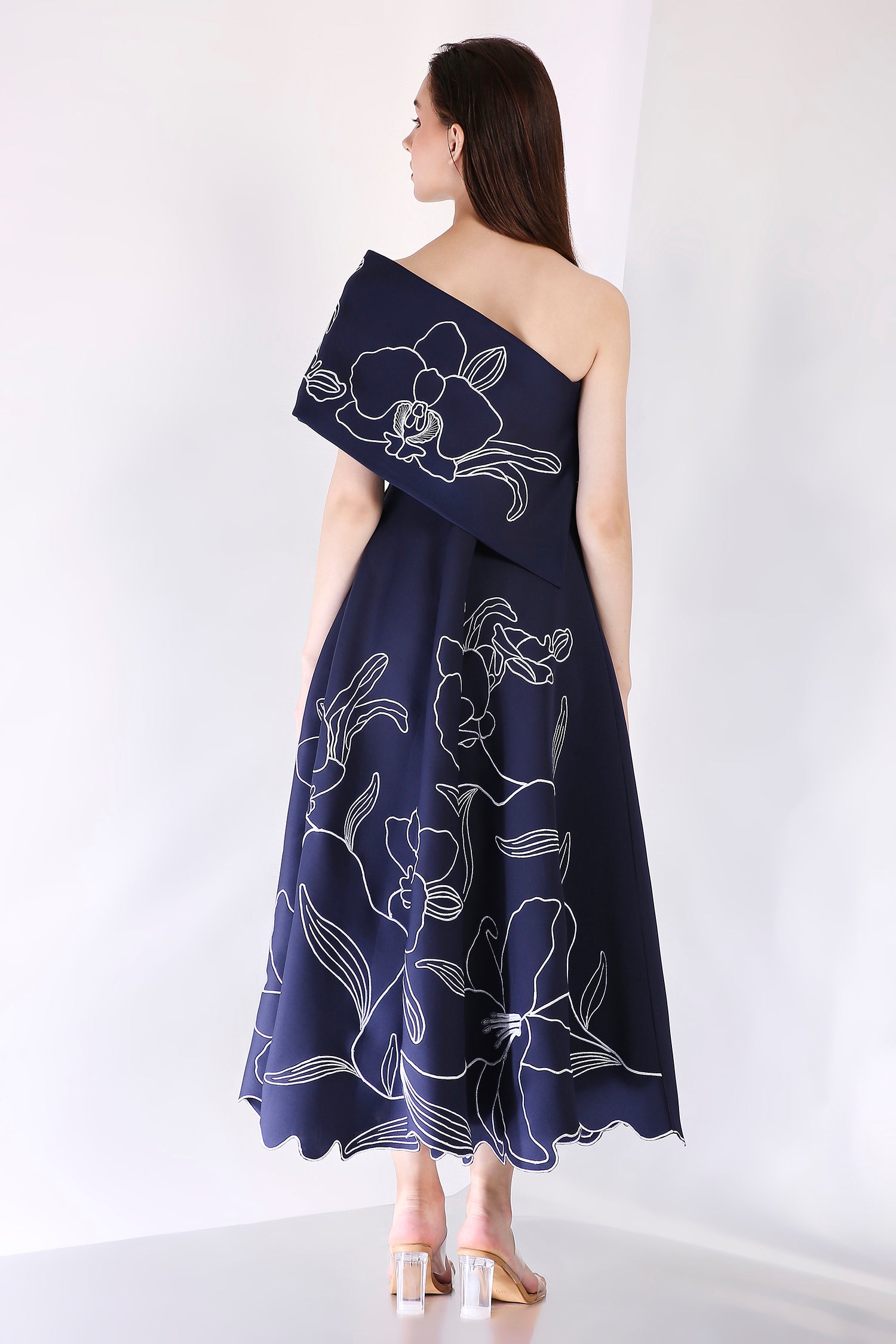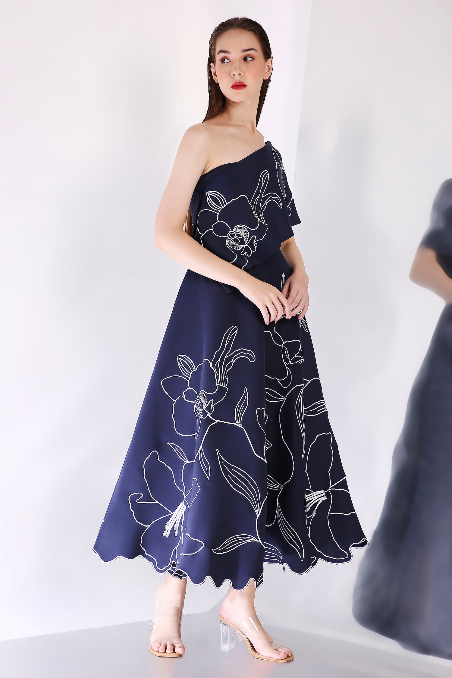 This strapless fit-and-flare mid-calf length dress, crafted from premium neoprene fabric, features intricate floral embroidery motifs that elegantly adorn the entire silhouette. Paired with a versatile embroidered wrap, which can be styled both one-shoulder or off-shoulder, this ensemble offers a perfect balance of modern sophistication and timeless charm—ideal for any formal occasion.