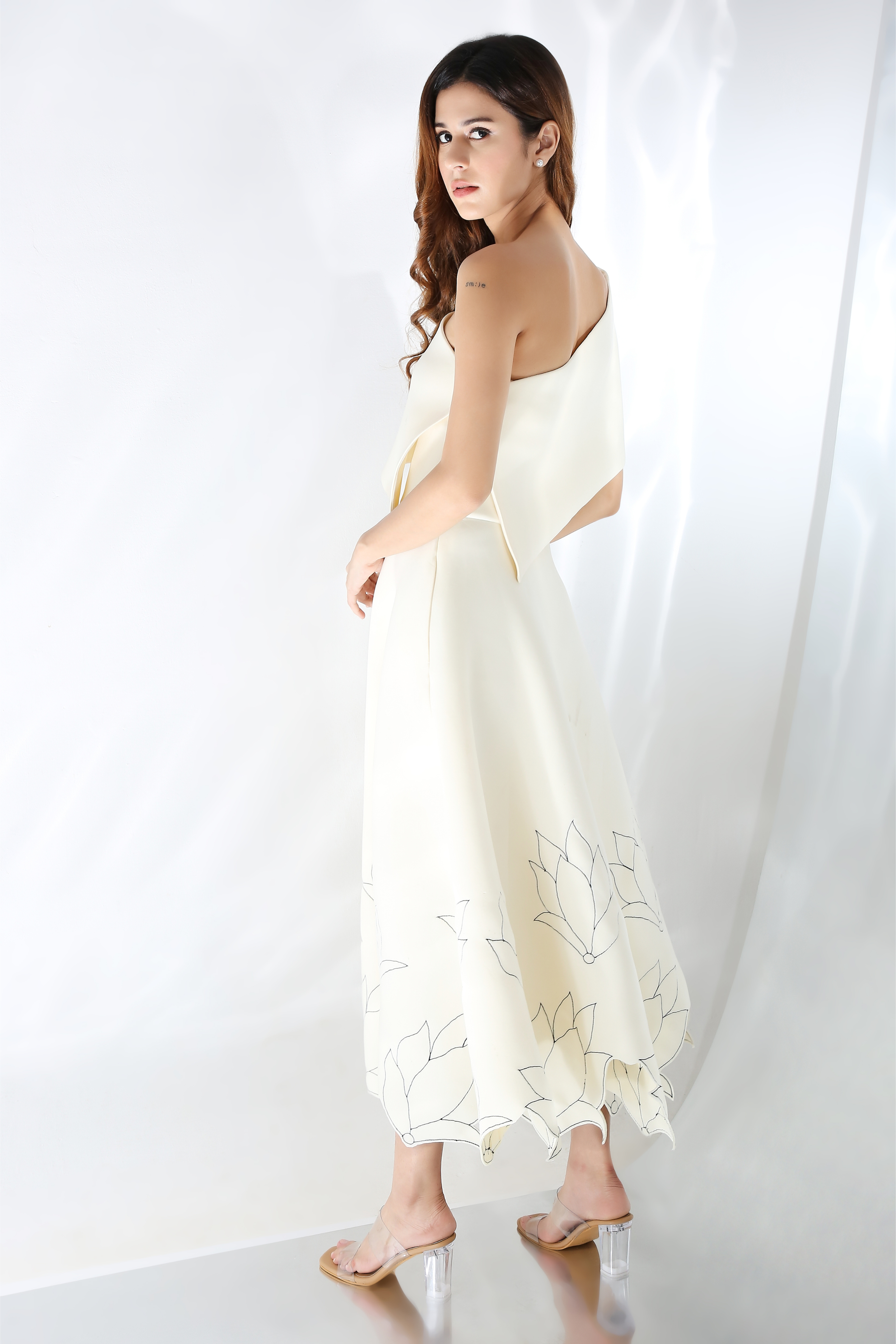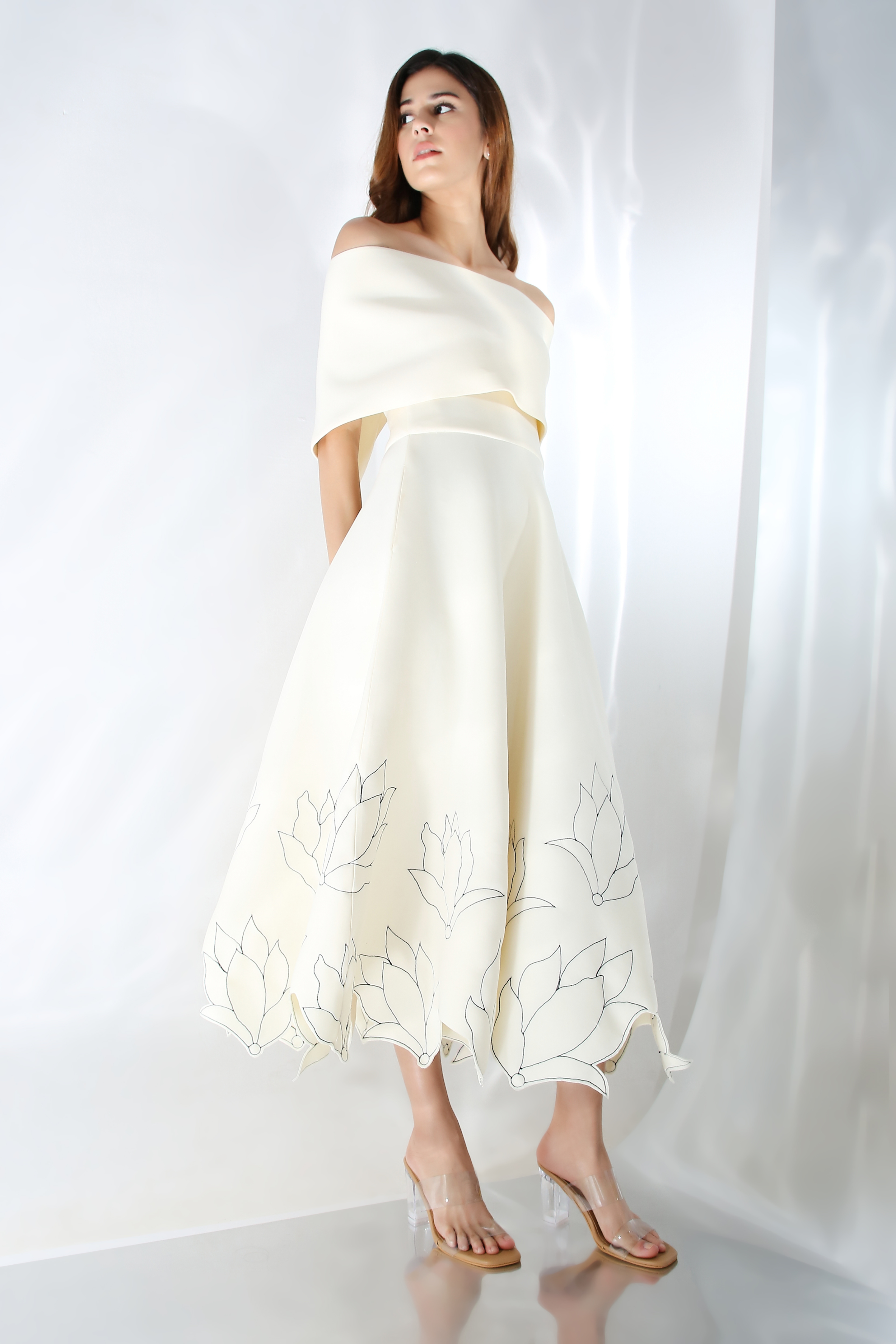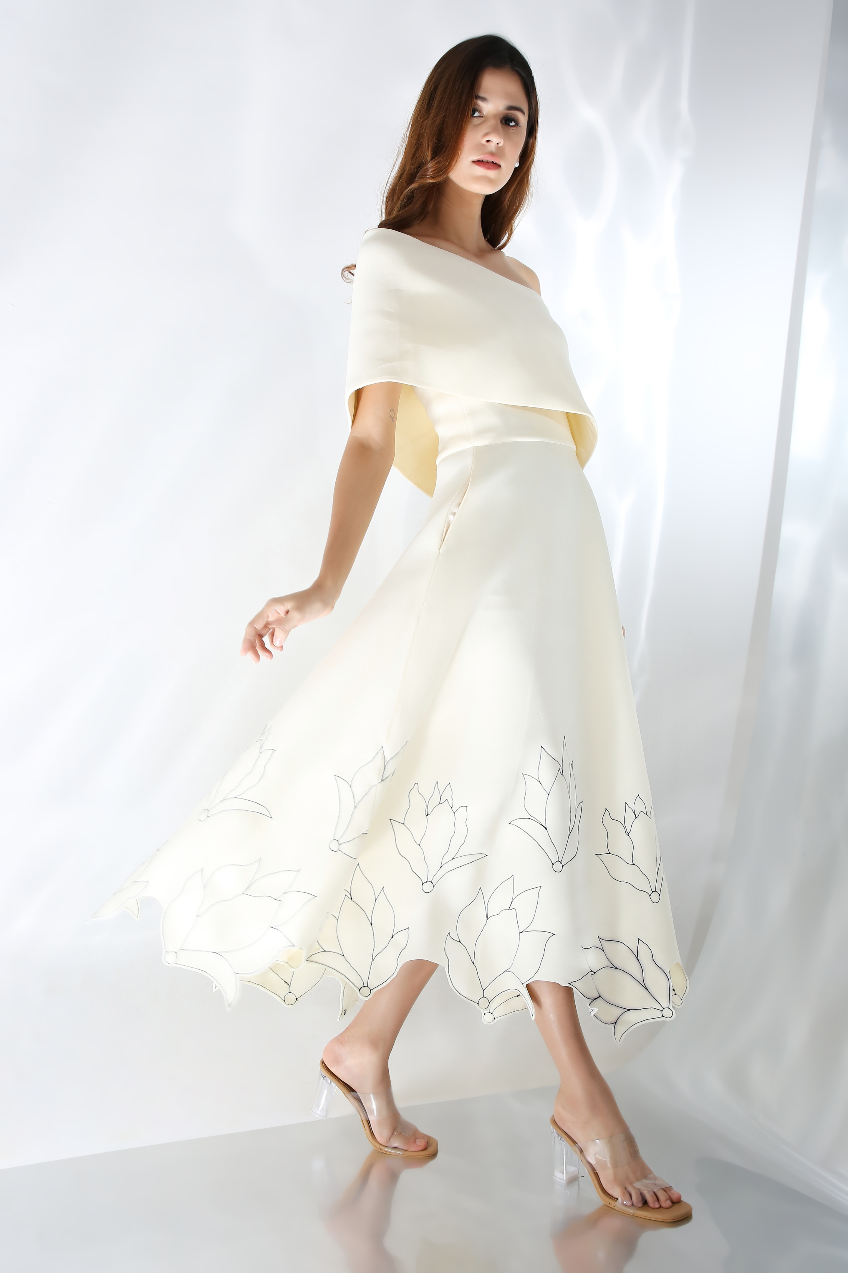 Featuring a fit and flare dress with floral hand embroidery and cutouts on the base  dress. Wear it in two ways,