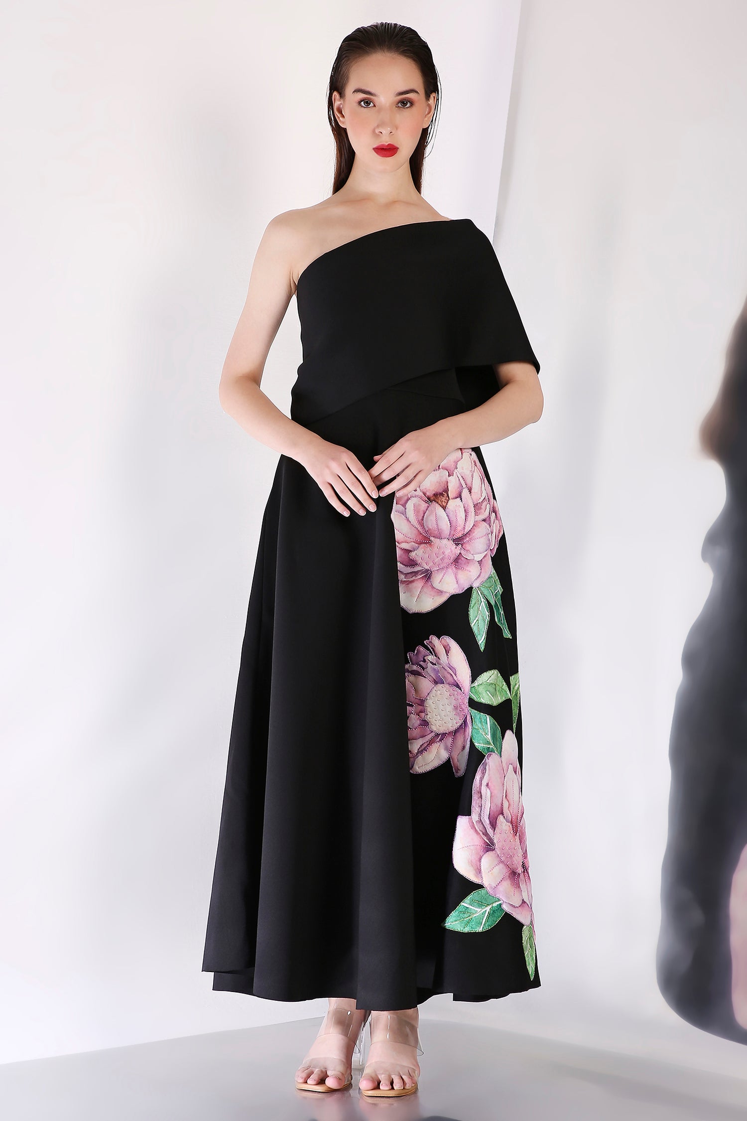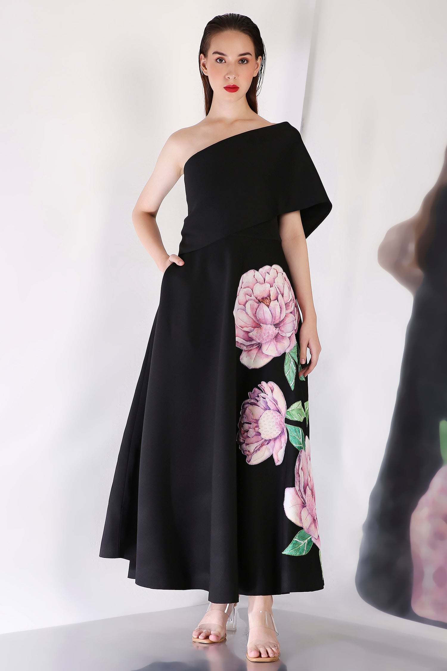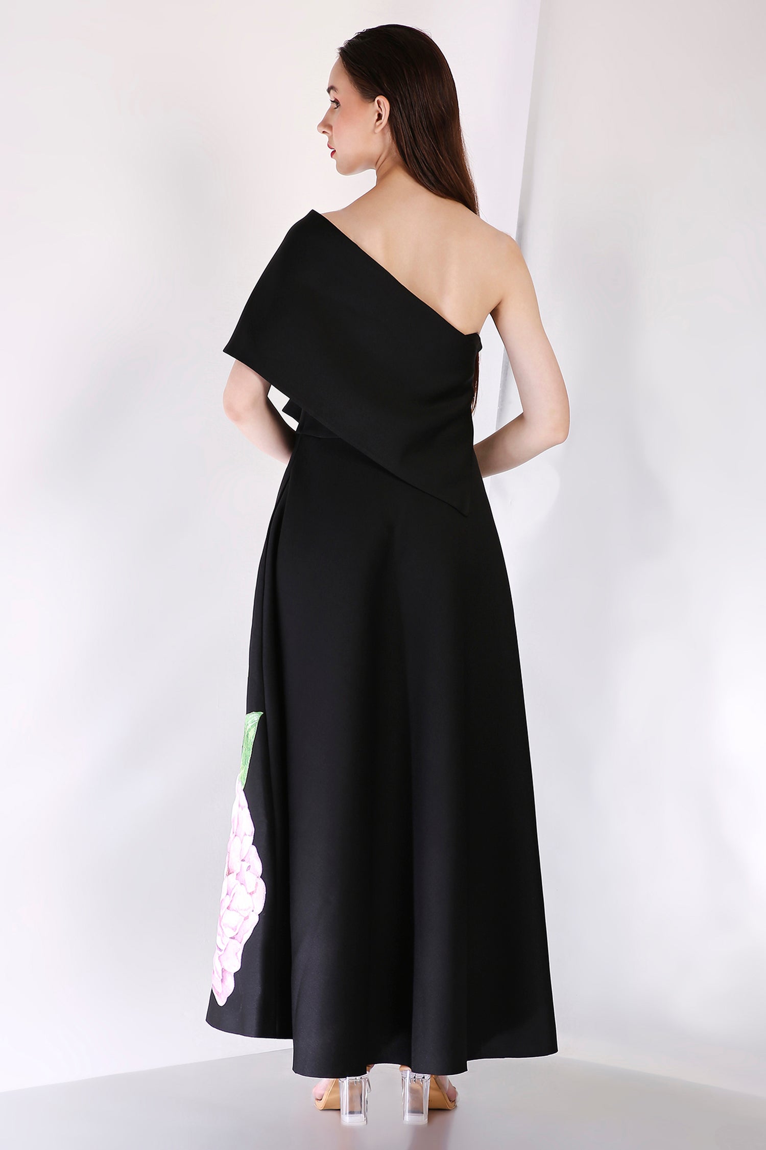 Discover the Nyra dress—a mid-calf silhouette adorned with a stunning lavender floral placement print. This elegant design is complemented by a versatile wrap that can be styled one-shoulder or off-shoulder, effortlessly combining sophistication and charm for any special occasion.