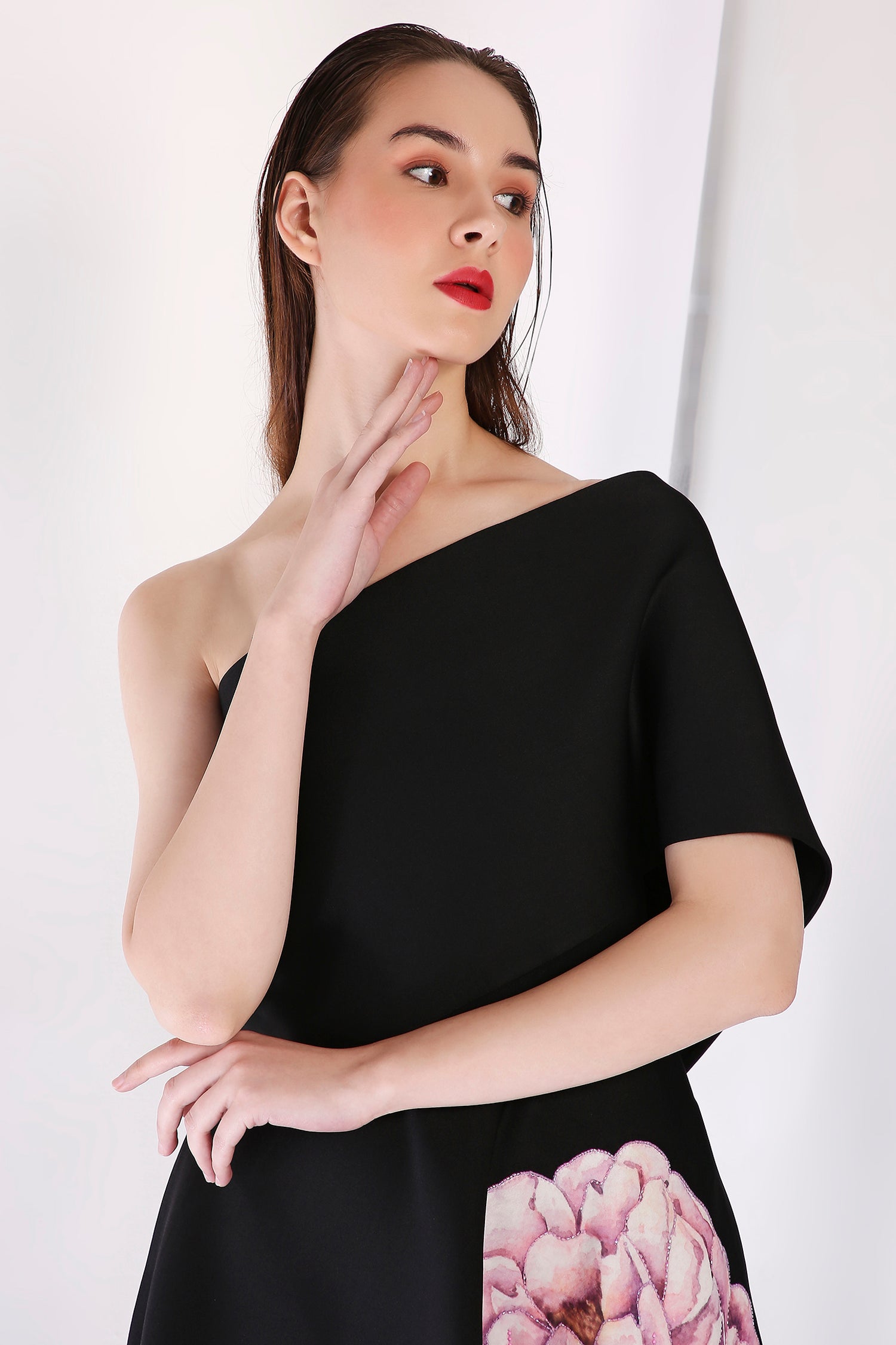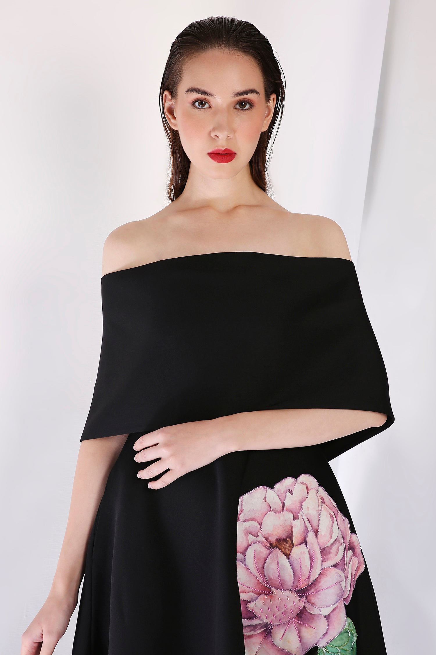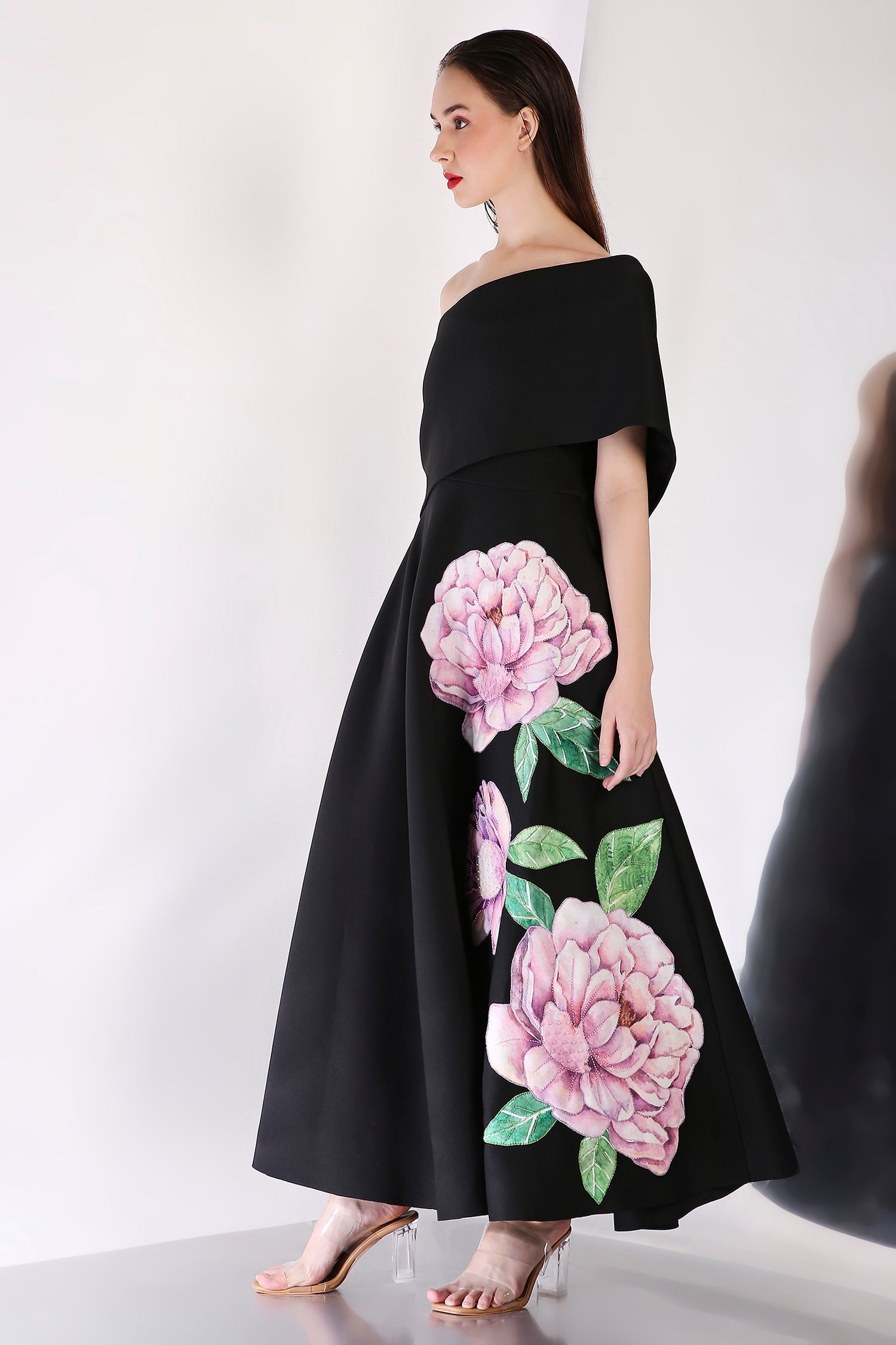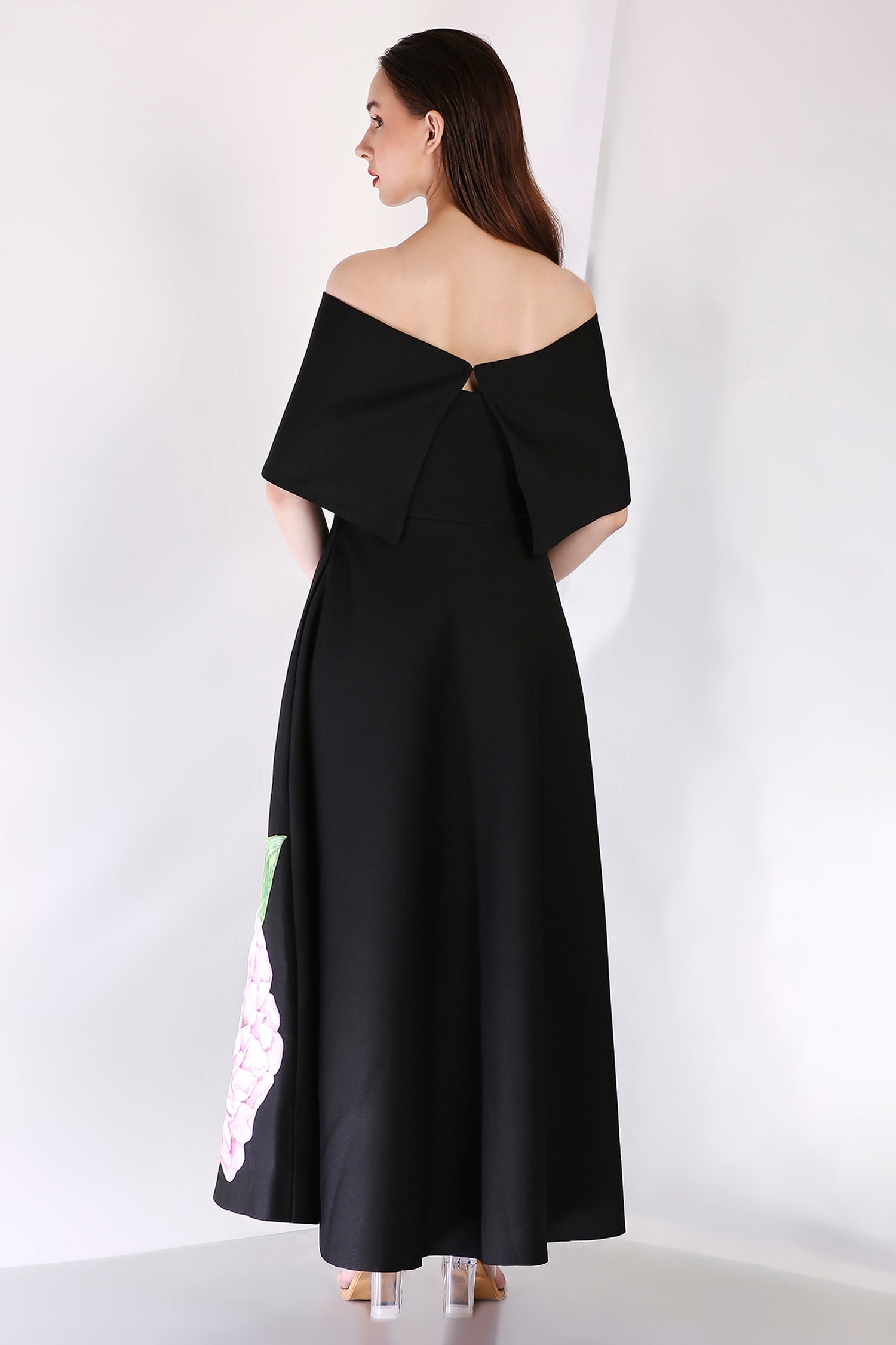 Discover the Nyra dress—a mid-calf silhouette adorned with a stunning lavender floral placement print. This elegant design is complemented by a versatile wrap that can be styled one-shoulder or off-shoulder, effortlessly combining sophistication and charm for any special occasion.