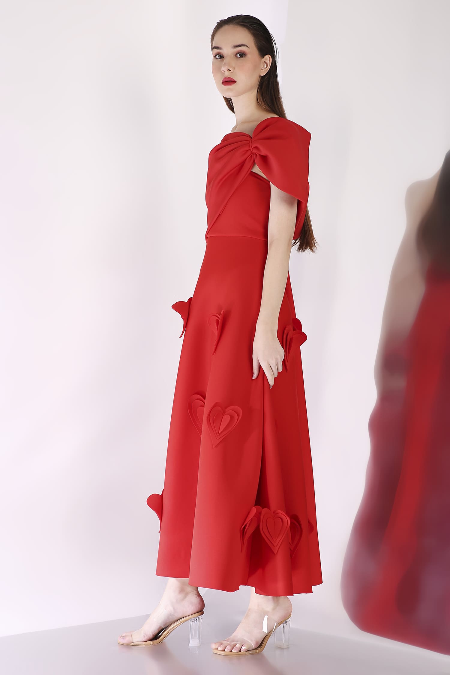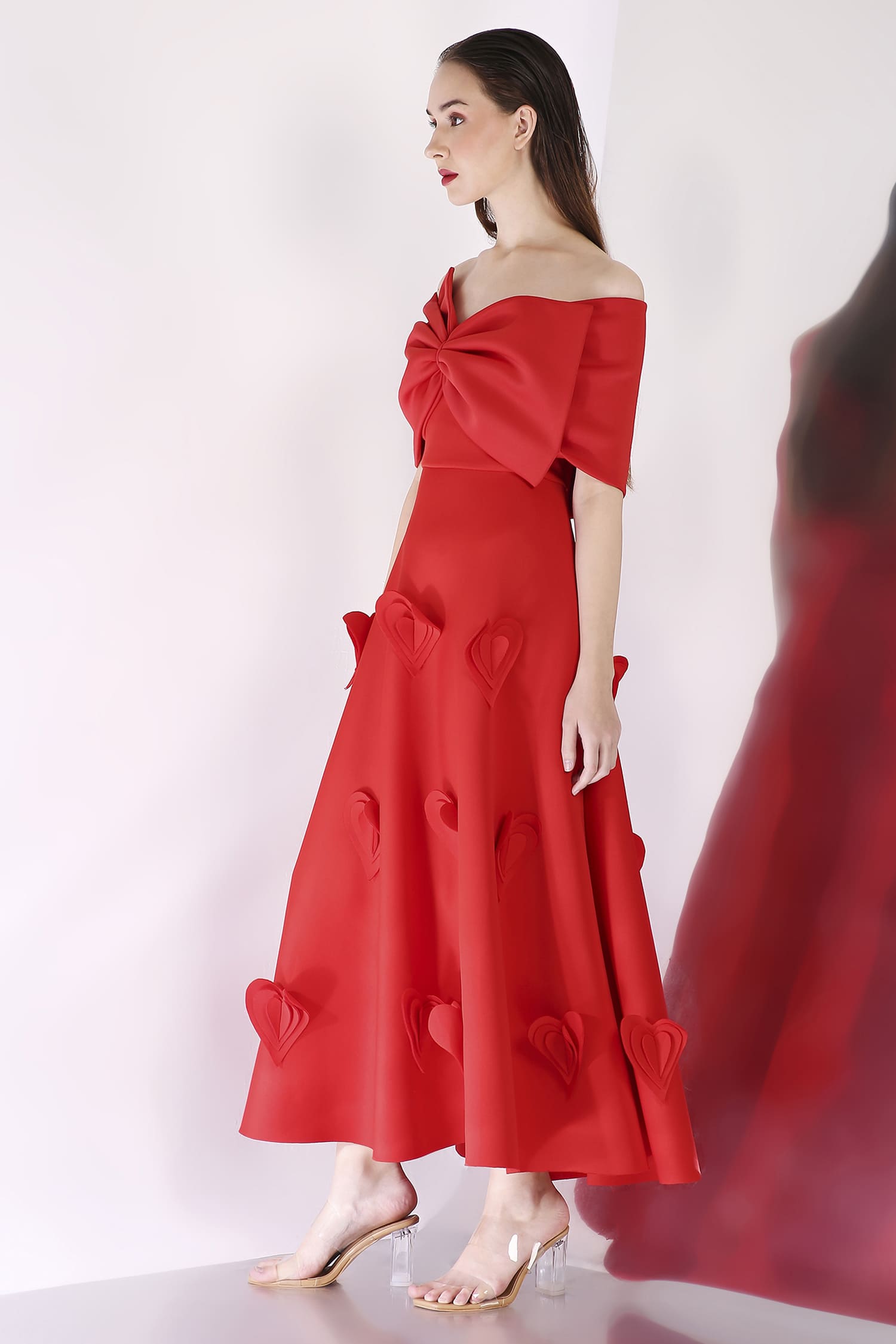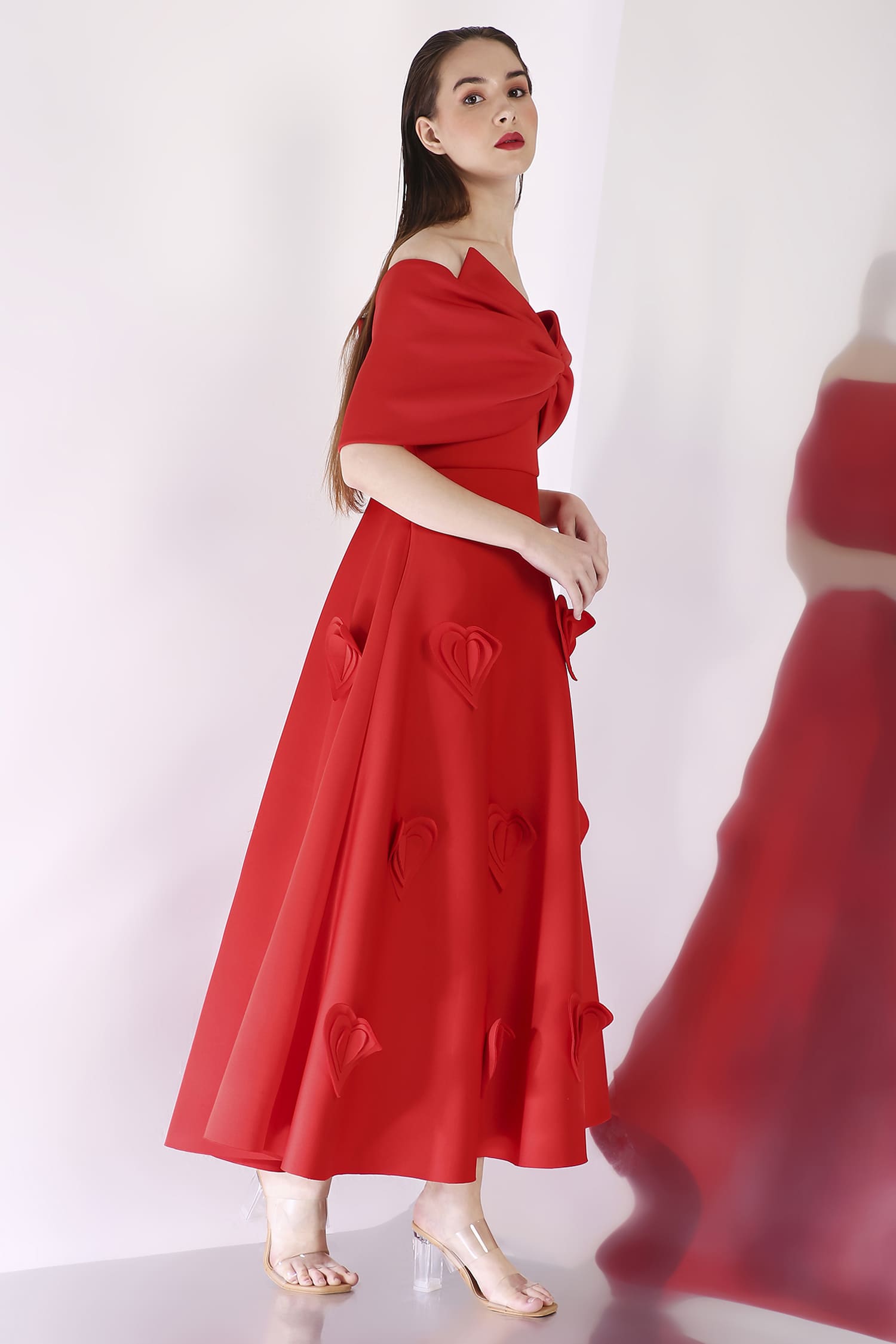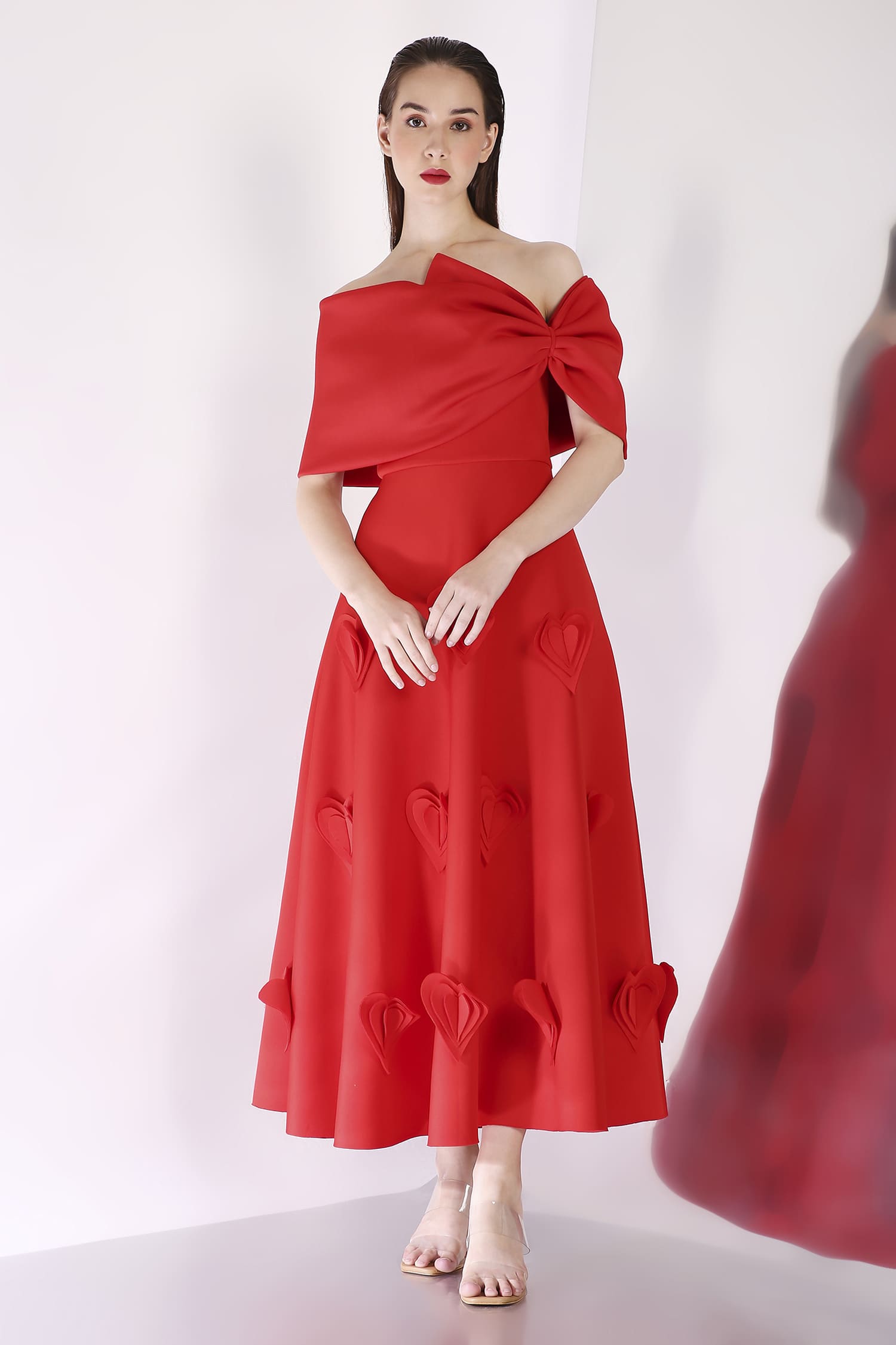 A mid-calf dress featuring heart-shaped 3D appliqués for a textured, romantic look, with a versatile bow wrap that can be styled one-shoulder or off-shoulder, and placed at the center, side, or back for a customizable touch.
