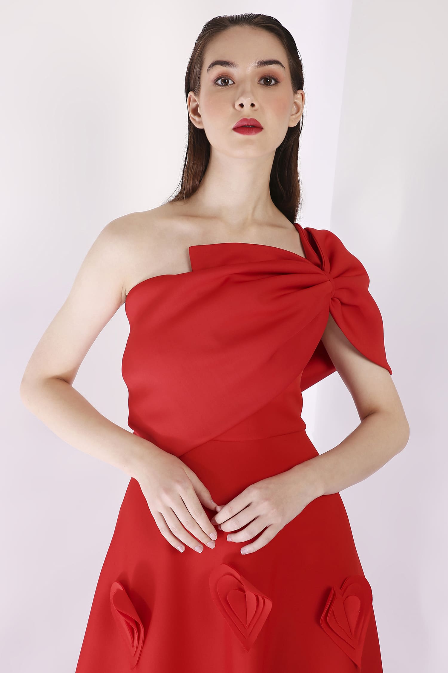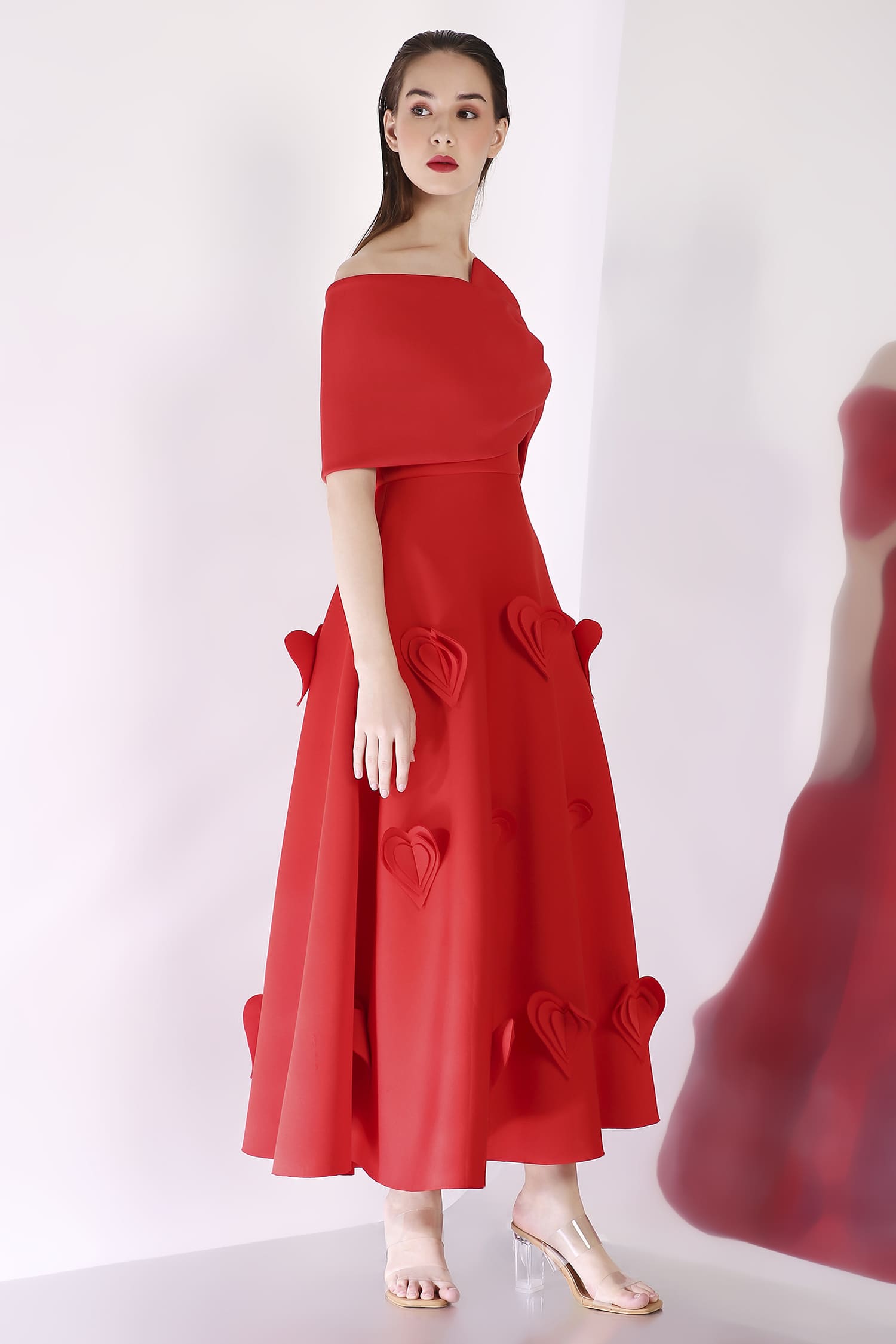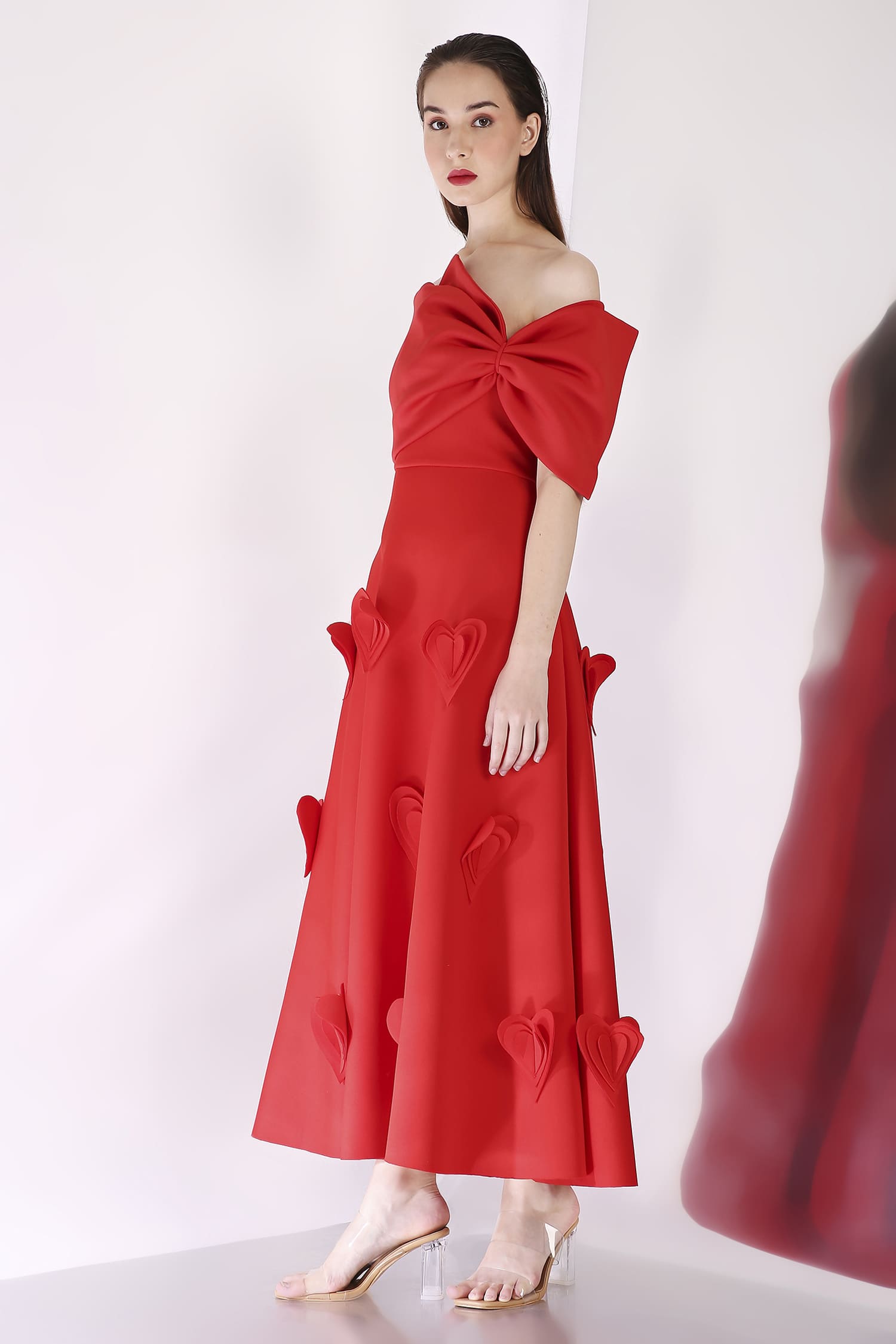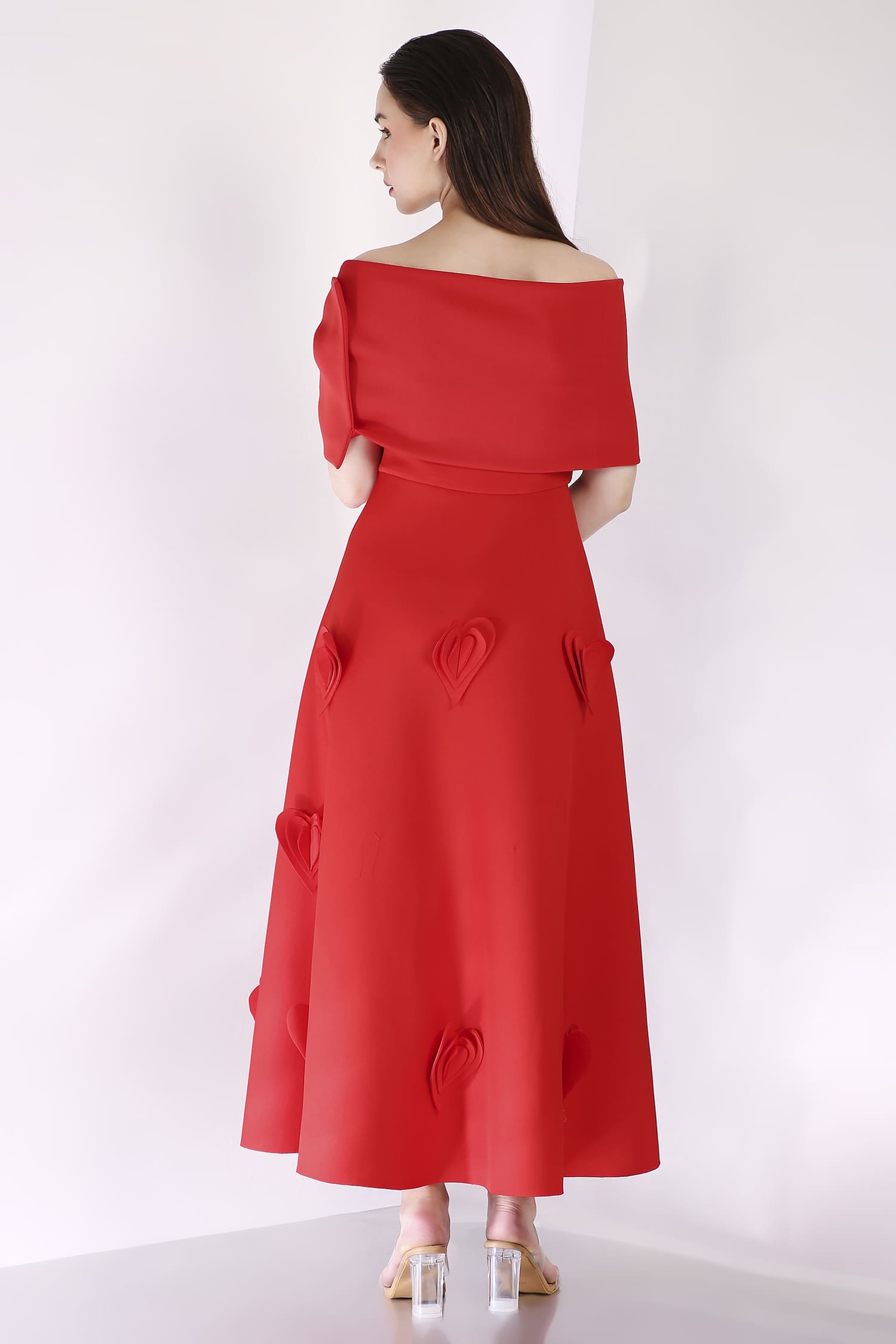 A mid-calf dress featuring heart-shaped 3D appliqués for a textured, romantic look, with a versatile bow wrap that can be styled one-shoulder or off-shoulder, and placed at the center, side, or back for a customizable touch.