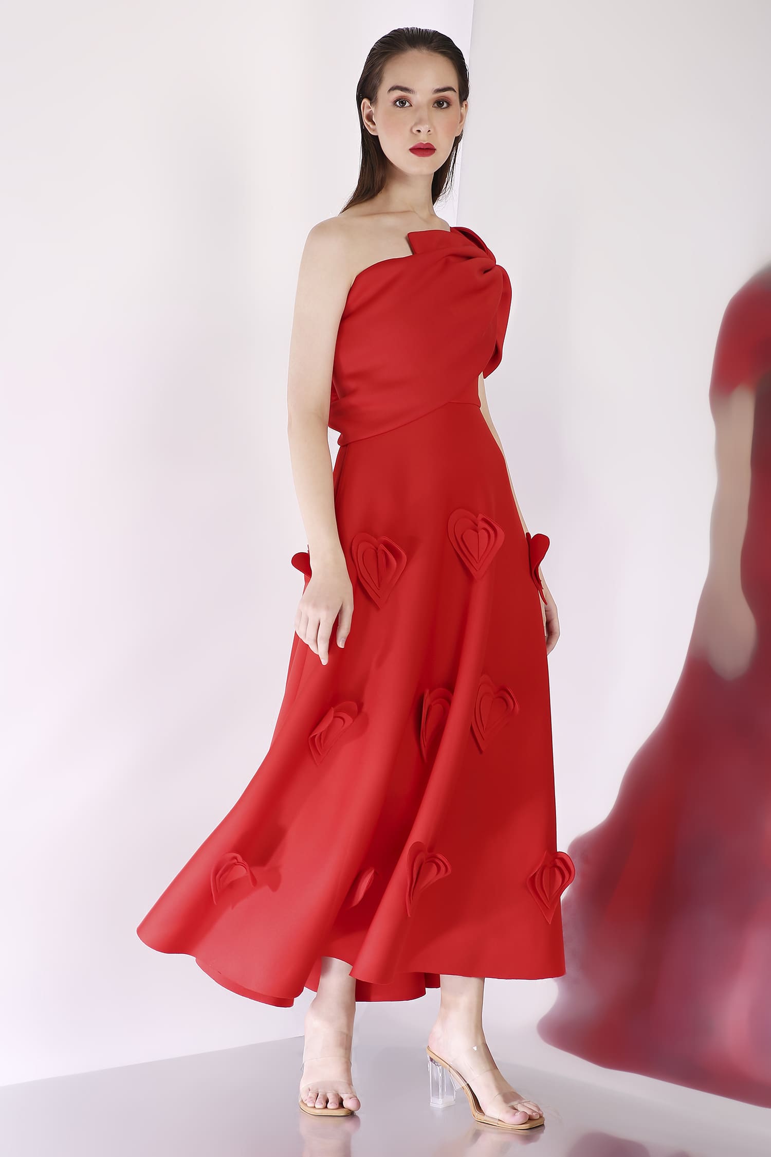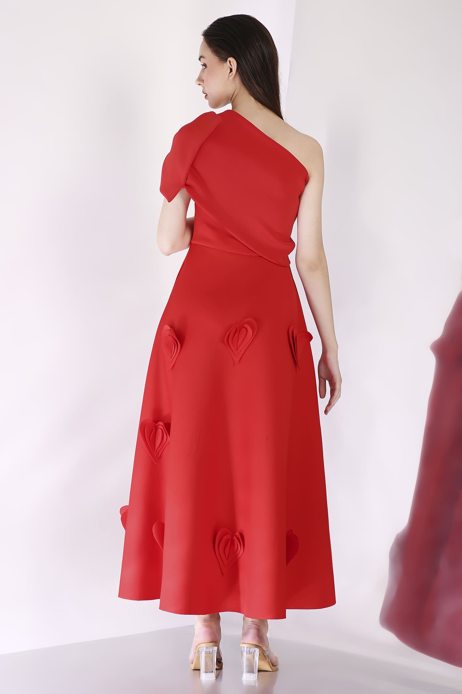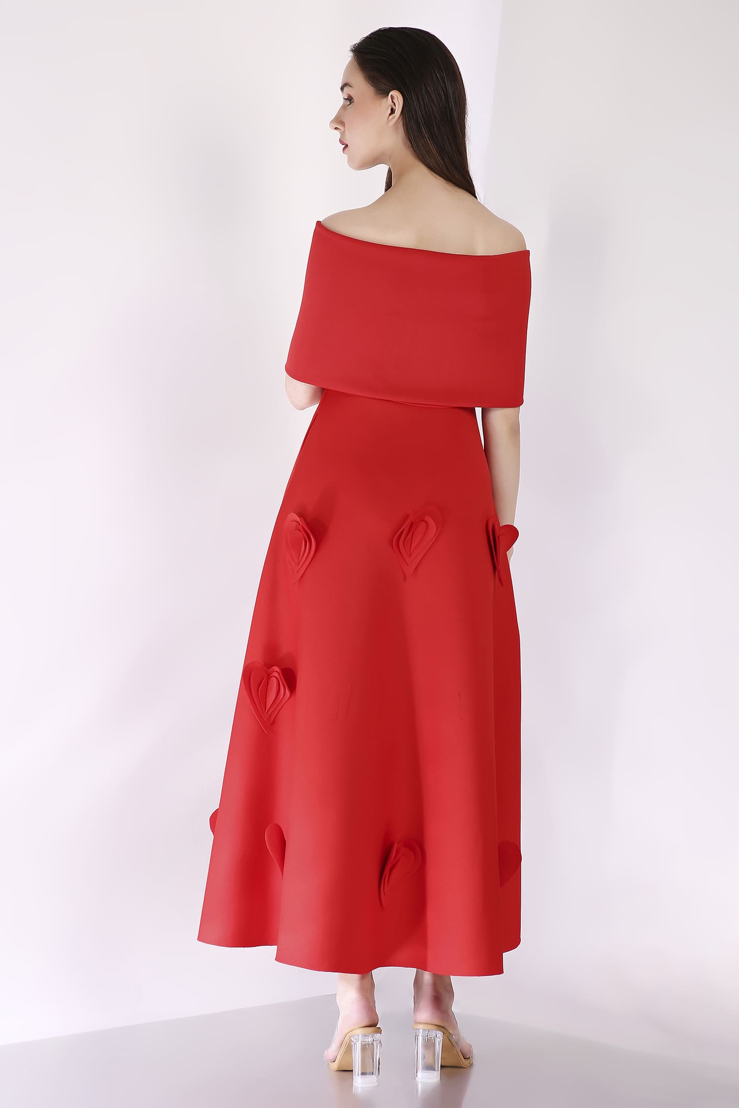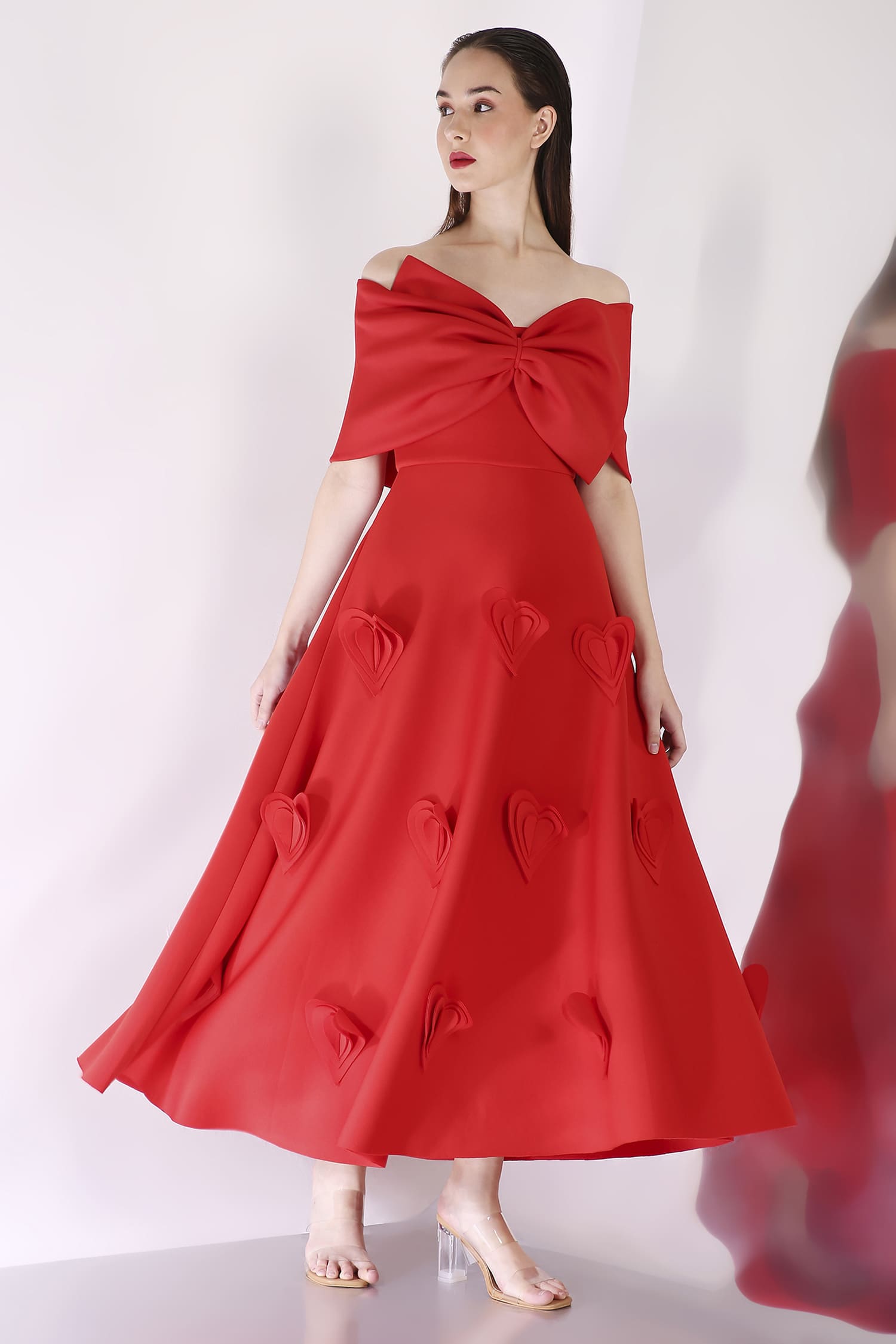 A mid-calf dress featuring heart-shaped 3D appliqués for a textured, romantic look, with a versatile bow wrap that can be styled one-shoulder or off-shoulder, and placed at the center, side, or back for a customizable touch.
