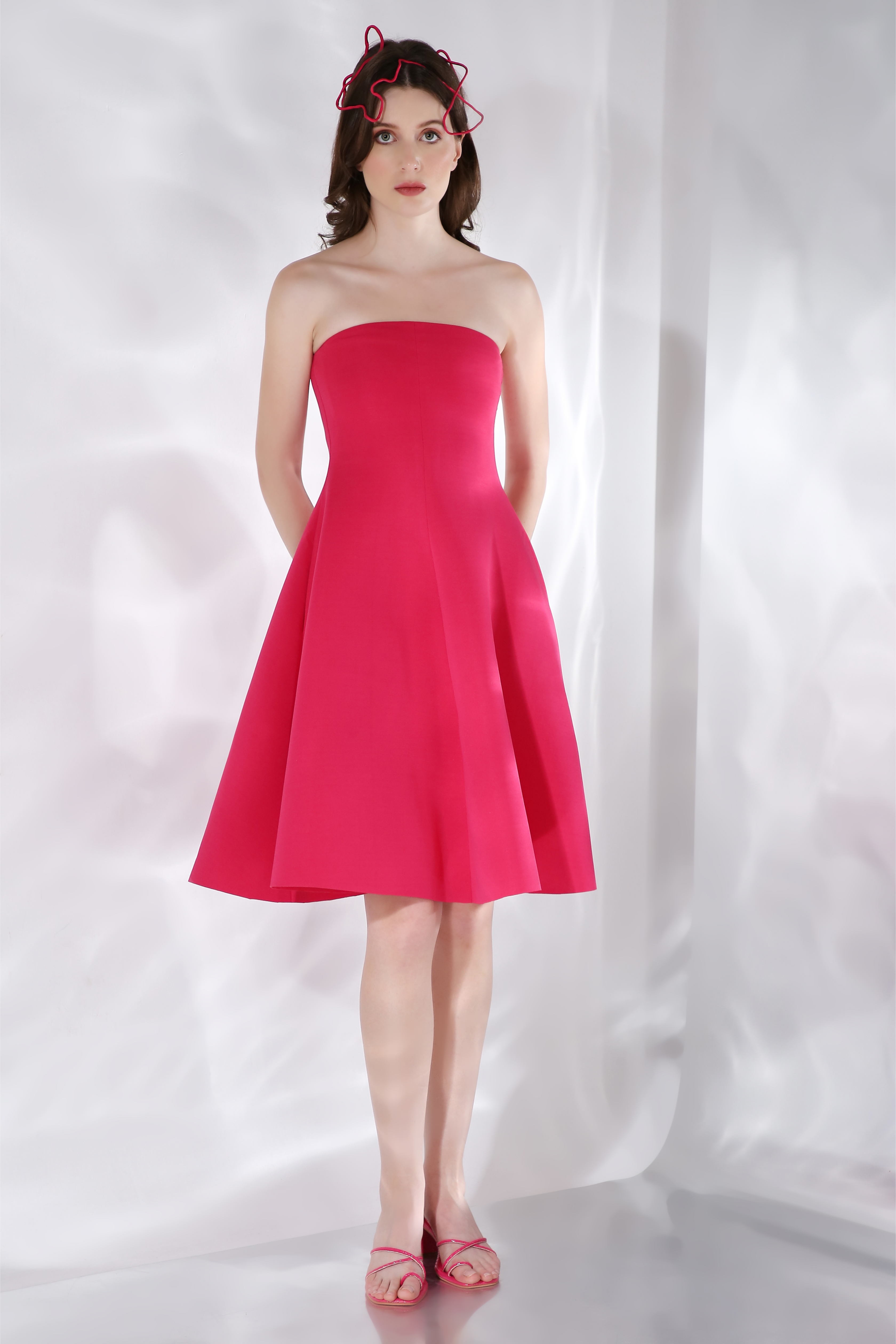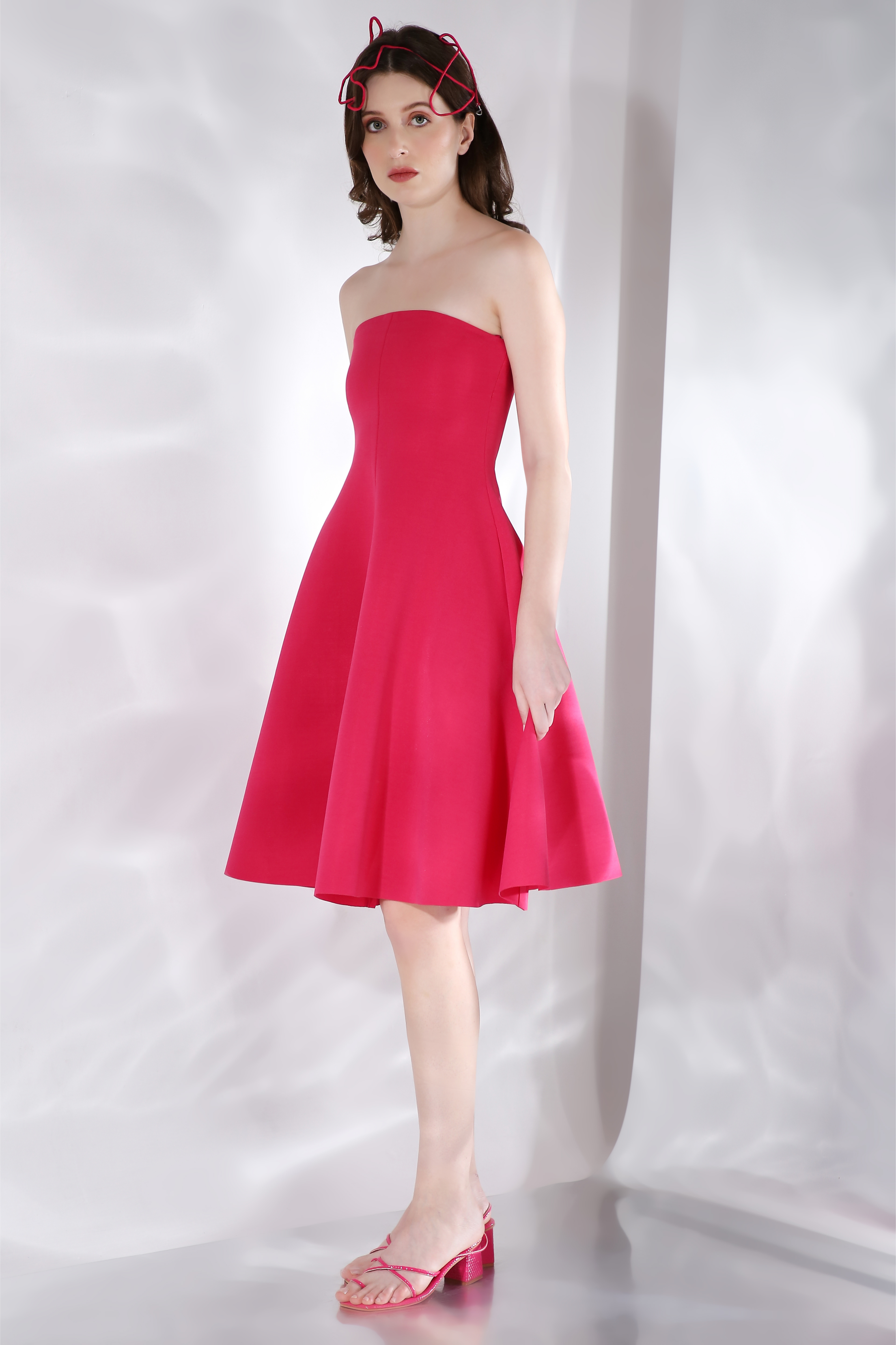 Featuring Malaika in a strapless dress with a structured flare.