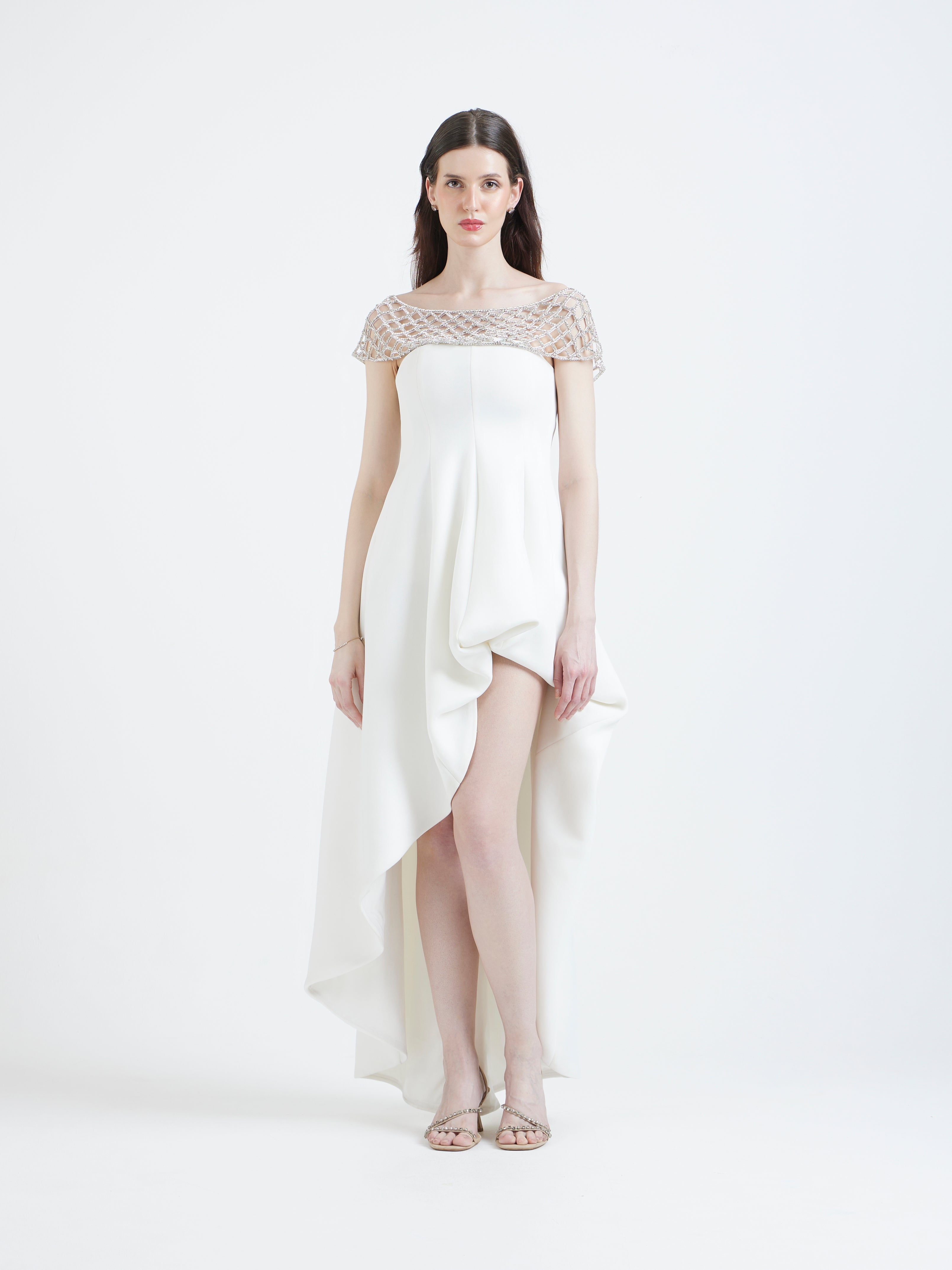 The curved front drape and extended back create a graceful silhouette that feels feminine, fluid, and elevated. Perfect for cocktail nights, bridal occasions, and intimate celebrations where subtle glamour makes the statement.