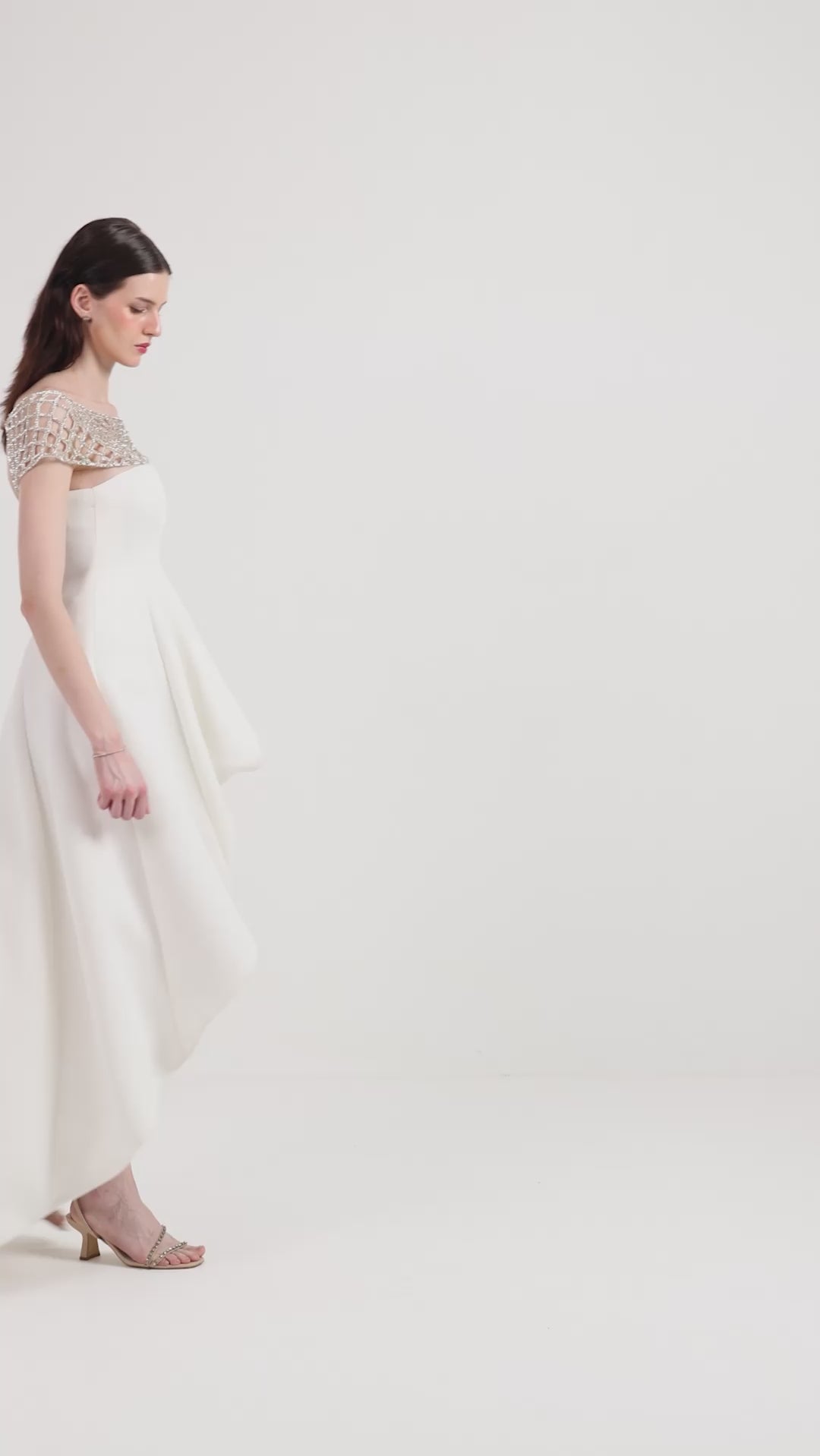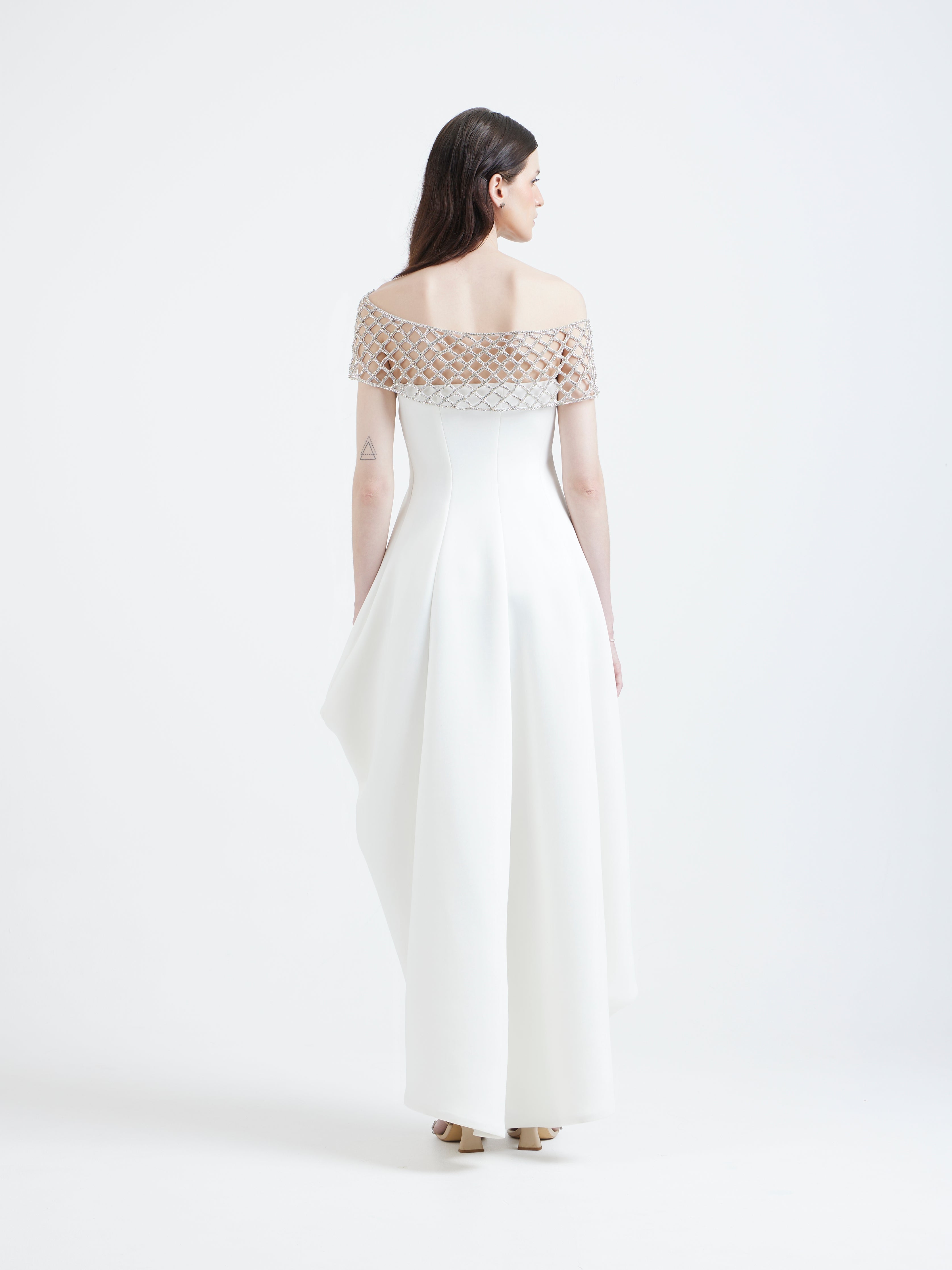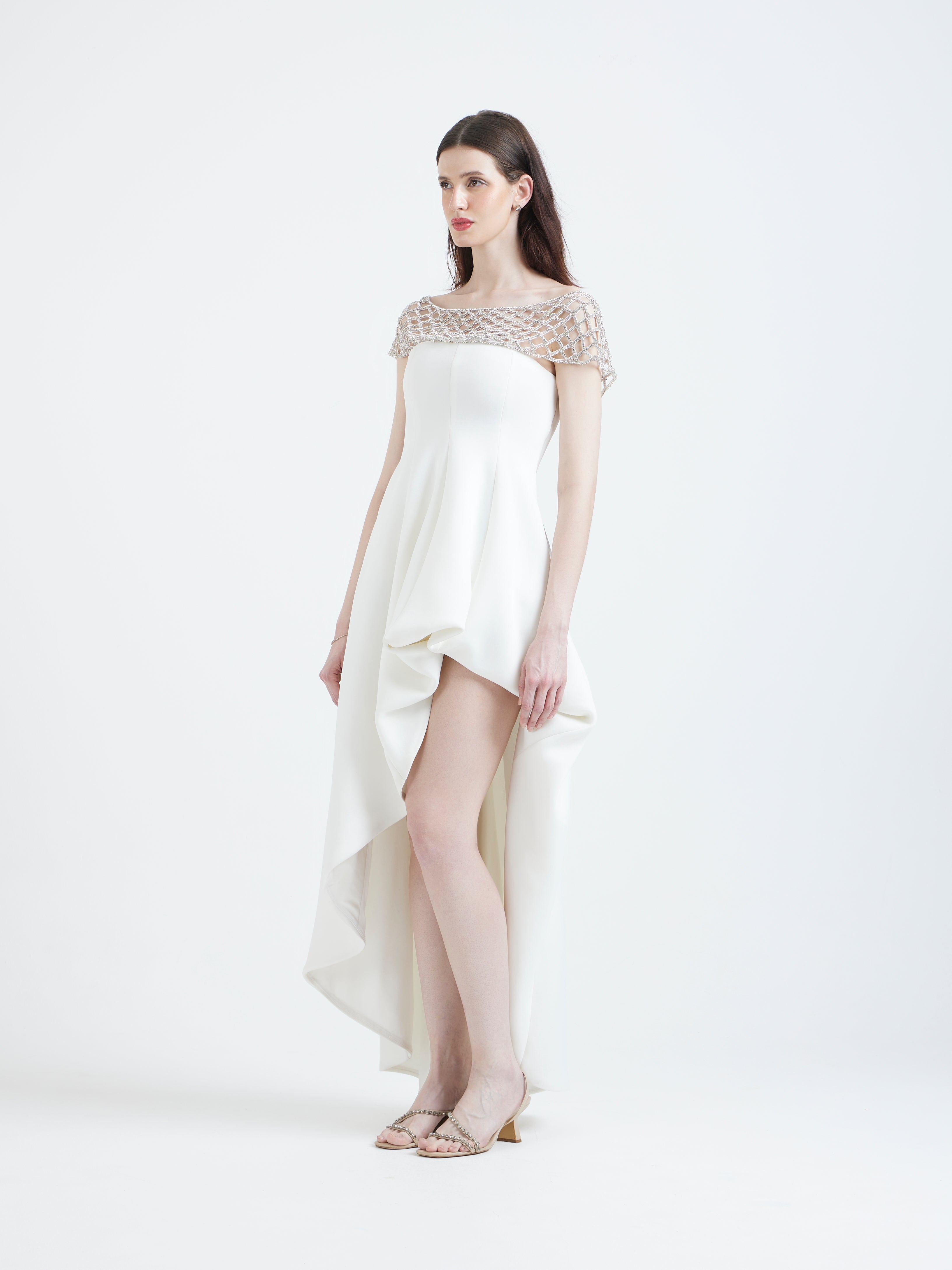 A high–low dress designed with soft movement and an effortless, structured fall. The highlight of the piece is the detachable hand-embellished jaal wrap adding light-catching detail and a modern touch of artistry.