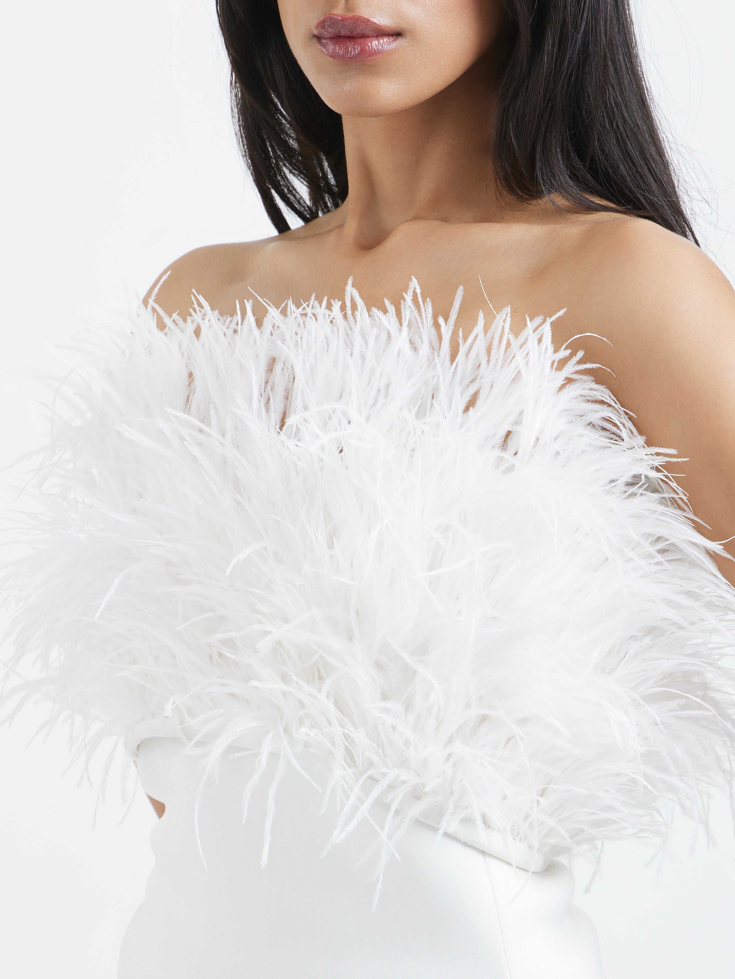 A sculpted scuba skirt and top set elevated with a dramatic, detachable feather tube wrap that adds instant couture softness. The clean, wave-hem mini skirt pairs with a sleek structured base, allowing the detachable feather wrap to take center stage.